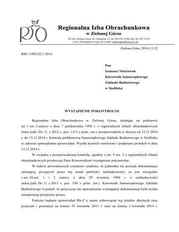 Regionalna Izba Obrachunkowa w Zielonej Górze 65-261 Zielona Góra, ul. Chmielna 13; tel. 68 329 19 00; fax: 68 329 19 03 www.zielonagora.rio.gov.pl e-mail: [email protected] Zielona Góra, 2014.12.22 RIO. I.092.82.1.2014 Pan Ireneusz Nieścioruk Kierownik Samorządowego Zakładu Budżetowego w Siedlisku WYSTĄPIENIE POKONTROLNE Regionalna Izba Obrachunkowa w Zielonej Górze, działając na podstawie art. 1 ust. 2 ustawy z dnia 7 października 1992 r. o regionalnych izbach obrachunkowych (tekst jedn. Dz. U. z 2012 r., poz. 1113 z późn. zm.), przeprowadziła w okresie od 12.11.2014 r. do 13.11.2014 r. kontrolę problemową Samorządowego Zakładu Budżetowego w Siedlisku w zakresie sporządzania sprawozdań. Wyniki kontroli omówiono i podpisano protokół w dniu 13.11.2014 r. W związku z przeprowadzoną kontrolą, zgodnie z art. 9 ust. 2 o regionalnych izbach obrachunkowych przekazuję Panu Kierownikowi wystąpienie pokontrolne. W trakcie prowadzonych czynności ustalono, że jednostka nie posiada dokumentacji opisującej przyjętych przez nią zasad (polityki) rachunkowości, co jest niezgodne z art. 10 ust. 1 i 2 ustawy z dnia 29 września 1994 r. o rachunkowości (tekst jedn. Dz. U. z 2013 r. poz. 330 z późn. zm.). Kierownik Samorządowego Zakładu Budżetowego wyjaśnił, że przyczyną nie sporządzenia wymaganej dokumentacji była mylna interpretacja przepisów prawa. Podczas badania sprawozdań Rb-Z o stanie zobowiązań wg tytułów dłużnych oraz poręczeń i gwarancji na koniec IV kwartału 2013 r. oraz na koniec I kwartału 2014 r. stwierdzono, że ww. sprawozdania sporządzone zostały niezgodnie ze wzorem określonym w załączniku Nr 1 do rozporządzenia Ministra Finansów z dnia 4 marca 2010 r. w sprawie sprawozdań jednostek sektora finansów publicznych w zakresie operacji finansowych (Dz. U. z 2010 r. Nr 43, poz. 247 z późn. zm.). Z wyjaśnień złożonych przez Kierownika Zakładu wynika, że przyczyną złożenia sprawozdań na druku niezgodnym ze wzorem stanowiącym załącznik Nr 1 do rozporządzenia było przeoczenie. W toku kontroli stwierdzono rozbieżności dotyczące wielkości zobowiązań wymagalnych wykazanych przez Samorządowy Zakład Budżetowy w sprawozdaniach Rb-Z o stanie zobowiązań wg tytułów dłużnych oraz poręczeń i gwarancji oraz w sprawozdaniu Rb-30S z wykonania planów finansowych samorządowych zakładów budżetowych. I tak w sprawozdaniu Rb-Z na koniec IV kwartału 2013 r. zobowiązania wymagalne wykazano w kwocie 12.369,85 zł, natomiast w sprawozdaniu Rb-30S za I kwartał 2014 r. zobowiązania wymagalne Zakładu na początek okresu sprawozdawczego wynoszą 100.087,23 zł. Kontrolującemu nie przedstawiono ewidencji księgowej, na podstawie której sporządzone zostały ww. sprawozdania. W związku z powyższym zażądano wyjaśnień od K.W. Głównej księgowej oraz Kierownika Zakładu. Z wyjaśnień wynika, że przyczyną nieprawidłowości była pomyłka i awaria komputera głównego księgowego. Po zakupie nowego komputera i odzyskaniu przez informatyka danych z komputera, który uległ awarii, usunięto nieprawidłowości w ewidencji i sporządzono odpowiednie korekty sprawozdań. Wykazanie nieprawidłowych kwot zobowiązań wymagalnych w ww. sprawozdaniach Rb-Z i Rb-30S jest niezgodne z § 10 ust. 4 rozporządzenia Ministra Finansów w sprawie sprawozdań jednostek sektora finansów publicznych w zakresie operacji finansowych oraz § 9 ust. 1 rozporządzenia Ministra Finansów z dnia 16 stycznia 2014 r. w sprawie sprawozdawczości budżetowej ( Dz. U. poz. 119). Przedstawiając powyższe uwagi, na podstawie art. 9 ust. 2 ustawy o regionalnych izbach obrachunkowych wnoszę o: 1. Ustalenie dokumentacji opisującej przyjęte zasady ( politykę ) rachunkowości, zgodnie z art. 10 ust. 1 i 2 ustawy z dnia 29 września 1994 r. o rachunkowości (tekst jedn. Dz. U. z 2013 r. poz. 330 z późn. zm.). 2. Sporządzanie sprawozdań Rb-Z o stanie zobowiązań wg tytułów dłużnych oraz poręczeń i gwarancji wg wzoru określonego w rozporządzeniu Ministra Finansów z dnia 4 marca 2010 r. w sprawie sprawozdań jednostek sektora finansów publicznych w zakresie operacji finansowych (Dz. U. z 2010 r. Nr 43, poz. 247 z późn. zm.). 2 3. Sporządzanie sprawozdań Rb-Z oraz Rb-30S rzetelnie i prawidłowo pod względem merytorycznym i formalno-rachunkowym stosownie do postanowień § 10 ust. 4 rozporządzenia Ministra Finansów z dnia 4 marca 2010 r. w sprawie sprawozdań jednostek sektora finansów publicznych w zakresie operacji finansowych (Dz. U. z 2010 r. Nr 43, poz. 247 z późn. zm.) oraz § 9 ust. 1 rozporządzenia Ministra Finansów z dnia 16 stycznia 2014 r. w sprawie sprawozdawczości budżetowej (Dz. U. z 2014 r. poz. 119). Zgodnie z art. 9 ust. 3 i 4 ustawy o regionalnych izbach obrachunkowych, do wniosków zawartych w wystąpieniu pokontrolnym przysługuje prawo zgłoszenia zastrzeżenia do Kolegium Izby. Informację o wykonaniu wniosków pokontrolnych lub przyczynach ich niewykonania, proszę przekazać Regionalnej Izbie Obrachunkowej w Zielonej Górze, w terminie 30 dni od dnia otrzymania niniejszego wystąpienia pokontrolnego. Prezes Izby /-/ Ryszard Zajączkowski Do wiadomości: 1. Rada Gminy Siedlisko, 2. Wójt Gminy Siedlisko. 3