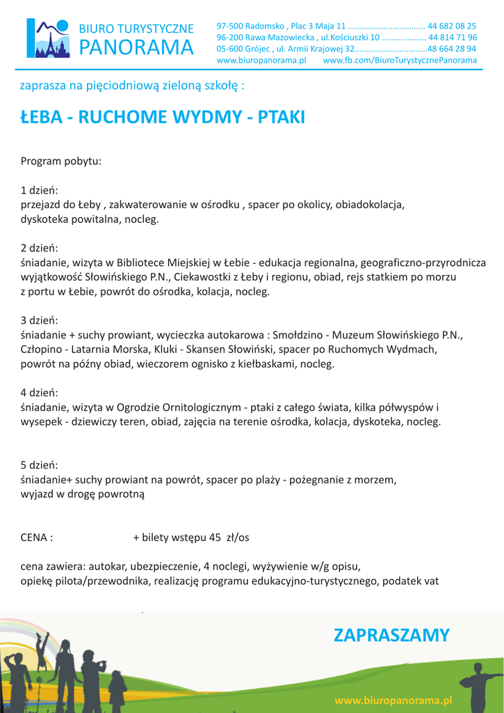 BIURO TURYSTYCZNE PANORAMA 97-500 Radomsko , Plac 3 Maja 11 ................................. 44 682 08 25 96-200 Rawa Mazowiecka , ul.Koœciuszki 10 ................... 44 814 71 96 05-600 Grójec , ul. Armii Krajowej 32...............................48 664 28 94 www.biuropanorama.pl www.fb.com/BiuroTurystycznePanorama zaprasza na piêciodniow¹ zielon¹ szko³ê : £EBA - RUCHOME WYDMY - PTAKI Program pobytu: 1 dzieñ: przejazd do £eby , zakwaterowanie w oœrodku , spacer po okolicy, obiadokolacja, dyskoteka powitalna, nocleg. 2 dzieñ: œniadanie, wizyta w Bibliotece Miejskiej w £ebie - edukacja regionalna, geograficzno-przyrodnicza wyj¹tkowoœæ S³owiñskiego P.N., Ciekawostki z £eby i regionu, obiad, rejs statkiem po morzu z portu w £ebie, powrót do oœrodka, kolacja, nocleg. 3 dzieñ: œniadanie + suchy prowiant, wycieczka autokarowa : Smo³dzino - Muzeum S³owiñskiego P.N., Cz³opino - Latarnia Morska, Kluki - Skansen S³owiñski, spacer po Ruchomych Wydmach, powrót na póŸny obiad, wieczorem ognisko z kie³baskami, nocleg. 4 dzieñ: œniadanie, wizyta w Ogrodzie Ornitologicznym - ptaki z ca³ego œwiata, kilka pó³wyspów i wysepek - dziewiczy teren, obiad, zajêcia na terenie oœrodka, kolacja, dyskoteka, nocleg. 5 dzieñ: œniadanie+ suchy prowiant na powrót, spacer po pla¿y - po¿egnanie z morzem, wyjazd w drogê powrotn¹ CENA : + bilety wstêpu 45 z³/os cena zawiera: autokar, ubezpieczenie, 4 noclegi, wy¿ywienie w/g opisu, opiekê pilota/przewodnika, realizacjê programu edukacyjno-turystycznego, podatek vat ZAPRASZAMY www.biuropanorama.pl