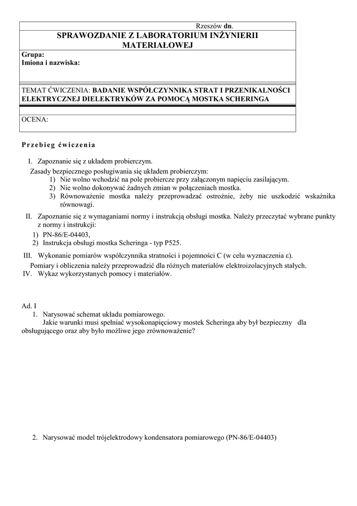 Rzeszów dn. SPRAWOZDANIE Z LABORATORIUM INśYNIERII MATERIAŁOWEJ Grupa: Imiona i nazwiska: TEMAT ĆWICZENIA: BADANIE WSPÓŁCZYNNIKA STRAT I PRZENIKALNOŚCI ELEKTRYCZNEJ DIELEKTRYKÓW ZA POMOCĄ MOSTKA SCHERINGA OCENA: Przebieg ćwiczenia I. Zapoznanie się z układem probierczym. Zasady bezpiecznego posługiwania się układem probierczym: 1) Nie wolno wchodzić na pole probiercze przy załączonym napięciu zasilającym. 2) Nie wolno dokonywać Ŝadnych zmian w połączeniach mostka. 3) RównowaŜenie mostka naleŜy przeprowadzać ostroŜnie, Ŝeby nie uszkodzić wskaźnika równowagi. II. Zapoznanie się z wymaganiami normy i instrukcją obsługi mostka. NaleŜy przeczytać wybrane punkty z normy i instrukcji: 1) PN-86/E-04403, 2) Instrukcja obsługi mostka Scheringa - typ P525. III. Wykonanie pomiarów współczynnika stratności i pojemności C (w celu wyznaczenia ε). Pomiary i obliczenia naleŜy przeprowadzić dla róŜnych materiałów elektroizolacyjnych stałych. IV. Wykaz wykorzystanych pomocy i materiałów. Ad. I 1. Narysować schemat układu pomiarowego. Jakie warunki musi spełniać wysokonapięciowy mostek Scheringa aby był bezpieczny dla obsługującego oraz aby było moŜliwe jego zrównowaŜenie? 2. Narysować model trójelektrodowy kondensatora pomiarowego (PN-86/E-04403) Ad. III 1. Narysować wykres wskazowy (PN-86/E-04403) z zaznaczeniem kąta strat elektrycznych dielektryka 2. Definicja przenikalności elektrycznej i współczynnika strat dielektryka a) b) 3. Wykonanie pomiarów i obliczeń: Rozmieszczenie elektrod na próbkach (elektrody okrągłe): a=................................... d=........................................ g=................................... B= a) Próbka nr 1 …………………………………… h=…………. R3=………... tgδ=……….. C0=…………………………… Cx=……………………………. ε=…………………….. b) Próbka nr 2 ……………………………………… h=…………. R3=………... tgδ=……….. C0=…………………………… Cx=……………………………. ε=…………………….. c) Próbka nr 3 ……………………………………… h=…………. R3=………... tgδ=……….. C0=…………………………… Cx=……………………………. ε=…………………….. d) Próbka nr 4 ……………………………………… h=…………. R3=………... tgδ=……….. C0=…………………………… Cx=……………………………. ε=…………………….. 4. Odczytać z tablic (Własności dielektryków. Antoniewicz) wartości tgδ i ε dla badanych materiałów i porównać je z uzyskanymi z pomiarów. Badana próbka 1………………………………………….. ε z pomiarów ε z tablic tgδz pomiarów tgδ z tablic 2………………………………………….. 3………………………………………….. 4………………………………………….. 5. Przedstawić wnioski i spostrzeŜenia z pomiarów oraz z porównania wartości parametrów.