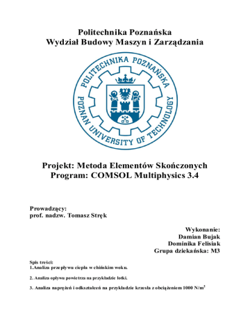 Politechnika Poznańska Wydział Budowy Maszyn i Zarządzania Projekt: Metoda Elementów Skończonych Program: COMSOL Multiphysics 3.4 Prowadzący: prof. nadzw. Tomasz Stręk Wykonanie: Damian Bujak Dominika Felisiak Grupa dziekańska: M3 Spis treści: 1.Analiza prze pływu ciepła w chińskim woku. 2. Analiza opływu powietrza na przykładzie lotki. 3. Analiza naprężeń i odkształceń na przykładzie krzesła z obciążeniem 1000 N/m2 1. Analiza przepływu ciepła w chińskim woku. Opis modelu Modelem w tej części projektu będzie chiński wok. Jest to naczynie przypominające miskę z jedną lub dwiema rączkami, służące do smażenia w ruchu, szybkiego przyrządzania potraw na ogniu, przeważnie wykorzystywane w kuchni chińskiej. Pozwala na bardzo wydajną obróbkę cieplną. Współcześnie woki mają często lekko spłaszczone dno, w celu dostosowania do pracy na kuchenkach indukcyjnych. Standardowy wok ma około 30-40 cm średnicy i jest wykonany ze stali węglowej. Rączka patelni wykonana jest z drewna. Analiza modelu Warunkami obciążenia jest podgrzewanie woku od spodu płomieniem palnika kuchenki gazowej lub indukcyjnej. Zbadamy przewodzenie ciepła przez to naczynie. Będziemy sprawdzać czy po upływie 300 sekund dno woku będzie nagrzane do temperatury 150°C. Przyjmujemy, że dno patelni podgrzewane jest przy pomocy palnika gazowego, którego będzie posiadało odpowiednią temperaturę do smażenia i sprawdzimy również jaka temperatura będzie występowała na obrzeżach woku. Sprawdzimy również czy rączka nie będzie zbyt mocno się nagrzewać. Do analizy wykorzystano moduł przewodzenia ciepła w 3D przedstawiający proces w funkcji czasu. Poniższą analizę przepływu ciepła przeprowadzono z użyciem równania przewodnictwa ciepła. Określenie stałych materiałowych Powierzchnia podgrzewana do temp. 150°C Temperatura pozostałych elementów patelni Ustawienie czasu analizy zagadnienia Model woku z naniesioną siatką – liczba elementów 10531. Uzyskane wyniki z analizy a) Rozkład temperatury po 5 min b) Rozkład temperatury po 20 min Wnioski : Jak widać na przestawionych wynikach, rączki woku spełniają swoją funkcje i utrzymują temperaturę umożliwiającą bezpieczny chwyt (bez oparzenia). Dno i brzegi woku również utrzymują odpowiednią temperaturę by móc przyrządzać potrawy kulinarne. 2. Analiza opływu powietrza na przykładzie lotki. Przedmiotem badań jest lotka. Naszym celem będzie zbadanie opływowości lotki podczas lotu. W celu dokonania analizy przepływu powietrza wokół lecącej lotki zastosowaliśmy moduł Fluid Dynamics programu Comsol Multiphysics. - Model lotki: - Umieszczenie zamodelowanej lotki w myślowym środowisku (prostokąt) któremu zostały nadane parametry otoczenia: - Wygenerowanie siatki programu: - Parametry czasowe: - Po wprowadzeniu wszystkich potrzebnych parametrów wykonano obliczenia w programie COMSOL Multiphysics 3.4 i uzyskano wyniki przedstawione na poniższym rysunku: Jak widać na zamieszczonych wynikach symulacji, lotka przecinająca powietrze powoduje wzrost prędkości powietrza. Największą prędkość powietrze osiąga przy piórku, które działa jak statecznik w samolocie, zapobiegając rotacji lotki w locie. Za lotką prędkość w powietrzu wynosi w przybliżeniu 0m/s. 3. Analiza naprężeń i odkształceń na przykładzie krzesła z obciążeniem 1000 N/m2 a) Przedstawienie zagadnienia. Celem analizy jest przedstawienie sposobu odkształcania się krzesła pod wpływem obciążenia oraz ukazanie rozkładu panujących w nim wówczas naprężeń. b) Badany element. Badanym elementem jest wcześniej wspomniane krzesło. Wyżej pokazany model został zaprojektowany w programie CATIA. Krzesło jest wykonane z drewna. Podczas przeprowadzanego eksperymentu obciążamy krzesło o całkowitej masie 100kg. c) Analiza modelu Analiza została przeprowadzona w module do badań obciążeń statycznych w 3D. Do analizy wykorzystano równanie Lagrange’a II rzędu. Po zaimportowaniu modelu do programu nadano mu właściwości materiałowe oraz określono warunki brzegowe. Przyjąłem następujące parametry dla drewna: Moduł Younga E=11*109 Pa; Współczynnik Poissona v=0,3 Gęstość p=720 kg/m2 Skonfigurowanie warunków brzegowych (unieruchomienie krzesła w miejscach podpór oraz umiejscowienie obciążenia): Następnie wygenerowano siatkę obliczeniową: Tak wygenerowana siatka została poddana analizie MES. W efekcie otrzymano następujące wyniki: d) Wnioski Po przeprowadzonej analizie komputerowej rozkładu naprężeń i przemieszczeń przy pomocy programu COMSOL MULTIPHYSICS 3.4 dla drewnianego krzesła widzimy, że największe naprężenia występują w miejscu siedziska.
