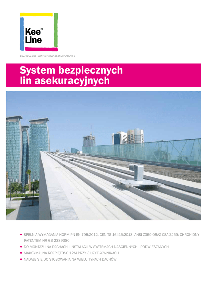 BEZPIECZEŃSTWO NA NAJWYŻSZYM POZIOMIE System bezpiecznych lin asekuracyjnych •SPEŁNIA WYMAGANIA NORM PN-EN 795:2012, CEN TS 16415:2013, ANSI Z359 ORAZ CSA Z259; CHRONIONY PATENTEM NR GB 2389386 •DO MONTAŻU NA DACHACH I INSTALACJI W SYSTEMACH NAŚCIENNYCH I PODWIESZANYCH •MAKSYMALNA ROZPIĘTOŚĆ 12M PRZY 3 UŻYTKOWNIKACH •NADAJE SIĘ DO STOSOWANIA NA WIELU TYPACH DACHÓW Praca na wysokości Przepisy wymagają, by każda osoba pracująca na wysokości posiadała zabezpieczenie przed upadkiem. Ogólnie rzecz biorąc, należy unikać prac na wysokości, w wielu sytuacjach jednak nie da się ich uniknąć. W takim przypadku najlepszym rozwiązaniem jest stosowanie środków ochrony zbiorowej, takich jak balustrady, a w sytuacjach gdy jest to niemożliwe, na przykład z powodu nieodpowiedniego układu budynku lub względów estetycznych, należy zastosować system ochrony indywidualnej. System giętkich poziomych lin kotwiczących to wygodne i niedrogie rozwiązanie do zabezpieczenia pracowników na wysokości, zwłaszcza jeśli prace na dachu prowadzone są sporadycznie. KeeLine® system ochrony przed upadkiem System poziomych lin asekuracyjnych KEELINE został zaprojektowany z myślą o zapewnieniu bezpiecznego dostępu do wszystkich miejsc na dachu: pracownicy są wpięci do systemu lin asekuracyjnych przez cały czas i jednocześnie mogą się swobodnie poruszać po powierzchni dachu. System wykonany jest z lin o grubości 8mm ze stali nierdzewnej klasy 316. Maksymalny rozstaw słupków systemu to 12m. System KEELINE może być wykorzystywany przez 3 użytkowników jednocześnie. System KEELINE wyposażony jest w zintegrowany amortyzator, który w razie upadku minimalizuje obciążenia przyłożone zarówno do użytkownika, jak i budynku. Konstrukcja została opracowana i przetestowana do użytku na różnego rodzaju dachach, np. krytych blachą trapezową czy mocowaną na rąbek stojący, membranowych czy innej konstrukcji nośnej, przy użyciu słupków typu POSTANKA. System KEELINE może być mocowany bezpośrednio do konstrukcji z betonu, stali, cegły lub kamienia. Możliwy jest montaż poziomy, naścienny i górny. KEELINE został przetestowany i spełnia wymagania norm EN795 2012, CEN TS 16415:2013, ANSI Z359 oraz CSA Z259. 2 www.keesafety.pl KeeLine® montaż na dachu System KEELINE wyposażony jest obecnie w zmodyfikowany słupek i podstawę do dachów membranowych. Nowa konstrukcja pozwala na łatwiejszą i szybszą instalację, a przy tym wykorzystuje tę samą gamę uchwytów do dachów krytych dachówką, z rąbkiem stojącym i z blachy profilowanej. Wspornik pionowy do dachów membranowych Wspornik pionowy do dachów pokrytych dachówką Wspornik pionowy do dachów z rąbkiem stojącym Wspornik pionowy do dachów z blachy profilowanej Uchwyty KeeLine® do dachów i konstrukcji Uchwyt pośredni Uchwyt narożny 90° Uchwyt narożny 45° Uchwyt liny montowany na pośrednim wsporniku pionowym. Możliwość realizacji kątów wewnętrznych i zewnętrznych. Możliwość realizacji kątów wewnętrznych i zewnętrznych. www.keesafety.pl 3 Uchwyty KeeLine® przeznaczone tylko do konstrukcji budynku Uchwyt krańcowy Uchwyt narożny LINE-XBRKT CNR-90-W Uniwersalne elementy KeeLine® Amortyzator Lina Średnica 8 mm, budowa 7x7 IWRC, stal nierdzewna klasy 316. Dostępna w szpulach po 1000 m lub cięta na zamówienie. Wózek systemu KeeLine® Wskaźnik naprężenia Używany na początku układu (lub w systemach powyżej 150m – na obu jego końcach). Wskazuje właściwe naprężenie liny. Dostępny ze złączem zagniatanym lub zaciskowym. Używany do zakończenia systemu. Dostępny ze złączem zagniatanym lub zaciskowym. www.keesafety.pl Umożliwia wpięcie się w dowolnym miejscu systemu. Brak elementów ruchomych. Nieprzerwany przesuw nawet w narożnikach i miejscach uchwytu liny. Wózek KeeLine® do montażu podwieszaniego Uchwyt zagniatany 4 Instalowany na obu końcach systemu, minimalizuje siły działające na konstrukcję do wartości poniżej 10 kN. Wózek KeeLine® do instalacji górnej Postanka® Gama gotowych, ocynkowanych ogniowo kotew POSTANKA firmy Kee Safety została zaprojektowana przy użyciu standardowego programu obliczeniowego zgodnie z wymaganiami normy PN-EN 795 klasa A2 oraz OSHA 5000 funtów (22,2 kN). Kotwy te stosuje się tam, gdzie preferowanym rozwiązaniem jest bezpośredni montaż do konstrukcji budynku, np. na tradycyjnych dachach spadzistych lub na dachach betonowych, na przykład na dachach zielonych. Kotwy POSTANKA dostępne są w rozmiarach standardowych, ale częściej są specjalnie projektowane do konkretnych zastosowań klienta. Dostępne są dwa typy kotew POSTANKA. Postanka typ 3 Postanka typ 6 TYP 3 TYP 6 Przystosowany do zamocowania wokół odpowiednich belek drewnianych lub stalowych i ma solidną podstawę o regulowanej wysokości. Solidny, centralny punkt kotwiczący przyspawany do podstawy o grubości 15mm. Dostępnych jest wiele możliwości montażu. Standardowo kotwy POSTANKA są przystosowane do montażu systemu KEELINE lub stosowania z gamą śrub oczkowych RINGANKA firmy Kee Safety. Służą one jako podstawa pojedynczych punktów asekuracyjnych do zapewnienia ochrony przed upadkiem lub dostępu linowego. Typ 6 W ofercie dostępne są także osłony na słupek w miejscach obróbki dachowej. Ponieważ system POSTANKA można użyć do montażu innych systemów dachowych, jesteśmy w stanie dostarczyć także kotwy służące jako element nośny, np. podestów dachowych czy podkonstrukcji kolektorów słonecznych. Typ 6 www.keesafety.pl 5 KeeLine® do instalacji podwieszanej • Wyższy naciąg wstępny niż w standardowych systemach, KEELINE redukuje zwisanie i ugię- cie liny. • Możliwość jednoczesnego wpięcia kilku pra- cowników. • Wytrzymałe, polerowane uchwyty i wózki ze stali nierdzewnej klasy 316. • Spełnia wymagania norm krajowych i między- narodowych. • Stały, płynnie przesuwający się dwukołowy