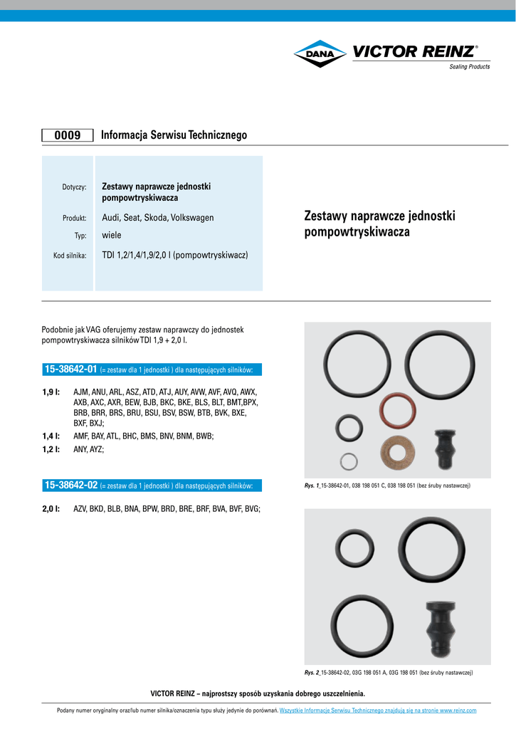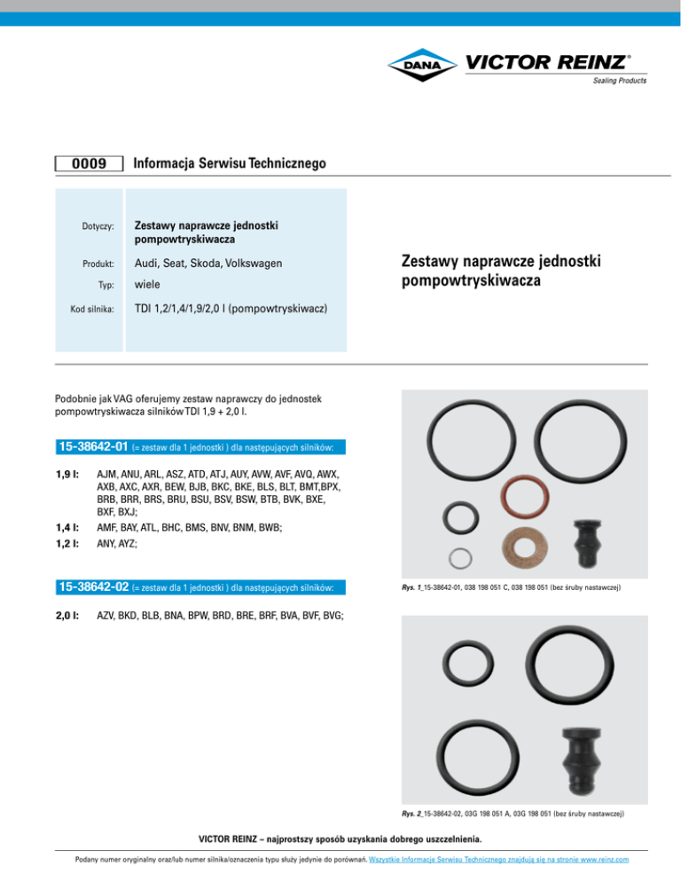 0009 Dotyczy: Produkt: Typ: Kod silnika: Informacja Serwisu Technicznego Zestawy naprawcze jednostki pompowtryskiwacza Audi, Seat, Skoda, Volkswagen wiele Zestawy naprawcze jednostki pompowtryskiwacza TDI 1,2/1,4/1,9/2,0 l (pompowtryskiwacz) Podobnie jak VAG oferujemy zestaw naprawczy do jednostek pompowtryskiwacza silników TDI 1,9 + 2,0 l. 15-38642-01 (= zestaw dla 1 jednostki ) dla następujących silników: 1,9 l: 1,4 l: 1,2 l: AJM, ANU, ARL, ASZ, ATD, ATJ, AUY, AVW, AVF, AVQ, AWX, AXB, AXC, AXR, BEW, BJB, BKC, BKE, BLS, BLT, BMT,BPX, BRB, BRR, BRS, BRU, BSU, BSV, BSW, BTB, BVK, BXE, BXF, BXJ; AMF, BAY, ATL, BHC, BMS, BNV, BNM, BWB; ANY, AYZ; 15-38642-02 (= zestaw dla 1 jednostki ) dla następujących silników: 2,0 l: Rys. 1_15-38642-01, 038 198 051 C, 038 198 051 (bez śruby nastawczej) AZV, BKD, BLB, BNA, BPW, BRD, BRE, BRF, BVA, BVF, BVG; Rys. 2_15-38642-02, 03G 198 051 A, 03G 198 051 (bez śruby nastawczej) VICTOR REINZ – najprostszy sposób uzyskania dobrego uszczelnienia. Podany numer oryginalny oraz/lub numer silnika/oznaczenia typu służy jedynie do porównań. Wszystkie Informacje Serwisu Technicznego znajdują się na stronie www.reinz.com