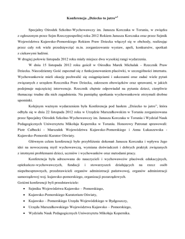Konferencja „Dziecko to jutro”1 Specjalny Ośrodek Szkolno-Wychowawczy im. Janusza Korczaka w Toruniu, w związku z ogłoszonym przez Sejm Rzeczypospolitej roku 2012 Rokiem Janusza Korczaka oraz przez Sejmik Województwa Kujawsko-Pomorskiego Rokiem Praw Dziecka włączył się w obchody, realizując przez cały rok wiele przedsięwzięć m.in. zorganizowanie wystaw, apeli, konkursów, spotkań z ciekawymi ludźmi. W drugiej połowie listopada 2012 roku miały miejsce dwa wysokiej rangi wydarzenia. W dniu 15 listopada 2012 roku gościł w Ośrodku Marek Michalak - Rzecznik Praw Dziecka. Niecodzienny Gość zapoznał się z funkcjonowaniem placówki, w szczególności internatu. Wychowankowie mieli okazję pochwalić się osiągnięciami i sukcesami oraz zadać wiele pytań związanych z urzędem Rzecznika Praw Dziecka, zakresem obowiązków oraz sprawami, w jakich podejmuje najczęściej interwencje. Rzecznik chętnie odpowiadał na pytania dzieci, cierpliwie tłumacząc trudne dla nich zagadnienia. Na pamiątkę spotkania wychowankowie otrzymali drobne upominki. Kolejnym ważnym wydarzeniem była Konferencja pod hasłem „Dziecko to jutro”, która odbyła się w dniu 22 listopada 2012 roku w Urzędzie Marszałkowskim w Toruniu zorganizowana przez Specjalny Ośrodek Szkolno-Wychowawczy im. Janusza Korczaka w Toruniu i Wydział Nauk Pedagogicznych Uniwersytetu Mikołaja Kopernika w Toruniu. Honorowy Patronat sprawowali: Piotr Całbecki - Marszałek Województwa Kujawsko-Pomorskiego i Anna Łukaszewska Kujawsko-Pomorski Kurator Oświaty. Głównym celem konferencji było przybliżenie dokonań Janusza Korczaka i wpływu Jego idei na nowoczesną myśl wychowawczą, wymiana doświadczeń i dobrych praktyk związanych z istotnymi problemami dzieci, uczniów i wychowanków oraz metodami pracy. Konferencja była adresowana do nauczycieli i wychowawców placówek edukacyjnych, opiekuńczo-wychowawczych, fundacji i stowarzyszeń działających na rzecz osób niepełnosprawnych, przedstawicieli organów administracji państwowej, organów administracji samorządowej woj. kujawsko-pomorskiego, organizacji pozarządowych. Gośćmi konferencji byli przedstawiciele: Sejmiku Województwa Kujawsko – Pomorskiego, Kujawsko-Pomorskiego Kuratorium Oświaty, Kujawsko – Pomorskiego Urzędu Wojewódzkiego w Bydgoszczy, Urzędu Marszałkowskiego Województwa Kujawsko – Pomorskiego, Wydziału Nauk Pedagogicznych Uniwersytetu Mikołaja Kopernika. Honorowym gościem był Tadeusz Badurek - pierwszy dyrektor Specjalnego Ośrodka SzkolnoWychowawczego w Toruniu ( dawniej Państwowego Zakładu Wychowawczego). W imieniu organizatorów gości powitała Maria Kluz – Dyrektor Specjalnego Ośrodka Szkolno – Wychowawczego im. Janusza Korczaka w Toruniu. Uroczystego otwarcia konferencji dokonali: Ryszard Bober - Wiceprzewodniczący Sejmiku Samorządu Województwa Kujawsko – Pomorskiego, Anna Łukaszewska - Kujawsko – Pomorski Kurator Oświaty, Tadeusz Kierel Kierownik Biura Nadzoru i Kierunków Kształcenia Departamentu Edukacji i Sportu. Konferencję rozpoczęło przedstawienie przygotowane przez uczniów Specjalnego Ośrodka Szkolno – Wychowawczego w Toruniu pt. „Janusz Korczak - zwyczajnie o Niezwyczajnym” przybliżające sylwetkę wybitnego pedagoga, społecznika, lekarza, wielkiego przyjaciela dzieci. Gości zachwycił i wzruszył występ młodych aktorów, których nagrodzili brawami. W pierwszej części konferencji wykłady wygłosiło troje prelegentów: dr hab. Piotr Petrykowski, prof. UMK - Dziekan Wydziału Nauk Pedagogicznych UMK, wykład pt. „W poszukiwaniu drogi życia” dr hab. Agnieszka Wałęga – adiunkt w Pracowni Historii Wychowania na Wydziale Nauk Pedagogicznych UMK, wykład pt. „Poeci i filozofowie - obraz dziecka w twórczości Janusza Korczaka” Aleksandra Poeplau - Pełnomocnik Wojewody do Spraw Osób Niepełnosprawnych i Rodziny, wykład pt. „Dziecko wobec cierpienia i niepełnosprawności”. Druga część konferencji miała charakter panelu. Do udziału w dyskusji zostali zaproszeni: ks. Daniel Adamowicz - Dyrektor Caritas Diecezji Toruńskiej, Grażyna Brzezińska - Dyrektor Domu Małego Dziecka Nr 2 w Toruniu, Elżbieta Cichon - Kierownik i twórca świetlicy „Antoninek” przy parafii św. Antoniego w Toruniu, Anna Ciesielska - Przewodnicząca Terenowego Komitetu Ochrony Praw Dziecka w Toruniu, Dyrektor Ogniska Pracy Pozaszkolnej „Dom Harcerza” w Toruniu, Marek Fuerst - Kierownik Warsztatu Terapii Zajęciowej przy Fundacji na Rzecz Osób Niepełnosprawnych ARKADIA, Maria Kluz - Dyrektor Specjalnego Ośrodka Szkolno-Wychowawczego im. Janusza Korczaka w Toruniu, Maria Pokrzywnicka - Kierownik Działu Edukacji i Promocji Muzeum Etnograficznego w Toruniu. Inspiracją do dyskusji były wybrane myśli Janusza Korczaka: „Nie wolno zostawiać świata takim, jakim jest”. „Jestem nie po to, by mnie kochali i podziwiali, ale po to, abym działał i kochał”. „Nie obowiązkiem otoczenia pomagać mnie, ale ja mam obowiązek troszczenia się o świat, o człowieka”. „Nie ma dzieci, są ludzie”. „Kiedy śmieje się dziecko, śmieje się cały świat”. Do dyskusji włączyli się inni uczestnicy konferencji, dzieląc się swoimi opiniami i spostrzeżeniami. Konferencja zakończyła się poczęstunkiem. Zaproszeni goście mogli spróbować wypieków przygotowanych przez młodzież kształcącą się na kierunku kucharz, cukiernik w Zasadniczej Szkole Zawodowej w Specjalnym Ośrodku Szkolno - Wychowawczym im. Janusza Korczaka w Toruniu. Konferencji towarzyszyły wystawy przygotowane przez Specjalny Ośrodek Szkolno Wychowawczy im. Janusza Korczaka w Toruniu prezentujące prace plastyczne uczniów oraz historię i teraźniejszość Ośrodka. W konferencji wzięło udział ok. 100 osób. Zebrani mogli wysłuchać wykładów, zapoznać się z działalnością fundacji, stowarzyszeń i placówek oświatowych wspierających osoby niepełnosprawne, wziąć