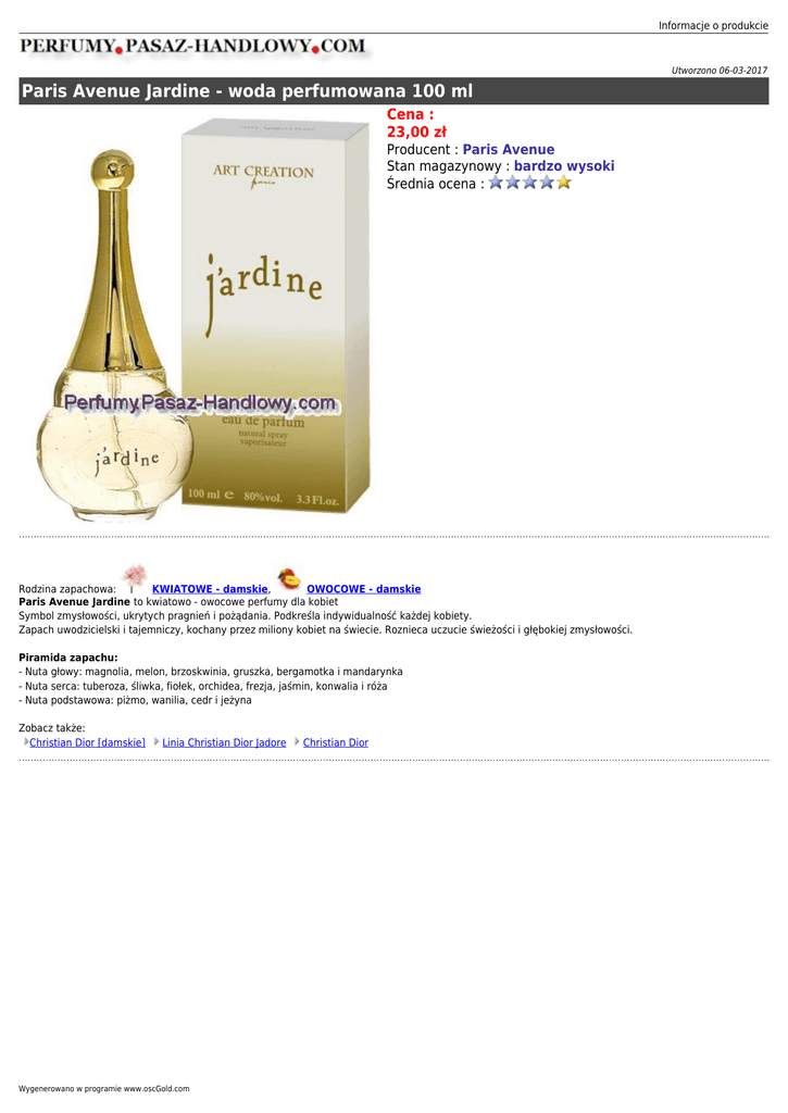 Informacje o produkcie Utworzono 06-03-2017 Paris Avenue Jardine - woda perfumowana 100 ml Cena : 23,00 zł Producent : Paris Avenue Stan magazynowy : bardzo wysoki Średnia ocena : Rodzina zapachowa: KWIATOWE - damskie, OWOCOWE - damskie Paris Avenue Jardine to kwiatowo - owocowe perfumy dla kobiet Symbol zmysłowości, ukrytych pragnień i pożądania. Podkreśla indywidualność każdej kobiety. Zapach uwodzicielski i tajemniczy, kochany przez miliony kobiet na świecie. Roznieca uczucie świeżości i głębokiej zmysłowości. Piramida zapachu: - Nuta głowy: magnolia, melon, brzoskwinia, gruszka, bergamotka i mandarynka - Nuta serca: tuberoza, śliwka, fiołek, orchidea, frezja, jaśmin, konwalia i róża - Nuta podstawowa: piżmo, wanilia, cedr i jeżyna Zobacz także: Christian Dior [damskie] Linia Christian Dior Jadore Wygenerowano w programie www.oscGold.com Christian Dior