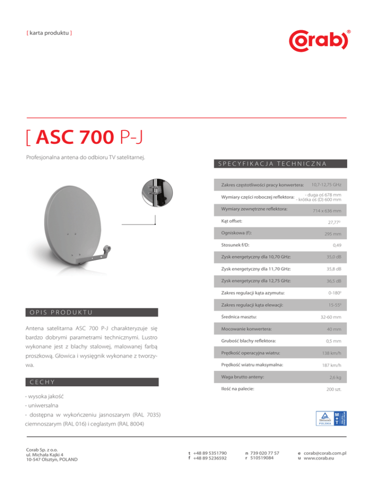 [ karta produktu ] [ ASC 700 P-J Profesjonalna antena do odbioru TV satelitarnej. SPECYFIKACJA TECHNICZNA Zakres częstotliwości pracy konwertera: Wymiary części roboczej reflektora: Wymiary zewnętrzne reflektora: Kąt offset: Stosunek f/D: Antena satelitarna ASC 700 P-J charakteryzuje się bardzo dobrymi parametrami technicznymi. Lustro wykonane jest z blachy stalowej, malowanej farbą proszkową. Głowica i wysięgnik wykonane z tworzywa. CECHY - duga oś 678 mm - krótka oś (D) 600 mm 714 x 636 mm 27,770 Ogniskowa (f ): OPIS PRODUKTU 10,7-12,75 GHz 295 mm 0,49 Zysk energetyczny dla 10,70 GHz: 35,0 dB Zysk energetyczny dla 11,70 GHz: 35,8 dB Zysk energetyczny dla 12,75 GHz: 36,5 dB Zakres regulacji kąta azymutu: 0-1800 Zakres regulacji kąta elewacji: 15-550 Średnica masztu: 32-60 mm Mocowanie konwertera: 40 mm Grubość blachy reflektora: 0,5 mm Prędkość operacyjna wiatru: 138 km/h Prędkość wiatru maksymalna: 187 km/h Waga brutto anteny: Ilość na palecie: 2,6 kg 200 szt. - wysoka jakość - uniwersalna - dostępna w wykończeniu jasnoszarym (RAL 7035) ciemnoszarym (RAL 016) i ceglastym (RAL 8004) Corab Sp. z o.o. ul. Michała Kajki 4 10-547 Olsztyn, POLAND t +48 89 5351790 f +48 89 5236592 n 739 020 77 57 r 510519084 e [email protected] u www.corab.eu