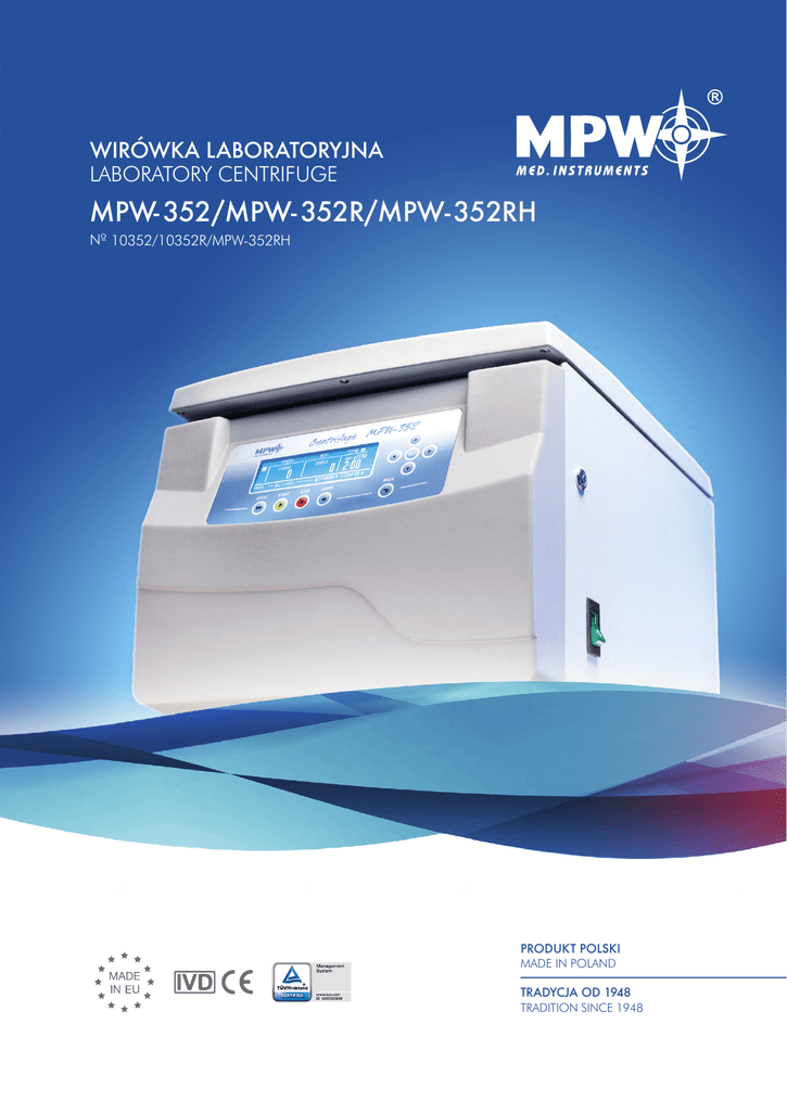 WIRÓWKA LABORATORYJNA LABORATORY CENTRIFUGE MPW- 352/MPW- 352R/MPW- 352RH No 10352/10352R/MPW-352RH PRODUKT POLSKI MADE IN POLAND TRADYCJA OD 1948 TRADITION SINCE 1948 MPW-352 MPW-352R MPW-352RH 230V 50/60Hz; 115V 50/60Hz 230V 50Hz; 230V 60Hz; 115V 50Hz; 115V 60Hz 230V 50Hz; 230V 60Hz; 115V 50Hz; 115V 60Hz 600W 980W 1000ml 90 ÷ 18000 RPM, krok/step 1RPM 30065 x g, krok/step 1 x g RCF 0s ÷ 99h 59min 59s + ∞, krok/step 1s 380 x 443 x 545mm [HxWxD] 380 x 443 x 695mm [HxWxD] – -20C ÷ +40°C1, krok/step 1°C -20C ÷ +55°C1, krok/step 1°C 41,8/45kg (230V/115V) 64,8/70,9kg (230V/115V) 65,7/71,8kg (230V/115V) CECHY / FEATURES z wentylacją; with ventilation z chłodzeniem; with cooling z chłodzeniem i grzaniem; with cooling and heating temperatura +4°C zapewniona dla maksymalnej prędkości każdego wirnika; temperature +4°C ensured for maximum speed of each rotor funkcja opóźnionego startu; delayed start function – rozpoczęcie pracy po osiągnięciu określonej temperatury; start when preselected temperature is reached efektywny system wentylacji; effective ventilation system wstępne schładzanie bez/z wirowaniem, schładzanie po wirowaniu, precyzyjna stabilizacja temperatury; initial cooling without/with centrifuging, cooling after centrifuging, precise temperature stabilization bezobsługowy silnik indukcyjny; maintenance-free induction motor nowoczesny układ programowania; modern software system duży wyświetlacz graficzny LCD - wygaszanie ekranu po okresie bezczynności; large graphic LCD – blanking the screen after a period of inactivity jednoczesne wskazanie na wyświetlaczu zadanej i bieżącej wartości prędkości, RCF, czasu; preselected and real values of speed, RCF, time shown on the display at the same time jednoczesne wskazanie na wyświetlaczu zadanej i bieżącej wartości prędkości, RCF, czasu, temperatury; preselected and real values of speed, RCF, time and temperature shown on the display at the same time 99 programów użytkownika; 99 user programs 10 charakterystyk rozpędzania/hamowania; 10 acceleration/deceleration curves programowanie wieloodcinkowych charakterystyk rozpędzania/hamowania; programming of multi-section acceleration/deceleration curves regulacja RPM/RCF; RPM/RCF adjustment manualne ustawianie promienia wirowania (z automatyczną korektą RCF); centrifugal radius adjustment for samples (with automatic RCF correction) dwa tryby zliczania czasu: od naciśnięcia klawisza start lub od osiągnięcia zadanej prędkości; two modes of time calculation: from start key pressing or from reaching preselected speed tryb pracy ciągłej HOLD; continuous operation mode HOLD praca w trybie SHORT; SHORT time operation mode możliwość zmiany parametrów podczas wirowania; possibility of changing of parameters during centrifuging USB identyfikacja wirnika; rotor identification automatyczne otwieranie pokrywy; automatic lid opening zamek domykający pokrywę; motorised lid lock rejestrowanie parametrów wirowania - program MPW Editor – komputer PC (USB); centrifuging parameters recording - MPW Editor – PC computer (USB) zmiana języka menu (PL, EN, ES, IT, PT, DE, RU); menu language setting (PL, EN, ES, IT, PT, DE, RU) blokowanie wybranych funkcji, ochrona dostępu przy użyciu hasła; selected functions blocking, password protection programowe ustawianie gęstości dla próbek > 1,2g/cm3 (z automatyczną korektą prędkości maksymalnej); manual adjustment of density of samples>1,2g/cm3 (with automatic maximum speed correction) komora wirowania ze stali nierdzewnej; rotor chamber made from stainless steel 1) zas uzyskania żądanej temperatury oraz C możliwość jej osiągnięcia uzależniona jest między innymi od rodzaju wirnika, prędkości wirowania, temperatury otoczenia Time and possibility of obtaining a set temperature is dependent on multiple factors, including: established RPM, rotor type, ambient temperature. REV.04 BEZPIECZEŃSTWO / SAFETY czujnik niewyważenia; unbalance sensor blokada pokrywy podczas wirowania; lid locking during rotor running blokada startu przy otwartej pokrywie; start blocking at opened lid awaryjne otwieranie pokrywy; emergency lid lock release zabezpieczenie termiczne silnika; motor thermal protection Produkt zgodny z międzynarodowymi normami bezpieczeństwa EN-61010-1 i EN-61010-2-020, EN-61010-2-101; Product conforming with the EN-61010-1 and EN-61010-2-020, EN-61010-2-101 international safety standards/regulations The ventilated centrifuge MPW-352, the cooled centrifuge MPW-352R, and the refrigerated and heated centrifuge MPW352RH belong to a range of highly efficient, universal, tabletop devices designed for laboratory applications. They are widely used in medical, scientific, industrial, biochemical, veterinary and other laboratories. The specific features of these centrifuges provide versatility, high parameters and precision of centrifugation as well as repeatability of processes. Additionally, they are accompanied by the widest selection of rotors and other accessories. MPW-352, MPW-352R, MPW-352RH N°- 6 300 5 014 30° 11718 6x85ml Nalgene® 7 000 6 081 30° 11586 4x85ml Nalgene® 10 000 10 621 30° 11496 10x50ml Falcon® 5 500 4 498 30° 11211 8x50ml Falcon® 5 500 4 227 30° 11213 6x50ml Falcon® 6 000 4 427 30° 11746 12x25/30ml 5 500 4 058 30° 11743 36x10/15ml Falcon® 5 000 3 997 30° 11456 30x10/15ml Falcon® 5 200 4 021 30° 11501 30x10/15ml Falcon® 5 200 4 021 30° 11465 24x10/15ml Falcon® 5 000 3 997 30° 11210 12x10/15ml Falcon® 5 500 4 058 30° 11740 8x10/15ml Falcon® 6 000 4 226 30° 11741 6x50ml Falcon® 10 000 10 733 30° 11457 6x50ml Nalgene® 12 000 14 489 30° 11469 8x30ml Nalgene® 12 000 14 006 30° 11273 6x30ml Nalgene® 15 000 19 621 30° 11458 10x15ml Falcon® 10 000 10 733 30° 11466 12x10ml 12 000 15 133 30° 11467 12x10ml 15 000 21 382 30° 11459 36x1,5/2ml 18 0003 30 0653 45° 11462 30x1,5/2ml 15 000 24 400 45° 11259 24x1,5/2ml 18 000 30 065 45° 11461 24x2ml filtr/