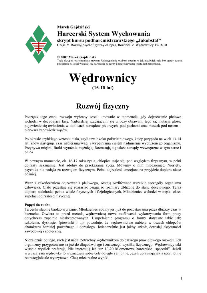 Marek Gajdziński Harcerski System Wychowania skrypt kursu podharcmistrzowskiego „Jakobstaf” Część 2: Rozwój psychofizyczny chłopca, Rozdział 3: Wędrownicy 15-18 lat © 2007 Marek Gajdziński Treść skryptu jest chroniona prawem. Udostępnianie osobom trzecim w jakimkolwiek celu bez zgody autora, powielanie w ilości większej niż na własne potrzeby i modyfikowanie tekstu jest zabronione. Wędrownicy (15-18 lat) Rozwój fizyczny Początek tego etapu rozwoju wybrany został umownie w momencie, gdy dojrzewanie płciowe wchodzi w decydującą fazę. Najbardziej rzucającymi się w oczy objawami tego są; mutacja głosu, pojawienie się owłosienia w okolicach narządów płciowych, pod pachami oraz meszek pod nosem – pierwsza zapowiedź wąsów. Po okresie szybkiego wzrostu ciała, czyli tzw. skoku pokwitaniowego, który przypada na wiek 13-14 lat, znów następuje czas nabierania wagi i wypełniania ciałem nadmiernie wydłużonego organizmu. Przybywa mięśni. Barki wyraźnie mężnieją. Rozrastają się także narządy wewnętrzne w tym serce i płuca. W pewnym momencie, ok. 16-17 roku życia, chłopiec staje się, pod względem fizycznym, w pełni dojrzały seksualnie. Jest zdolny do przekazania życia. Mówimy o nim młodzieniec. Niestety, psychika nie nadąża za rozwojem fizycznym. Pełna dojrzałość emocjonalna przyjdzie dopiero nieco później. Wraz z zakończeniem dojrzewania płciowego, zostają oszlifowane wszelkie szczegóły organizmu człowieka. Ciało przestaje się rozrastać osiągając rozmiary zbliżone do stanu docelowego. Teraz dopiero nadchodzi pełnia władz fizycznych i fizjologicznych. Młodzieniec wchodzi w męski okres zupełnej dojrzałości fizycznej. Popęd do ruchu Ta cecha słabnie bardzo wyraźnie. Młodzieniec zdolny jest już do pozostawania przez dłuższy czas w bezruchu. Otwiera to przed metodą wędrowniczą nowe możliwości wykorzystania form pracy dotychczas zupełnie nieakceptowanych. Uzupełnienie programu o formy statyczne takie jak; szkolenia, dyskusje, śpiewanki i t.p, powoduje, że wędrownictwo nabiera w oczach chłopców charakteru bardziej poważnego i dorosłego. Jednocześnie jest jakby szkołą dorosłej aktywności zawodowej i społecznej. Niezależnie od tego, ruch jest nadal potrzebny wędrownikom do dalszego prawidłowego rozwoju. Ich organizmy przygotowane są już do długotrwałego i znacznego wysiłku fizycznego. Wędrownicy taki właśnie wysiłek preferują. Nie interesują ich już 10-20 kilometrowe harcerskie „spacerki”. Jeżeli wyruszają na wędrówkę to wyznaczają sobie cele odległe i ambitne. Jeżeli uprawiają jakiś sport to nie rekreacyjnie ale wyczynowo. Chcą mieć realne wyniki. 1 W tym miejscu, od razu dotknęliśmy cechy jaka charakteryzuje metodę wędrowniczą. Wędrownika pociągają już tylko ambitne wyzwania, które, aby im sprostać, wymagają dokonania prawdziwego wyczynu. Jeżeli nie postawi się przed nimi celu dostatecznie ambitnego, w ogóle nie okażą zainteresowania. Na razie dotyczy to wyłącznie sfery fizycznej. Od tego właśnie zaczyna się wędrownictwo – od dalekich i trudnych wypraw, od budowania skomplikowanych i imponujących budowli pionierskich, od uprawiania gier sportowych na poważnie. Kiedy chłopcy zaspokoją swoje męskie ambicje, nasycą się sukcesami i udowodnią sobie i światu, że pod względem fizycznym są już pełnowartościowymi mężczyznami, przychodzi kolej na ambitne wyzwania i wyczyn również w innych sferach życia – w służbie, w specjalizacji, w twórczości, i t.p. Jedzenie Wielkość ciała młodzieńca dorównuje rozmiarom dorosłego mężczyzny, ale potrzeby jego są znacznie większe. Poza normalną aktywnością, jego organizm nadal jeszcze się rozwija, a więc potrzebuje odpowiedniej ilości energii i budulca. To sprawia, że wędrownicy jedzą zwykle więcej niż dorośli mężczyźni. Potrzeby te stabilizują się dopiero po osiągnięciu pełnej dojrzałości fizycznej. Kto miał kiedykolwiek do czynienia z wędrownikami ten wie, że czynności związane z ze zdobywaniem i przyrządzaniem pożywienia są przez nich otaczane nieomal rytualnym kultem. Metoda wędrownicza wykorzystuje to zjawisko w ten sposób, że podczas wszelkich wypraw chłopcy sami sobie przyrządzają posiłki, a nie rzadko również, sami muszą sobie zdobyć pożywienie. Jest to nieodłączny element każdej „szkoły przetrwania”. Jedną z najbardziej ulubionych form takiego „challenge’u” jest wędrówka, w trakcie której chłopcy żywią się wyłącznie tym co sami zdobędą – upolowanymi gryzoniami, złowionymi rybami, owocami leśnymi, grzybami i korzonkami. Jedną z najbardziej przez nich cenionych umiejętność jest odróżnianie i znajdywanie jadalnych roślin w lesie i na łące. Kto to potrafi, ten przetrwa w każdej sytuacji i nigdy nie będzie głodny. Sen Wędrownik potrzebuje od 7 do 8 godzin snu na dobę, ale zdolny jest też do krótkotrwałego ograniczenia tego czasu o połowę. Sama noc już dawno straciła dla wędrownika powab tajemniczości. Liczne doświadczenia życiowe, a zwłaszcza harcerskie oswoiły go z tym co jeszcze kilka lat wcześniej było dla niego wielką, groźną ale jednocześnie atrakcyjną niewiadomą. Dlatego wędrownicy bez większego entuzjazmu przyjmują tak wcześniej uwielbiane zajęcia nocne. Całkowicie pragmatycznie wolą się po prostu porządnie wyspać. Jedyne co ich może jeszcze skusić do zarwania nocy to ambitne wyzwanie - podejścia innego obozu harcerskiego albo możliwość przebywania w towarzystwie dziewcząt. Zręczność Pod tym względem wędrownik w niczym nie ustępuje dorosłemu mężczyźnie. Da się to zaobserwować gołym okiem, więc i on ma tego pełną świadomość. W związku z tym zanika potrzeba ciągłego doskonalenia sprawności ruchowej. Nie znaczy to wcale, że wędrownicy stronią od ćwiczeń zręcznościowych. Chętnie im się oddają ale już bez pasj