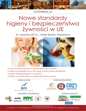KONFERENCJA Nowe standardy higieny i bezpieczeństwa żywności w UE 27 września 2012 r., Hotel Westin, Warszawa • Nowe standardy jakości w bezpieczeństwie żywności • Projekt europejskiej normy dla usług ochrony przed szkodnikami • Kryteria mikrobiologiczne w żywności • Polityka normalizacyjna w bezpieczeństwie żywności ORGANIZATOR PARTNERZY KONFERENCJI PATRONI HONOROWI PATRONI MEDIALNI Biuro Promocji Jakości Sp. z o.o. ul. Resorowa 10, 02-956 Warszawa, tel.: (22) 55 00 700, fax: (22) 55 00 720, [email protected], www.bpj.com.pl Szanowni Państwo, Pojawiające się wciąż zagrożenia w obszarze bezpieczeństwa żywności wymagają nie tylko nieustannego przestrzegania istniejących procedur przez wszystkich uczestników łańcucha żywnościowego, ale również nowego podejścia do oceny ryzyka. Niedawne kryzysy żywnościowe w Polsce oraz ubiegłoroczna epidemia E.coli w Europie uwidoczniły bowiem bezradność organów nadzoru, wywołując obawy wśród milionów konsumentów. § Reakcją na te wyzwania są nowe standardy jakości oraz polityka normalizacyjna w sferze bezpieczeństwa żywności, których znaczenie coraz mocniej akcentuje Komisja Europejska. Jestem przekonany, że właśnie ciągle aktualizowana wiedza stanowi właściwą odpowiedź na pojawiające się zagrożenia, dlatego też zapraszam do wzięcia udziału w konferencji szkoleniowej pt. „Nowe standardy higieny i bezpieczeństwa żywności w UE”, którą Biuro Promocji Jakości organizuje 27 września 2012 r. w Warszawie. Głównym celem konferencji jest zapoznanie uczestników z tendencjami związanymi z europejską normalizacją w zakresie bezpieczeństwa żywności. Jej istotnym elementem będzie także zaprezentowanie założeń nowego europejskiego standardu w dziedzinie usług ochrony przed szkodnikami, który powstaje w ramach Komitetu Technicznego 404 Europejskiego Komitetu Normalizacyjnego (CEN). Europejski standard określa wymagania i kwalifikacje, które muszą zostać spełnione przez profesjonalnych dostawców usług ochrony przed szkodnikami celem ochrony zdrowia publicznego, własności i środowiska. Konferencja skierowana jest do przedstawicieli firm spożywczych, urzędowej kontroli żywności, jednostek certyfikujących, laboratoriów oraz wykonawców usług ochrony przed szkodnikami. Uczestnicy konferencji znajdą odpowiedzi na nurtujące ich pytania, w tym: • Czy potrzebna jest norma dla usług ochrony przed szkodnikami? • Czy urzędowa kontrola żywności poradzi sobie z kryzysami? • Czy potrzebne są dobrowolne standardy bezpieczeństwa żywności? Serdecznie zapraszam! Tadeusz Wojciechowski Prezes zarządu Biuro Promocji Jakości Sp. z o.o. O NAS: • BPJ Biuro Promocji Jakości Sp. z o.o. jest liderem na rynku szkoleniowym i wydawniczym. Naszą misją jest dążenie do osiągania najlepszych rozwiązań dotyczących bezpieczeństwa żywności. Temu celowi służy nasza działalność szkoleniowa i wydawnicza promująca najlepsze firmy na polskim rynku. • BPJ organizuje wiodące konferencje i seminaria tematyczne. Stały się one forum porozumienia między wszystkimi podmiotami zainteresowanymi bezpieczeństwem żywności. Motto naszych działań brzmi: „Integrujemy branżę żywnościową”. • Biuro Promocji Jakości wydaje prasę fachową: Bezpieczeństwo i Higiena Żywności to tytuł o ugruntowanej pozycji. Stanowi on platformę porozumienia między podmiotami odpowiedzialnymi za bezpieczeństwo żywności, czytany przez przedstawicieli przemysłu spożywczego, inspektorów urzędowej kontroli żywności i środowisko naukowe. Higiena&Pest Control to z kolei pismo poruszające zagadnienia higieny i ochrony przed szkodnikami w środowisku urbanistycznym i na obszarach wiejskich. Nowe standardy higieny i bezpieczeństwa żywności w UE 27 września 2012 r., Hotel Westin, Warszawa PROGRAM 9:00-10:00 Rejestracja uczestników, poranna kawa 10:00-10:30 Nowe standardy jakości jako odpowiedź na zagrożenia w zakresie bezpieczeństwa żywności prof. Stanisław Kowalczyk, Główny Inspektor Jakości Handlowej Artykułów Rolno-Spożywczych 10:30-11:00 Polityka normalizacyjna w zakresie bezpieczeństwa żywności Jolanta Kochańska, Zastępca Prezesa Polskiego Komitetu Normalizacyjnego ds. normalizacji 11:00-11:45 Nowy standard CEN 404 (Europejski Komitet Normalizacyjny) dla usług ochrony przed szkodnikami – równe szanse czy bariera rozwoju? dr Christopher Suter, Dyrektor ds. certyfikacji, The Royal Society for Public Health, Wielka Brytania 11:45-12:15 Projekt europejskiej normy w zakresie usług ochrony przed szkodnikami/KT 313 Polskiego Komitetu Normalizacyjnego Tadeusz Wojciechowski, Prezes Zarządu Polskiej Federacji Pest Control 12:15-12:45 Przerwa kawowa 12:45-13:15 Wymagania urzędowej kontroli żywności w zakresie bezpieczeństwa Anna Starnawska-Oleńko, Wojewódzka Stacja Sanitarno-Epidemiologiczna w Warszawie 13:15-13:30 Bezpieczeństwo produkcji i przechowywania żywności – kluczowy kierunek strategii BASF PCS Adam Urbaniak, BASF Polska 13:30-14:00 Kryteria mikrobiologiczne w żywności dr Halina Ścieżyńska, Narodowy Instytut Zdrowia Publicznego – Państwowy Zakład Higieny, Pracownia Mikrobiologii Żywności 14:00-14:30 Dobrowolne standardy bezpieczeństwa żywności na przykładzie międzynarodowego standardu GLOBALG.A.P. Marek Marzec, Dyrektor Rozwoju IFS na terenie Europy Środkowej i Wschodniej 14:30-15:00 Podsumowanie i zakończenie konferencji 15:00-16:00 Lunch § REJESTRACJA UCZESTNIKÓW U ORGANIZATORA tel. (22) 55 00 700, [email protected] ZGŁOSZENIE UDZIAŁU Nowe standardy higieny i bezpieczeństwa żywności w UE 27 września 2012 r. Hotel Westin, Warszawa I. Dane uczestnika A/ Imię i nazwisko uczestnika: ............................................................................... stanowisko: ........................................................... B/ imię i nazwisko uczestnika: .....................................
