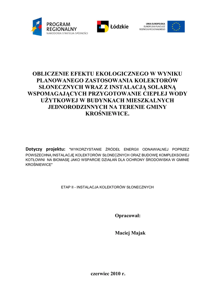 OBLICZENIE EFEKTU EKOLOGICZNEGO W WYNIKU PLANOWANEGO ZASTOSOWANIA KOLEKTORÓW SŁONECZNYCH WRAZ Z INSTALACJĄ SOLARNĄ WSPOMAGAJĄCYCH PRZYGOTOWANIE CIEPŁEJ WODY UŻYTKOWEJ W BUDYNKACH MIESZKALNYCH JEDNORODZINNYCH NA TERENIE GMINY KROŚNIEWICE. Dotyczy projektu: "WYKORZYSTANIE ŹRÓDEŁ ENERGII ODNAWIALNEJ POPRZEZ POWSZECHNĄ INSTALACJĘ KOLEKTORÓW SŁONECZNYCH ORAZ BUDOWĘ KOMPLEKSOWEJ KOTŁOWNI NA BIOMASĘ JAKO WSPARCIE DZIAŁAŃ DLA OCHRONY ŚRODOWISKA W GMINIE KROŚNIEWICE" ETAP II - INSTALACJA KOLEKTORÓW SŁONECZNYCH Opracował: Maciej Majak czerwiec 2010 r. EFEKT EKOLOGICZNY DLA PROGRAMU "WYKORZYSTANIE ŹRÓDEŁ ENERGII ODNAWIALNEJ POPRZEZ POWSZECHNĄ INSTALACJĘ KOLEKTORÓW SŁONECZNYCH ORAZ BUDOWĘ KOMPLEKSOWEJ KOTŁOWNI NA BIOMASĘ JAKO WSPARCIE DZIAŁAŃ DLA OCHRONY ŚRODOWISKA W GMINIE KROŚNIEWICE" Spis treści opracowania: 1. Przedmiot i cel opracowania 2. Podstawa opracowania 3. Dane wyjściowe 4. Założenia 5. Obliczenia 6. Zbiorcze wyniki obliczeń oraz wnioski Strona 2 z 11 EFEKT EKOLOGICZNY DLA PROGRAMU "WYKORZYSTANIE ŹRÓDEŁ ENERGII ODNAWIALNEJ POPRZEZ POWSZECHNĄ INSTALACJĘ KOLEKTORÓW SŁONECZNYCH ORAZ BUDOWĘ KOMPLEKSOWEJ KOTŁOWNI NA BIOMASĘ JAKO WSPARCIE DZIAŁAŃ DLA OCHRONY ŚRODOWISKA W GMINIE KROŚNIEWICE" 1. Przedmiot i cel opracowania. Przedmiotem opracowania jest obliczenie efektu ekologicznego w wyniku planowanego zastosowania kolektorów słonecznych wraz z instalacją solarną do przygotowania ciepłej wody użytkowej w budynkach mieszkalnych jednorodzinnych na terenie gminy Krośniewice. Celem niniejszego opracowania jest wykazanie efektu ekologicznego w zakresie niezbędnym do złożenia wniosku o dofinansowanie projektu w ramach Osi priorytetowej II Ochrona Środowiska, zapobieganie zagrożeniom i energetyka, Działanie II.9 Odnawialne źródła energii, Regionalnego Programu Operacyjnego Województwa Łódzkiego na lata 20072013. Dokumentacja ma na celu uzyskanie funduszy na wykonania modernizacji instalacji ciepłej wody użytkowej (montaż instalacji kolektorów słonecznych). 2. Podstawa opracowania. Podstawę niniejszego opracowania stanowi umowa z Gminą Krośniewice, nr 88a/AO/KR/2009 z dnia 09.06.2010 r. 3. Dane wyjściowe. Stan istniejący Podział budynków ze względu na proponowaną wielkość instalacji solarnej: Do 4 mieszkańców włącznie – 195 budynków; Powyżej 4 mieszkańców – 240 budynków. Sumaryczna ilość mieszkańców – 1956 osób. Źródło ciepłej wody – paliwo - wg poniższego zestawienia: Rodzaj medium Węgiel / Eko-groszek 429 1 Ilość budynków Olej 6 Stan projektowany: PAKIET I – dla budynków jednorodzinnych zamieszkałych przez rodzinę maksymalnie 4-osobową: kolektor próżniowy o 1 w tym powierzchni absorbera 3,07 m2 wraz z pojemnościowym 25 budynków opalanych eko-groszkiem Strona 3 z 11 EFEKT EKOLOGICZNY DLA PROGRAMU "WYKORZYSTANIE ŹRÓDEŁ ENERGII ODNAWIALNEJ POPRZEZ POWSZECHNĄ INSTALACJĘ KOLEKTORÓW SŁONECZNYCH ORAZ BUDOWĘ KOMPLEKSOWEJ KOTŁOWNI NA BIOMASĘ JAKO WSPARCIE DZIAŁAŃ DLA OCHRONY ŚRODOWISKA W GMINIE KROŚNIEWICE" podgrzewaczem ciepłej wody użytkowej o pojemności 300l, naczyniem solarnym, rozdzielaczem, pompą solarną, regulatorem solarnym, zestawem montażowym do dachu PAKIET II – dla budynków jednorodzinnych zamieszkałych przez rodzinę powyżej 4osobową: kolektor próżniowy o łącznej powierzchni absorbera 4,0 m2 (2x2,05m2) wraz z pojemnościowym podgrzewaczem ciepłej wody użytkowej o pojemności 500l, naczyniem solarnym, rozdzielaczem, pompą solarną, regulatorem solarnym, zestawem montażowym do dachu. Informacja na temat kolektorów: - stopień pokrycia zapotrzebowania ciepła na przygotowanie c.w.u. – min. 42,0 %, - sprawność systemu solarnego – min. 55,0 %. 4. Założenia. Ilość ciepłej wody przypadającej na jednego mieszkańca przyjęto wg Rozporządzenia Ministra Infrastruktury z dnia 6 listopada 2008 r. w sprawie metodologii obliczania charakterystyki energetycznej budynku i lokalu mieszkalnego lub części budynku stanowiącej samodzielną całość techniczno-użytkową oraz sposobu sporządzania i wzorów świadectw ich charakterystyki energetycznej (Dz. U. Nr 201, poz. 1240). Czas użytkowania w ciągu roku wynosi 329 dni. Ciepła woda użytkowa podgrzewana będzie o 45 K Zgodnie z warunkami technicznymi jakim powinny odpowiadać budynki i ich usytuowanie (Dz.U.2002.75.690 z późn. zm.) należy zapewnić podgrzew ciepłej wody użytkowej do temperatury min. 55 C. Zakładane wypadkowe roczne pokrycie zapotrzebowania na c.w.u. przez kolektory słoneczne przyjęto na poziomie 45%. Procentowy udział poszczególnych rodzajów źródeł ciepła na dany rodzaj paliwa wraz z wypadkowymi wartościami sprawności przyjęto wg tabel obliczeniowych z poz. 5. Wypadkową sprawność wewnętrznej instalacji c.w.u. stanowi suma iloczynu 75% ogółu instalacji o sprawności eta=0,8 (izolowane przewody bez cyrkulacji) oraz 25% instalacji c.w.u. o sprawności eta=0,7 (izolowane przewody z cyrkulacją). Analogicznie, jako najczęstszy przypadek sprawności zasobnika c.w.u. przyjęto sumę iloczynu 30% ogółu zasobników w systemie wg standardu budynku niskoenergetycznego o sprawności eta=0,86 oraz 70% zasobników o standardzie z lat 1995-2000 o sprawności eta=0,74. Wartości opałowe paliw, jak również wskaźniki emisji substancji wprowadzanych do atmosfery podczas energetycznych procesów spalania paliw przyjęto zgodnie z tabelami z poz. 5. Strona 4 z 11 EFEKT EKOLOGICZNY DLA PROGRAMU "WYKORZYSTANIE ŹRÓDEŁ ENERGII ODNAWIALNEJ POPRZEZ POWSZECHNĄ INSTALACJĘ KOLEKTORÓW SŁONECZNYCH ORAZ BUDOWĘ KOMPLEKSOWEJ KOTŁOWNI NA BIOMASĘ JAKO WSPARCIE DZIAŁAŃ DLA OCHRONY ŚRODOWISKA W GMINIE KROŚNIEWICE" 5. Obliczenia. Tab.1. Obliczeniowe zapotrzebowanie energii dla c.w.u. Ilość mieszkańców Zużycie wody Czas użytkowania w roku Zużycie wody Różnica temperatur wody ciepłej i zimnej Mk dm3/Mkd d dm3/d °C kW GJ/rok kWh/rok kWh/doba 1956 3