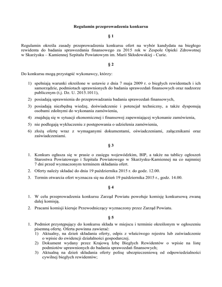 Regulamin przeprowadzenia konkursu §1 Regulamin określa zasady przeprowadzenia konkursu ofert na wybór kandydata na biegłego rewidenta do badania sprawozdania finansowego za 2015 rok w Zespole Opieki Zdrowotnej w Skarżysku – Kamiennej Szpitalu Powiatowym im. Marii Skłodowskiej - Curie. §2 Do konkursu mogą przystąpić wykonawcy, którzy: 1) spełniają warunki określone w ustawie z dnia 7 maja 2009 r. o biegłych rewidentach i ich samorządzie, podmiotach uprawnionych do badania sprawozdań finansowych oraz nadzorze publicznym (t.j. Dz. U. 2015.1011), 2) posiadają uprawnienia do przeprowadzania badania sprawozdań finansowych, 3) posiadają niezbędną wiedzę, doświadczenie i potencjał techniczny, a także dysponują osobami zdolnymi do wykonania zamówienia, 4) znajdują się w sytuacji ekonomicznej i finansowej zapewniającej wykonanie zamówienia, 5) nie podlegają wykluczeniu z postępowania o udzielenia zamówienia, 6) złożą ofertę wraz z wymaganymi dokumentami, oświadczeniami, załącznikami oraz zaświadczeniami. §3 1. Konkurs ogłasza się w prasie o zasięgu wojewódzkim, BIP, a także na tablicy ogłoszeń Starostwa Powiatowego i Szpitala Powiatowego w Skarżysku-Kamiennej na co najmniej 7 dni przed wyznaczonym terminem składania ofert. 2. Oferty należy składać do dnia 19 października 2015 r. do godz. 12.00. 3. Termin otwarcia ofert wyznacza się na dzień 19 października 2015 r., godz. 14.00. §4 1. W celu przeprowadzenia konkursu Zarząd Powiatu powołuje komisję konkursową zwaną dalej komisją. 2. Pracami komisji kieruje Przewodniczący wyznaczony przez Zarząd Powiatu. §5 1. Podmiot przystępujący do konkursu składa w miejscu i terminie określonym w ogłoszeniu pisemną ofertę. Oferta powinna zawierać: 1) Aktualny, na dzień składania oferty, odpis z właściwego rejestru lub zaświadczenie o wpisie do ewidencji działalności gospodarczej. 2) Dokument wydany przez Krajową Izbę Biegłych Rewidentów o wpisie na listę podmiotów uprawnionych do badania sprawozdań finansowych; 3) Aktualną na dzień składania oferty polisę ubezpieczeniową od odpowiedzialności cywilnej biegłych rewidentów; 4) Oświadczenie o niezależności od badanej jednostki, zgodnie z art. 56 ustawy z dnia 7 maja 2009 roku o biegłych rewidentach i ich samorządzie, podmiotach uprawnionych do badania sprawozdań finansowych oraz nadzorze publicznym (t.j. Dz. U. 2015.1011); 5) Cenę brutto za badanie sprawozdania finansowego z wyszczególnieniem ceny netto oraz podatku VAT. 6) Wykaz zakładów opieki zdrowotnej w których oferent przeprowadził badanie sprawozdania finansowego w ciągu ostatnich trzech lat. Wymagane jest by oferent przeprowadził badania sprawozdania w co najmniej trzech zakładach opieki zdrowotnej. 7) Oświadczenie o zakończeniu badania sprawozdania finansowego i przedłożeniu opinii i raportu w terminie do 22 kwietnia 2016 r. 2. Oferta winna być podpisana przez osobę upoważnioną do reprezentowania Oferenta, zgodnie z przedłożonym aktem rejestracyjnym. 3. Wymagane dokumenty winny być przedłożone w oryginale lub w kserokopii potwierdzonej za zgodność przez osobę uprawnioną do reprezentowania Oferenta §6 1. Oferta winna być złożona w kopercie zamkniętej w sposób gwarantujący zachowanie poufności oraz zabezpieczający jej nienaruszalność. Koperta winna być zaadresowana na adres: Starostwo Powiatowe ul. Konarskiego 20, 26-110 Skarżysko - Kamienna i opatrzona nazwą, dokładnym adresem oferenta oraz opatrzona napisem „Oferta dotyczy – badania sprawozdania finansowego ZOZ w Skarżysku – Kamiennej Szpitala Powiatowego im. Marii Skłodowskiej - Curie za 2015 rok” 2. Oferent ponosi odpowiedzialność za zdarzenia wynikające z nienależytego oznakowania koperty lub jej brak w wymaganym terminie. §7 1. Prace komisji są prowadzone, jeżeli w posiedzeniu bierze udział co najmniej 4 jej członków. 2. Postępowanie przeprowadza się także w przypadku złożenia jednej oferty. §8 1. Komisja rozpoczyna postępowanie konkursowe od sprawdzenia czy oferty zostały złożone w terminie i zawierają wszystkie wskazane w ogłoszeniu o konkursie dokumenty, a także czy z dokumentów wynika, że oferent spełnia wymagania wskazane w ogłoszeniu o konkursie. 2. Oferty złożone po terminie, nie zawierające wszystkich wskazanych w ogłoszeniu o konkursie dokumentów oraz oferty, z których wynika, że oferent nie spełnia wymagań wskazanych w ogłoszeniu o konkursie, podlegają odrzuceniu, a oferenci nie są dopuszczani do postępowania konkursowego. §9 1. Komisja dokonuje oceny złożonych ofert i w dniu ich otwarcia dokonuje wyboru najkorzystniejszej oferty. 2. Podstawowym kryterium wyboru oferty jest jej cena. 3. Za najkorzystniejszą zostanie uznana oferta, która ma najniższą cenę. § 10 1. Z prac komisji sporządza się protokół, który podpisują wszyscy członkowie uczestniczący w pracach. 2. Przewodniczący Komisji przedstawia Zarządowi Powiatu wybraną ofertę celem przedłożenia jej Radzie Powiatu Skarżyskiego.