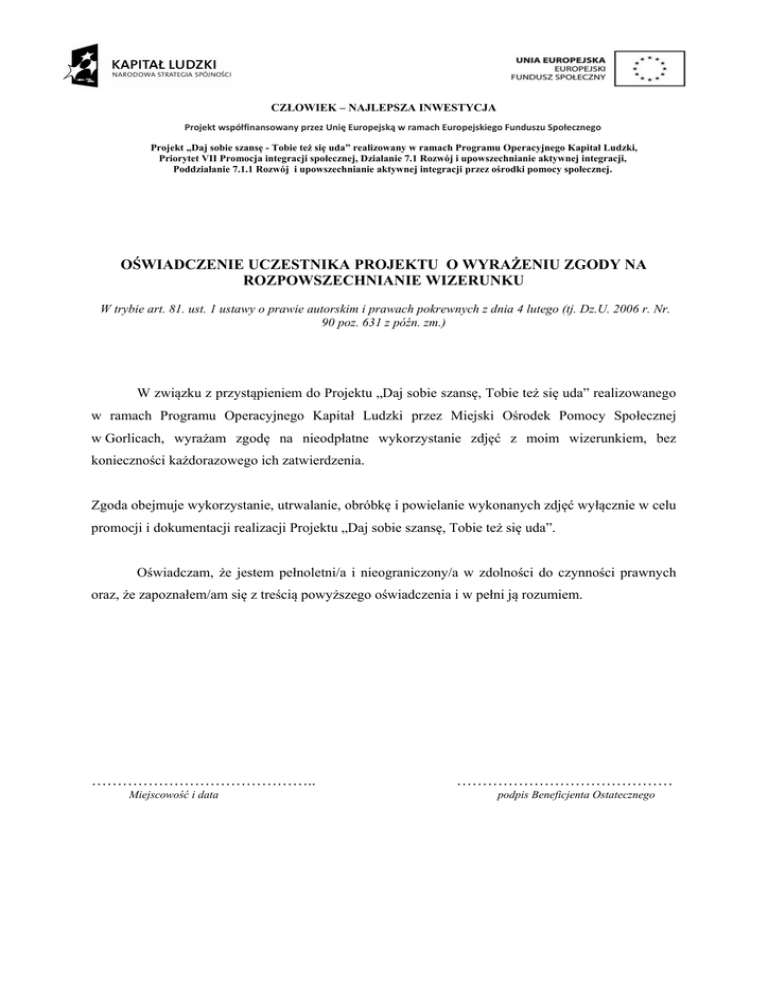CZŁOWIEK – NAJLEPSZA INWESTYCJA Projekt współfinansowany przez Unię Europejską w ramach Europejskiego Funduszu Społecznego Projekt „Daj sobie szansę - Tobie też się uda” realizowany w ramach Programu Operacyjnego Kapitał Ludzki, Priorytet VII Promocja integracji społecznej, Działanie 7.1 Rozwój i upowszechnianie aktywnej integracji, Poddziałanie 7.1.1 Rozwój i upowszechnianie aktywnej integracji przez ośrodki pomocy społecznej. OŚWIADCZENIE UCZESTNIKA PROJEKTU O WYRAŻENIU ZGODY NA ROZPOWSZECHNIANIE WIZERUNKU W trybie art. 81. ust. 1 ustawy o prawie autorskim i prawach pokrewnych z dnia 4 lutego (tj. Dz.U. 2006 r. Nr. 90 poz. 631 z późn. zm.) W związku z przystąpieniem do Projektu „Daj sobie szansę, Tobie też się uda” realizowanego w ramach Programu Operacyjnego Kapitał Ludzki przez Miejski Ośrodek Pomocy Społecznej w Gorlicach, wyrażam zgodę na nieodpłatne wykorzystanie zdjęć z moim wizerunkiem, bez konieczności każdorazowego ich zatwierdzenia. Zgoda obejmuje wykorzystanie, utrwalanie, obróbkę i powielanie wykonanych zdjęć wyłącznie w celu promocji i dokumentacji realizacji Projektu „Daj sobie szansę, Tobie też się uda”. Oświadczam, że jestem pełnoletni/a i nieograniczony/a w zdolności do czynności prawnych oraz, że zapoznałem/am się z treścią powyższego oświadczenia i w pełni ją rozumiem. …………………………………….. Miejscowość i data …………………………………… podpis Beneficjenta Ostatecznego