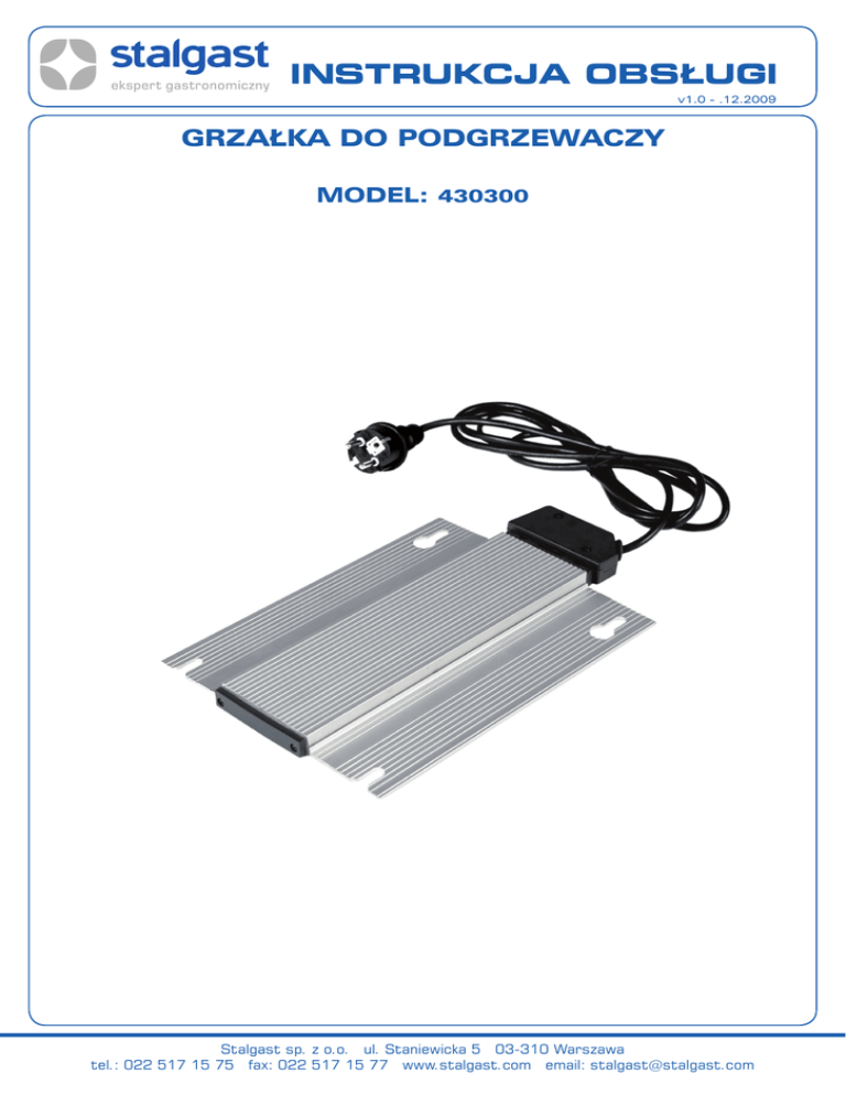 INSTRUKCJA OBSŁUGI v1.0 - .12.2009 GRZAŁKA DO PODGRZEWACZY MODEL: 430300 Stalgast sp. z o.o. ul. Staniewicka 5 03-310 Warszawa tel.: 022 517 15 75 fax: 022 517 15 77 www.stalgast.com email: [email protected] Dziękujemy Państwu za zakup naszego produktu. Przed pierwszym użyciem prosimy dokładnie zapoznać się z niniejszą instrukcją obsługi. Kopiowanie niniejszej instrukcji bez zgody producenta jest zabronione. Zdjęcia oraz rysunki mają charakter poglądowy i mogą różnić się od zakupionego urządzenia. UWAGA: Instrukcję należy przechowywać w bezpiecznym oraz dostępnym dla personelu miejscu. Producent zastrzega sobie prawo do zmiany parametrów technicznych urządzeń bez zapowiedzi. 1. Instrukcje bezpieczeństwa •• Nieprawidłowa obsługa i niewłaściwe użytkowanie może spowodować poważne uszkodzenie urządzenia lub zranienie osób. •• Urządzenie może być stosowane wyłącznie w celu, do którego zostało zaprojektowane. •• Producent nie ponosi żadnej odpowiedzialności za szkody spowodowane nieprawidłową obsługą i niewłaściwym użytkowaniem urządzenia. •• W czasie użytkowania zabezpiecz urządzenie i wtyczkę kabla zasilającego przed kontaktem z wodą lub innymi płynami. W przypadku, gdyby przez nieuwagę urządzenie wpadło do wody, należy natychmiast wyciągnąć wtyczkę z kontaktu, a następnie zlecić kontrolę urządzenia specjaliście. Nieprzestrzeganie tej instrukcji może spowodować zagrożenie życia. •• •• •• •• •• •• •• •• •• •• •• •• •• •• Nigdy nie otwieraj samodzielnie obudowy urządzenia. Nie wtykaj żadnych przedmiotów w obudowę urządzenia. Nie dotykaj wtyczki kabla zasilającego wilgotnymi rękami. Regularnie kontroluj stan wtyczki i kabla. W przypadku wykrycia uszkodzenia wtyczki lub kabla, zleć naprawę w wyspecjalizowanym punkcie naprawczym. W przypadku, gdy urządzenie spadnie lub ulegnie uszkodzeniu w inny sposób, przed dalszym użytkowaniem zawsze zleć przeprowadzenie kontroli i ewentualną naprawę w wyspecjalizowanym punkcie naprawczym. Nigdy nie naprawiaj urządzenia samodzielnie - może to spowodować zagrożenie życia. Chroń kabel zasilający przed kontaktem z ostrymi lub gorącymi przedmiotami i chroń go z dala od otwartego ognia. Jeżeli chcesz odłączyć urządzenie z kontaktu, zawsze chwytaj za wtyczkę, nigdy nie ciągnij za kabel. Zabezpiecz kabel (lub przedłużacz), aby nikt przez omyłkę nie wyciągnął go z kontaktu lub się o niego nie potknął. Kontroluj funkcjonowanie urządzenia w czasie użytkowania. Nie należy zezwalać na użytkowanie urządzenia przez osoby niepełnoletnie, osoby upośledzone fizycznie lub umysłowo oraz upośledzone pod względem zdolności ruchowej, a także osoby nieposiadające odpowiedniego doświadczenia i wiedzy dotyczącej właściwego użytkowania urządzenia. Wyżej wymienione osoby mogą obsługiwać urządzenie jedynie pod nadzorem osoby odpowiedzialnej za bezpieczeństwo. Jeżeli urządzenie nie jest w danej chwili użytkowane lub jest właśnie czyszczone, zawsze odłącz je od źródła zasilania, wyciągając wtyczkę z kontaktu. Uwaga : Jeżeli wtyczka kabla zasilającego jest podłączona do kontaktu, urządzenie cały czas pozostaje pod napięciem. Wyłącz urządzenie, zanim wyciągniesz wtyczkę z kontaktu. Nigdy nie ciągnij urządzenia za kabel zasilający. 2. OSTRZEŻENIA •• •• •• •• •• Nie stosuj żadnych dodatkowych środków oprócz tych, które zostały dostarczone wraz z urządzeniem. Wysokie napięcie! Należy wyłączyć urządzenie z zasilania przed naprawą lub czyszczeniem. Trzymać z dala od przedmiotów łatwopalnych. Należy sprawdzić lokalne napięcie przed uruchomieniem. W przypadku zniszczenia, przewód zasilający musi być naprawiony lub wymieniony przez specjalistę w serwisie naprawczym. UWAGA! Jeżeli wtyczka kabla zasilającego jest podłączona do kontaktu, urządzenie cały czas pozostaje pod napięciem. -2- 3. INSTALACJA 1. Typ 1: należy zdjąć naczynie na wodę z podstawki i odwrócić go je góry dnem (krok 1). Następnie należy wsunąć grzałkę w odpowiednie miejsce ( rowek) (krok2). 2. Typ 2: Krok #1, należy zdjąć naczynie na wodę z podstawki i odwrócić je do góry dnem. Krok #2, nałóż płytę grzewczą na gwintowane śruby. Krok#3, należy dokręcić ręcznie nakrętki (należy dokręcać tylko ręcznie) na śruby. TYP: 2 TYP: 1 1 1 2 2 3 4. Obsługa podgrzewacza 4.1. Napełnij naczynie na wodę gorącą wodą (50 do 60C). Pamiętaj , że podgrzewacze nie mogą być zanurzone w wodzie! Sprawdź poziom wody. Podgrzewacz nie może być używany bez wody! 4.2.Załóż pokrywę. 4.3.Podłącz grzałkę do prądu i odczekaj od 30 do 40 minut aż podgrzewacz się nagrzeje do odpowiedniej temperatury. UWAGA! Nigdy nie używaj grzałki nie umieszczonej w podgrzewaczu. -3- 5. Czyszczenie 1. Odłącz kabel zasilający od prądu. 2. Poczekaj aż podgrzewacz i grzałka ostygną. 3. Wyjmij grzałkę z podgrzewacza, taki jak pokazano w punkcie 3. 4. Wyczyść za pomocą wilgotnej szmatki. UWAGA! Nie zanurzaj grzałki w wodzie ani nie polewaj jej wodą. 6. AWARIE, PRZYCZYNY, ROZWIĄZANIA AWARIE Jedzenie ochładza się i nie jest podgrzewane PRZYCZYNY Naczynie na wodę zostało napełnione zimną wodą Podgrzewacz został zbyt krótko nagrzewany lub w ogóle nie nagrzany przed włożeniem jedzenia ROZWIĄZANIA Napełnić naczynie na wodę gorącą wodą Grzałka nie została poprawnie zamocowana Sprawdzić poprawne zamocowanie grzałki Nie poprawne ustawienie termostatu Podkręcić moc Sprawdzić i ewentualnie domknąć pokrywę Duża utrata ciepła Pokrywa jest otwarta Wstępnie podgrzewać urządzenie przez 30-40 minut 7. DANE TECHNICZNE Model Napięcie (V) Częstotliwość (Hz) Moc (W) Wymiary (mm) 430300 230 50 250 195x150 8. usuwanie ZUŻYTYCH URZĄDZEŃ Po zakończeniu okresu użytkowania sprzętu lub kupując nowy w firmi
