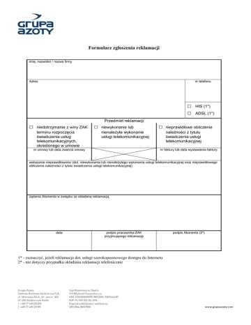 Formularz zgłoszenia reklamacji imię, nazwisko / nazwa firmy Adres nr telefonu □ □ HIS (1*) ADSL (1*) Przedmiot reklamacji □ niedotrzymanie z winy ZAK terminu rozpoczęcia świadczenia usług telekomunikacyjnych, określonego w umowie □ niewykonanie lub nienależyte wykonanie usługi telekomunikacyjnej nr umowy lub data zwarcia umowy □ nieprawidłowe obliczenie należności z tytułu świadczenia usługi telekomunikacyjnej nr faktury lub data wystawienia faktury wskazanie nieprawidłowości (dot. niewykonania lub nienależytego wykonania usługi telekomunikacyjnej oraz nieprawidłowego obliczenia należności z tytułu świadczenia usługi telekomunikacyjnej) żądania Abonenta w związku ze składaną reklamacją data podpis pracownika ZAK przyjmującego reklamację 1* - zaznaczyć, jeżeli reklamacja dot. usługi szerokopasmowego dostępu do Internetu 2* - nie dotyczy przypadku składania reklamacji telefonicznie podpis Abonenta (2*) Opis do formularza Niewykonanie lub nienależyte wykonanie usługi telekomunikacyjnej dotyczy następujących sytuacji: • brak sygnału, • brak możliwości realizacji zamówionych usług, • brak możliwości realizacji określonych rodzajów połączeń, • kwestionowanie połączeń wykonanych przez Abonenta. Nieprawidłowe obliczenie należności z tytułu świadczenia usługi telekomunikacyjnej dotyczy następujących sytuacji: • nieotrzymanie faktury, • nieprawidłowe obliczenie należności za usługi telekomunikacyjne. Żądania Abonenta mogą być następujące: • zadośćuczynienie w związku z brakiem sygnału lub możliwości realizacji usług, • zwrot niesłusznie obliczonych opłat, • ponowne wystawienie poprawnej faktury.