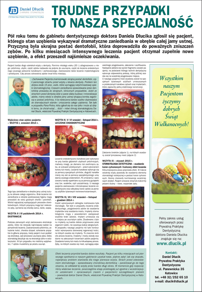 TRUDNE PRZYPADKI TO NASZA SPECJALNOŚĆ Pół roku temu do gabinetu dentystycznego doktora Daniela Dłucika zgłosił się pacjent, którego stan uzębienia wykazywał dramatyczne zaniedbania w obrębie całej jamy ustnej. Przyczyną była skrajna postać dentofobii, która doprowadziła do poważnych zniszczeń zębów. Po kilku miesiącach intensywnego leczenia pacjent otrzymał zupełnie nowe uzębienie, a efekt przeszedł najśmielsze oczekiwania. Pacjent bardzo długo odwlekał wizytę u dentysty. Pomimo młodego wieku (35 l.) zdiagnozowano u niego: próchnicę, ubytki, część zębów nadawała się jedynie do usunięcia, część do leczenia endodontycznego (zwanego potocznie kanałowym) i zachowawczego. Zastosowano także leczenie implantologiczne i protetyczne. Cały proces odnowienia zębów trwał kilka miesięcy. - Zachowanie Pacjenta znamionowało skrajną postać dentofobii, czyli panicznego strachu przed wizytą u lekarza dentysty. Problem ten dotyka około 15 proc. osób, które wymagają natychmiastowej opieki stomatologicznej. Czasami zaniedbania spowodowane przez dentofobię prowadzą do skrajnych, klinicznych przypadków. Jeżeli ze strachem przed dentystą idzie w parze słaba budowa i mineralizacja zębów, mamy wtedy w obrębie jamy ustnej tykającą bombę zegarową w postaci próchnicy. A ta nieleczona bardzo szybko doprowadza do dramatycznych stanów i zniszczenia całego uzębienia. Tak było w przypadku Pana Piotra, który zgłosił się do nas tylko i może aż dzięki temu, że chciał wziąć… ślub! – mówi chirurg stomatologiczny Daniel Dłucik, właściciel Prywatnej Praktyki Dentystycznej w Katowicach. Wyjściowy stan zębów pacjenta – WIZYTA I, wrzesień 2014 r. wiedniego przygotowania, zaleczenia i oszlifowania. Następnie pobiera się wycisk fragmentu szczęki pacjenta, na podstawie którego technik dentystyczny wykonuje odpowiednią protezę, którą później osadza się na wcześniej przygotowane miejsce. U naszego pacjenta most osadzony został na specjalnych tytanowych sztyftach umieszczonych w przeleczonych kanałowo zębach oraz implantach, które zapewniły pełną stabilizację konstrukcji. WIZYTA IV, V i VI wrzesień – listopad 2014 r. LECZENIE ENDODONTYCZNE Wszystkim naszym Pacjentom życzymy dobrych Świąt Wielkanocnych! Założenie ćwieków (zdjęcie 1), na których osadzony został tymczasowy most (zdjęcie 2) Tego typu zaniedbania w obrębie jamy ustnej rzutują na zdrowie całego organizmu. Brak leczenia lub zaniedbania w obrębie podstawowej higieny mogą prowadzić do wielu groźnych chorób i powikłań. Wśród najczęściej występujących procesów chorobotwórczych, których przyczyną mogą być nieleczone zęby, wymienia się choroby serca, nerek, sepsę. WIZYTA II i III październik 2014 r. EKSTRAKCJE Podczas pierwszych wizyt zastosowano ekstrakcje zębów, które nie rokowały najmniejszej nadziei na pomyślność leczenia. Zaawansowana próchnica, zakażenie kości, choroba dziąseł, schorzenie przyzębia to główne przyczyny, kiedy pacjent musi poddać się ekstrakcji, czyli procesowi usunięcia zęba. Dobry stomatolog decyduje się na ekstrakcję tylko w ostateczności. W tym przypadku nie mieliśmy wątpliwości, 7 zębów musieliśmy po prostu usunąć. Leczenie endodontyczne (kanałowe) jest wykonywane przy bardzo głębokich ubytkach próchniczych, martwicy miazgi, po złamaniu lub zwichnięciu zęba, ze wskazań protetycznych – przed wykonaniem korony lub mostu. Leczenie kanałowe wykonuje się za pomocą specjalnych pilników, długość kanałów mierzy się zaś za pomocą specjalistycznego urządzenia zwanego endometrem. Po zmierzeniu i opracowaniu kanały wypełniane są za pomocą gutaperki oraz tzw. sealerów, czyli uszczelniaczy. U naszego pacjenta zastosowano mikroskopowe leczenie endodontyczne oraz odbudowy koron zębów za pomocą sztyftów tytanowych koronowo-korzeniowych. WIZYTA IX – styczeń 2015 r. STOMATOLOGIA ESTETYCZNA – osadzenie koron cyrkonowych i końcowy efekt leczenia Kilkumiesięczna praca przyniosła efekt. W trakcie ostatniej wizyty pozostały do osadzenia elementy stomatologii estetycznej w postaci koron cyrkonowych. Korony stanowiły kwintesencję wcześniejszych działań. Pacjent wreszcie otrzymał znakomity prezent ślubny – nowe, wspaniałe zęby. WIZYTA VI, VII i VIII wrzesień – listopad – grudzień 2014 r. Część wykonywanych zabiegów realizowana była równolegle. Tak było w przypadku leczenia endodontycznego, przygotowania zębów do osadzenia implantów oraz osadzenia mostu. Implanty stomatologiczne mogą z powodzeniem zastępować wszelkie braki zębowe. Implant umieszcza się w miejscu po usuniętym zębie. Zbudowane z tytanu implanty są bardzo dobrze przyjmowane przez organizm ludzki, nie wywołują reakcji alergicznych. W przypadku naszego pacjenta nie było konieczności wykonywania sterowanej regeneracji kości, na których osadza się implanty. To znacznie skróciło proces leczenia. Implanty i mosty zostały osadzone na zaleczonych korzeniach zębów pacjenta. Osadzenie korony lub mostu to kilkuetapowy proces. Zęby, na których osadza się most, wymagają odpo- Efekt leczenia przyniósł bardzo dobre rezultaty. Pacjent po kilku miesiącach od pierwszego spotkania w naszym gabinecie uzyskał nowe, piękne zęby! Jak się okazało, największy problem stanowiła dla niego pierwsza wizyta. Strach przed odwiedzeniem stomatologa – spowodowany chorobliwą dentofobią – paraliżował go do tego stopnia, że odkładał tę wizytę przez bardzo długi okres. W momencie gdy rozpoczęliśmy właściwe leczenie, poszczególne etapy przebiegały już zgodnie z wcześniejszymi usta le nia mi i opra cowa nym (razem z pacjen tem) szczegółowym planem – powiedział doktor Daniel Dłucik, właściciel Prywatnej Praktyki Dentystycznej w Katowicach. Pełny zakres usług oferowanych przez Prywatną Praktykę Dentystyczną doktora Daniela Dłucika znajd