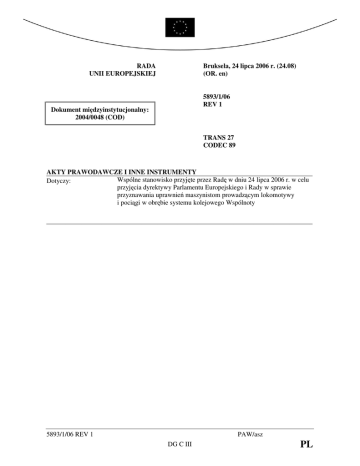 RADA UNII EUROPEJSKIEJ Bruksela, 24 lipca 2006 r. (24.08) (OR. en) 5893/1/06 REV 1 Dokument mi dzyinstytucjonalny: 2004/0048 (COD) TRANS 27 CODEC 89 AKTY PRAWODAWCZE I INNE INSTRUMENTY Wspólne stanowisko przyj te przez Rad w dniu 24 lipca 2006 r. w celu Dotyczy: przyj cia dyrektywy Parlamentu Europejskiego i Rady w sprawie przyznawania uprawnie maszynistom prowadz cym lokomotywy i poci gi w obr bie systemu kolejowego Wspólnoty 5893/1/06 REV 1 PAW/asz DG C III PL DYREKTYWA 2006/.../WE PARLAMENTU EUROPEJSKIEGO I RADY z dnia w sprawie przyznawania uprawnie maszynistom prowadz cym lokomotywy i poci gi w obr bie systemu kolejowego Wspólnoty PARLAMENT EUROPEJSKI I RADA UNII EUROPEJSKIEJ, uwzgl dniaj c Traktat ustanawiaj cy Wspólnot Europejsk , w szczególno ci jego art. 71, uwzgl dniaj c wniosek Komisji, uwzgl dniaj c opini Europejskiego Komitetu Ekonomiczno-Społecznego1, uwzgl dniaj c opini Komitetu Regionów2, stanowi c zgodnie z procedur okre lon w art. 251 Traktatu3, 1 2 3 Dz.U. C 221 z 8.9.2005, str. 64. Dz.U. C 71 z 22.3.2005, str. 26. Opinia Parlamentu Europejskiego z dnia 28 wrze nia 2005 r. (dotychczas nieopublikowana w Dzienniku Urz dowym), wspólne stanowisko Rady z dnia 5 grudnia 2005 r. (dotychczas nieopublikowane w Dzienniku Urz dowym) oraz stanowisko Parlamentu Europejskiego z dnia ... (dotychczas nieopublikowane w Dzienniku Urz dowym). 5893/1/06 REV 1 PAW/asz DG C III 1 PL a tak e maj c na uwadze, co nast puje: (1) Dyrektywa 2004/49/WE Parlamentu Europejskiego i Rady z dnia 29 kwietnia 2004r. w sprawie bezpiecze stwa kolei wspólnotowej1 nakłada na zarz dców infrastruktury i przedsi biorstwa kolejowe obowi zek opracowania własnych systemów zarz dzania bezpiecze stwem w taki sposób, aby dany system kolejowy był przynajmniej w stanie spełni wspólne wymagania bezpiecze stwa (CST) i aby system ten odpowiadał krajowym przepisom w zakresie bezpiecze stwa oraz wymogom bezpiecze stwa okre lonym w technicznych specyfikacjach interoperacyjno ci (TSI), a tak e aby zastosowanie znalazły odno ne elementy wspólnych metod oceny bezpiecze stwa (CSM). Powy sze systemy zarz dzania bezpiecze stwem przewiduj , mi dzy innymi, programy i systemy szkolenia pracowników, które zapewniaj utrzymanie ich kwalifikacji oraz nale yte wykonywanie obowi zków. (2) Dyrektywa 2004/49/WE stanowi, e aby uzyska dost p do infrastruktury kolejowej, przedsi biorstwo kolejowe musi posiada certyfikat bezpiecze stwa. 1 Dz.U. L 164 z 30.4.2004, str. 44. 5893/1/06 REV 1 PAW/asz DG C III 2 PL (3) Na mocy dyrektywy Rady 91/440/EWG z dnia 29 lipca 1991 r. w sprawie rozwoju kolei wspólnotowych1, licencjonowanym przedsi biorstwom kolejowym od dnia 15 marca 2003 r. przysługiwało prawo dost pu do transeuropejskiej sieci towarowej w celu wykonywania mi dzynarodowych kolejowych przewozów towarowych, a najpó niej od 2007 r. b dzie przysługiwa prawo dost pu do całej sieci w celu wykonywania krajowych i mi dzynarodowych przewozów towarowych. Nieuchronnym skutkiem tego stopniowego rozszerzania praw dost pu b dzie zwi kszony przepływ maszynistów poci gów przez granice kraju. W rezultacie wzrasta b dzie zapotrzebowanie na maszynistów przeszkolonych i uprawnionych na podstawie wiadectwa do prowadzenia poci gów w co najmniej dwóch pa stwach członkowskich. (4) Badanie wykonane przez Komisj w 2002 roku wykazało, e przepisy pa stw członkowskich dotycz ce warunków przyznawania uprawnie maszynistom poci gów znacznie ró ni si mi dzy sob . Aby zniwelowa te ró nice, powinno si przyj wspólnotowe zasady przyznawania uprawnie maszynistom poci gów, przy jednoczesnym utrzymaniu obecnego, wysokiego poziomu bezpiecze stwa systemu kolejowego na terytorium Wspólnoty. (5) Takie wspólnotowe zasady powinny przyczynia si równie do realizacji celów polityki Wspólnoty w zakresie swobody przepływu pracowników, swobody przedsi biorczo ci i swobody wiadczenia usług w ramach wspólnej polityki transportowej, przy jednoczesnym unikaniu zakłóce konkurencji. 1 Dz.U. L 237 z 24.8.1991, str. 25. Dyrektywa ostatnio zmieniona dyrektyw 2004/51/WE Parlamentu Europejskiego i Rady (Dz.U. L 164 z 30.4.2004, str. 164). 5893/1/06 REV 1 PAW/asz DG C III 3 PL (6) Celem niniejszych wspólnych przepisów powinno by przede wszystkim ułatwienie przepływu maszynistów poci gów pomi dzy pa stwami członkowskimi oraz ułatwienie ich przepływu pomi dzy przedsi biorstwami kolejowymi, natomiast w szerszym uj ciu uznawanie licencji oraz ujednoliconego wiadectwa uzupełniaj cego przez wszystkie podmioty sektora kolejowego. W tym celu w niniejszych przepisach powinny zosta okre lone minimalne wymagania, których spełnienie pozwoli kandydatom na uzyskanie licencji lub ujednoliconego wiadectwa uzupełniaj cego. (7) Nawet je eli dane pa stwo członkowskie wył cza z zakresu stosowania niniejszej dyrektywy maszynistów pracuj cych wył cznie w ramach systemów, sieci i infrastruktury kolejowej niektórych kategorii, to wył czenie takie w aden sposób nie powinno ogranicza obowi zku tego pa stwa członkowskiego w zakresie uznawania wa no ci licencji na całym terytorium Unii Europejskiej lub wa no ci ujednoliconych wiadectw uzupełniaj cych – w ramach odno nej infrastruktury. (8) Wymogi powinny obejmowa przynajmniej doln granic wieku, od której wolno prowadzi poci g, zdolno fizyczn i psychiczn kandydata do wykonywania zawodu, do wiadczenie zawodowe oraz znajomo pewnych zagadnie zwi zanych z prowadzeniem poci gu, wiedz o infrastrukturze, w obrebie której maszyni ci b d prowadzi poci g, oraz j zyk u ywany w ramach tej infrastruktury. 5893/1/06 REV 1 PAW/asz DG C III 4 PL (9) Aby zracjonalizowa koszty szkolenia odbywanego przez maszynistów w celu uzyskania ujednoliconego wiadectwa uzupełniaj cego, powinno ono koncentrowa si – na ile jest to mo liwe i po dane z punktu widzenia bezpiecze stwa – na tych szczególnych czynno ciach, które ma wykonywa maszynista, takich jak przetaczanie taboru, czynno ci z zakresu naprawy i utrzymania pojazd