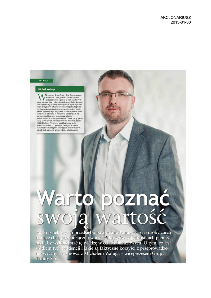AKCJONARIUSZ 2013-01-30 Michał Waluga W iceprezes Grupy Trinity S.A. Radca prawny i adwokat. Specjalista z zakresu prawa gospodarczego i prawa spółek handlowych waz transakcji na rynku niepublicznym. Autor i współ autor publikacji poświęconych praktycznym zagadnie niom związanym z funkcjonowaniem spółek kapitało wych oraz prowadzeniem procesów inwestycyjnych. Od lat wykorzystuje znajomość prawa w praktyce biz nesowej. Bral udział w kilkunastu transakcjach na rynku niepublicznym, m.in.: przy zakupie Centrozłomu-Wrocław przez KGHM Ecoren, przy sprze daży spółki Librus funduszowi Oresa Yentures. spółki CERKO Selenie FM oraz w upublicznieniu spółki Chemoservis-[>wory. Sprawuje funkcje członka rad nadzorczych i zarządów kilku spółek niepublicznych. Absołwent prawa na Uniwersytecie Wrocławskim i / r s s ci ryne < wyce ace che i pozę Kun stać tę wiedzę w <Mfil ffli^^PW^n. O tym, co jest łem tyc i ItSlilencji i jakie są faktyczne korzyści z przeprowadzenowa z Michałem Walugą - wiceprezesem Grupy wyceny mity S., AKCJONARIUSZ 2013-01-30 Dotychczas wyceny przedsiębiorstw byty głównie z fuzjami i przejęcia mi, na które decydują się raczej tylko duże podmioty. Obecnie widoczna jest jednak dywersyfikacja potrzeb, które motywują do skorzystania z tego typu usługi. Z czego to wynika? / kojarzone toU ĄicjMWaluga: Rynek wycen w Polsce suk7pc się rozwija, Z jednej strony napekjąŁo przedsiębiorcy oraz inwestorzy, IÓK*PLaaczęli powoli odkrywać korzyści z wiedzy o wartości firmy, z drugiej nato miast podmioty oferujące takie usługi, które starają się stopniowo zwiększać świadomość tej wartości wśród potencjalnych klientów. Rosnąca konkurencja powoduje też korzyst ne z perspektywy usługobiorcy zmiany cenowe. Jeszcze kilka lat temu, zlecenie wyceny było znacznie droższe niż obecnie - usługa ta była dość elitarna. W tej chwili tę samą wiedzę można zdobyć już za kilka do kilkunastu tysięcy złotych. Do czego zatem poza transakcjami M6A zarządy wykorzystują wyceny? Zakres zastosowań jest stosunkowo szeroki. T.iczną grupę klientów stanowią podmioty wykorzystujące uzyskane dane w szeroko rozumiany zarządzaniu strategicznym. Znając wartość poszczególnych aktywów, można z łatwością zidentyfikować te z nich, które w największym stopniu wpły wają na wartość firmy Usprawniając dzia łalność, czy redukując koszty wiadomo, w których obszarach należy rozpocząć Mniej skomplikowane staje się również określenie ścieżki dalszego rozwoju przedsię biorstwa, a zatem odpowiedź na pytanie, czy zgodnie z prognozami wartość danego podmiotu będzie rosnąć, czy jednak warto znaleźć dla niego nowego właściciela. Drugim równie istotnym obszarem sa IPO Znaczące turbulencje kursów i recesja gospodarcza sprawiają, że awersja do ryzyka wśród inwestorów rośnie. Transparentność staje się dla emitentów kluczowym aspek tem. Dokładna znajomość zmieniającej się wartości firmy pozwala tworzyć bardziej efektywne prognozy, eo ułatwia odsprzedaż. oferowanych papierów wartościowych. Akcjonariusze z kolei mają dzięki temu pew ność, że majątek finny pozwoli pokryć straty w przypadku ewentualnych problemów, fbza tym, jest też grono innych działań, w których wycena przedsiębiorstwa będzie znacząco ułatwiać ich przebieg. Może być to np, kontrola wyników w piz.ypadku progra mów opcji managerskich, wnoszenie całości lub fragmentu przedsiębiorstwa jako aportu czy też ubezpieczenie firmy od wydarzeń losowych. Przeprowadzona wycena może stanowić wskaźnik dla inwestorów? Mówiąc w kontekście opiniowania danej inwestycji - tak. Podejmując decyzję o uloko waniu kapitału, należy brać pod uwagę możliwie najszersze spektrum czynników. Potencjalny inwestor, który otrzyma dostęp do tego typu danych zyskuje większą świado mość w zakresie ewentualnych szans i zagro żeń, które mu towarzyszą, dlatego wzrasta prawdopodobieństwo podjęcia racjonalnej decyzji. Czy firma zajmująca się tworzeniem wycen musi posiadać specjalne uprawie nia? Jest to zależne od terytorium. W krajach, takich jak Stany Zjednoczone czy Kanada występuje osobna certyfikacja biegłych w zakresie wyceny W Polsce dotychczas licencjonowanie nie powstało, dlatego jed nym 7. ważniejszych czynników decydują cych o wyborze usługodawcy powinno być jego dotychczasowe doświadczenie Znajomość metodyki nie jest waina? Stosowane modele mają charakter ogólno dostępny. r.atwo zatem dotrzeć do schema tów, które umożliwią przeprowadzenie wyceny Istotna jest umiejętność dopasowa nia jej do specyfiki konkretnego podmiotu, AKCJONARIUSZ 2013-01-30 ponieważ tylko tym sposobem uzyska się odpowiednio precyzyjne wyniki. Jak wzorcowo przebiega sam proces? Stosowane metody można zaklasyfikować do trzech grup: majątkowych, rynkowych oraz dochodowych, z czego każda z nich bazuje na innym punkcie odniesienia. W razie potrzeby można też tworzyć różne go rodzaju hybrydy W ujęciu majątkowym podstawę szacun ków wartości przedsiębiorstwa stanowią, jak sama nazwa wskazuje, posiadany mają tek oraz zobowiązania firmy Odnosi się ono nie tylko do aktywów wyszczególnio nych w bilansie, ale również aktywów nie materialnych, np. znaku towarowego. Metody rynkowe bazują na porównaniach z konkurencją. Ich podstawą są notowane przez konkurenta mnożniki rynkowe, a więc stosunek bieżącej kapitalizacji do odpowiednich wartości finansowych zaczerpniętych z bilansu oraz rachunku zysków i strat, dlatego wybiera się podmio ty z rynku publicznego Natomiast jeśli pod uwagę brane są mnożniki transakcyj ne (tj. stosunek wartości transakcji do odpowiednich wskaźników finansowych) - z niepublicznego Najpowszechniejszym sposobem na przeprowadzenie wyceny wciąż pozostaje ujęcie dochodowe Podstawą są w tym przypadku sformuło wane oczekiwania odnośnie przyszłości danego przedsi
