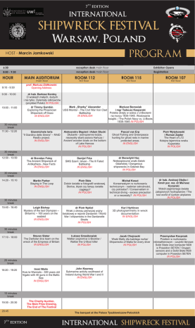 7th edition INTERNATIONAL SHIPWRECK FESTIVAL Warsaw, Poland VII WARSZAWA 2017 PROGRAM HOST - Marcin Jamkowski 6:30 reception desk main floor Exhibiton Opens 8:00 - 9:30 reception desk main floor Registration HOUR MAIN AUDITORIUM 9:10 - 9:30 prof. Mariusz Zió³kowski Opening Address main floor ROOM 112 first floor ROOM 115 first floor 9:30 - 10:00 dr hab. Bartosz Kontny O wrakach ma³ych, du¿ych i nie tylko. Dylematy odkrywców (przyk³ad Polski) IN POLISH 10:00 - 11:00 dr Timmy Gambin Exploring the Phoenician Shipwreck off Gozo IN ENGLISH Mark „Sharky” Alexander USS Monitor - The Civil War Iron Clad Battleship IN ENGLISH Mariusz Borowiak i mgr Tadeusz Kasperski Polskie okrêty w walce z U-Bootami na morzu 1939-1945. Wodowanie ksi¹¿ki. / The Polish Navy vs. U-Boots 1939-1945 IN POLISH Gianmichele Iaria “Il Giardino delle Sirene” – RAID ResEx project. IN ENGLISH Aleksandra Stêpieñ i Adam S³ucki D³ubanki - jednopienne ³odzie, niezwyk³y skarb jeziora Hañcza / Ancient wooden boats on the bottom of Lake Hancza IN POLISH Pascal van Erp Ghost Fishing and Greenpeace hunting for ghost nets in marine protected areas. IN ENGLISH dr Brendan Foley The Ancient Shipwreck of Antikythera - New Facts IN ENGLISH Danijel Frka SMS Szent Istvan - The Ill Fated Battleship IN ENGLISH Martin Parker Staying in The Loop IN ENGLISH Piotr Stós Dobór œwiat³a w fotografii wrakowej. S³oñce, b³ysk czy lampy œwiat³a ci¹g³ego? IN POLISH Micha³ Kosut Konserwatyzm w nurkowaniu technicznym - nadmiar ostro¿noœci, czy potrzeba? / Conservatism in technical diving - excess precaution or a necessity? IN POLISH Leigh Bishop Mystery of the last Olympian – Britannic ~ 100 years on the seabed IN ENGLISH dr Piotr Nykiel Wraki z okresu pierwszej wojny œwiatowej w rejonie Dardaneli / World War I shipwrecks in the Dardanelle Straits IN POLISH Kari Hyttinen 3D photogrammetry in wreck documentation IN ENGLISH Steven Slater The Darkstar dive team on the wreck of the Empress of Britain IN ENGLISH £ukasz Grzeœkowiak Walker pogromca U-Bootów / Walker the U-Boot killer IN POLISH Jacek Chojnacki Wraki Malty dla ka¿dego nurka/ Shipwrecks of Malta for every diver IN POLISH Immi Walin Huis te Warmelo - 300 years old frigate with 40 guns in the Baltic Sea IN ENGLISH John Kearney Submarine activity southwest of Ireland during World War I and II IN ENGLISH 30 minutes break 11:30 - 12:20 30 minutes break 12:50 - 13:50 ROOM 107 first floor Piotr Wytykowski i Roman Zajder The Heart of L72 Kolejna tajemnica wraku Kujawiaka IN POLISH dr Benedykt Hac Niebezpieczne wraki Zatoki Gdañskiej / Dangerous shipwrecks in Gdansk Bay IN POLISH 30 minutes break 14:20 - 15:10 dr hab. Andrzej Olejko i Kmdr por. rez. dr Mariusz Konarski Wokó³ zaginionego œwiata zatopionych hydroplanów / The lost world of sunken airplanes IN POLISH 30 minutes break 15:40 - 16:40 30 minutes break 17:10 - 18:00 Przemys³aw Kacprzak Prze³om w nurkowaniu rebreatherowym - czujniki tlenowe Solid State oraz komputer M28 w Poseidon SE7EN / Oxygen sensors and a Solid State M28 computer in Poseidon SE7EN IN POLISH 20 minutes break 18:20 - 19:20 10 minutes break 19:30 - 20:30 The Charity Auction, The Main Prize Drawing, The End of The Festival 20:45 th 7 edition The banquet at the Palace Tyszkiewiczow-Potockich INTERNATIONAL SHIPWRECK FESTIVAL