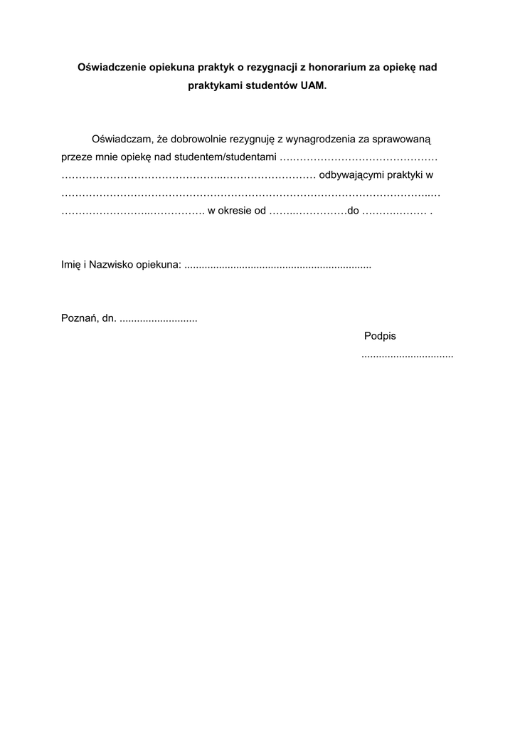 Oświadczenie opiekuna praktyk o rezygnacji z honorarium za opiekę nad praktykami studentów UAM. Oświadczam, Ŝe dobrowolnie rezygnuję z wynagrodzenia za sprawowaną przeze mnie opiekę nad studentem/studentami ….…………………………………… ………………………………………..……………………… odbywającymi praktyki w ……………………………………………………………………………………………..… ……………………..……………. w okresie od ……..……………do ……….……… . Imię i Nazwisko opiekuna: ................................................................. Poznań, dn. ........................... Podpis ................................