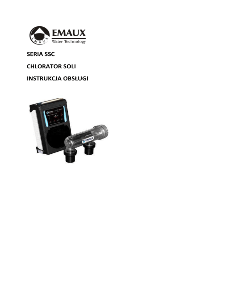 SERIA SSC CHLORATOR SOLI INSTRUKCJA OBSŁUGI Spis treści 1. Zasada działania .................................................................................................................................. 3 2. Zdjęcia produktu.................................................................................................................................. 3 3. Wymiary ............................................................................................................................................. 4 4. Warunki pracy ..................................................................................................................................... 4 5. Specyfikacja produktu ......................................................................................................................... 4 6. Funkcje urządzenia .............................................................................................................................. 5 7. Instrukcja montażu.............................................................................................................................. 6 8. Instalacja.............................................................................................................................................. 6 9. Pogląd na system................................................................................................................................. 7 10. Panel sterujący .................................................................................................................................. 9 11. Obsługa włącznika czasowego (dla niektórych modeli) .................................................................. 10 12. Konserwacja i rozwiązywanie problemów ...................................................................................... 11 EMAUX Chlorator soli Bezpieczny i skuteczny sposób na higieniczny basen 1. Zasada działania Chlorator wykorzystuje elektrolizę, aby rozbić sól NaCl dodaną do basenu w celu utworzenia Chloru (Cl2). Jednostka sterująca chloratora reguluje produkcję chloru przez zmianę prądu płynącego przez tytanową elektrodę w obudowie komórki elektrolitycznej. Podchloryn sodu tworzony z chloru jest bardzo dobrym czynnikiem odkażającym, który jest często stosowany w basenach; może on zatrzymać rozwój bakterii i grzybów. 2NaCl + 2H20 = 2NaOH + H2↑ + Cl2↑ Cl2 + 2NaOH = NaCl + NaClO + H20 2. Zdjęcia produktu B. Komórka Elektrolityczna C. Złączki uniwersalne 1,5”/2” A. Skrzynka sterujące chloratora soli D. Kable E. Bezpiecznik i śruby F. Instrukcja obsługi 3. Wymiary • Skrzynka sterująca: 360 x 220 x 135 mm • Komórka elektrolityczna: 380 x 118 x 130 mm 4. Warunki pracy • temperatura otoczenia 0°C – 50°C • Wilgotność ≤ 85% • Dobra wentylacja • Umieszczać z dala od źródeł ciepła 5. Specyfikacja produktu (1). Seria SSC-TLT (z podwodnym transformatorem świetlnym oraz włącznikiem czasowym) Model Napięcie wejściowe/ częstotliwość chloratora SSC115-TLT 220-250VAC 50/60Hz 100-120VAC 50/60Hz SSC25-TLT 220-250VAC 50/60Hz 100-120VAC 50/60Hz Wartość znamionowa (chlorator i podświetlenie podwodne) 100VA + 100VA (światło podwodne) 100VA + 100VA (światło podwodne) Wydajnoś Basen z włókna Basen ć komórki szklanego (litry) betonowy (litry) 15g/godz. 50 000 45 000 25g/godz. 75 000 70 000 (2). Seria SSC-T (z włącznikiem czasowym) Model SSC115-T SSC25-T SSC50-T Napięcie wejściowe/ częstotliwość chloratora 220-250VAC 50/60Hz 100-120VAC 50/60Hz 220-250VAC 50/60Hz 100-120VAC 50/60Hz 220-250VAC 50/60Hz 100-120VAC 50/60Hz Wartość znamionowa (chlorator i podświetlenie podwodne) 100VA 100VA 300VA Wydajnoś Basen z włókna Basen ć komórki szklanego (litry) betonowy (litry) 15g/godz. 50 000 45 000 25g/godz. 75 000 70 000 45g/godz. 120 000 110 000 (3). Seria SSC-E Model SSC15-E SSC25-E SSC50-E Napięcie wejściowe/ częstotliwość chloratora 220-250VAC 50/60Hz 100-120VAC 50/60Hz 220-250VAC 50/60Hz 100-120VAC 50/60Hz 220-250VAC 50/60Hz 100-120VAC 50/60Hz Wartość znamionowa (chlorator i podświetlenie podwodne) 100VA 160VA 300VA Wydajnoś Basen z włókna Basen ć komórki szklanego (litry) betonowy (litry) 15g/godz. 50 000 45 000 25g/godz. 75 000 70 000 45g/godz. 120 000 110 000 Uwaga: Tylko jedna pompa powinna być podłączana do chloratora soli, prąd pompy nie powinien przekroczyć 8A (dopuszczalne tylko dla serii SSC-TLT i SSC-T) Obliczanie poziomu chloru Standardowy poziom chloru: nie mniej niż 2mg/litr = 0,002 g/litr Przykład: Objętość basenu 65m3 = 65 000 litrów Współczynnik wymiany: 4 godziny 6. Funkcje urządzenia Wygoda i ciągłe dostarczanie czystego chloru – podstawowego środka odkażającego. Brak dodatkowych sztucznych substancji czyszczących, które mogłyby podrażnić skórę lub oczy. Wystarczy dodać naturalną sól do basenu. Ilość soli w basenie jest tak mała, iż nie można jej wyczuć smakiem ani węchem. Elektroda wykonana jest z tytanu a przez to jest wytrzymała i odporna na korozję. Łatwy w obsłudze i instalacji. Woda nie musi mieć zapachu chloru, ponieważ chlor nie jest dodawany bezpośrednio do wody. 7. Instrukcja montażu Jednostka sterująca 1. Wybrać wygodne, dobrze wentylowane miejsce znajdujące się w odległości jednego metra od zestawu filtrującego. 2. Standardy australijskie wymagają, aby sterująca jednostka elektryczna znajdowała się w odległości co najmniej 3 metrów od basenu. 3. Podłączyć jednostkę zasilającą do odpowiedniego gniazdka wodoszczelnego i podłączyć pompę do gniazda zasilającego jednostki zasilającej. 4. Zamocować jednostkę sterującą pionowo na słupie lub na ścianie 1,5m nad poziomem gruntu. 5. Jednostka musi być trzymana z daleka od kwasów oraz obszarów przechowywania chemikaliów. 6. Jednostka musi znajdować się z dala od źródeł ciepła Uwaga: -- Jednostka sterująca może być podłączona do jednej pompy i tylko