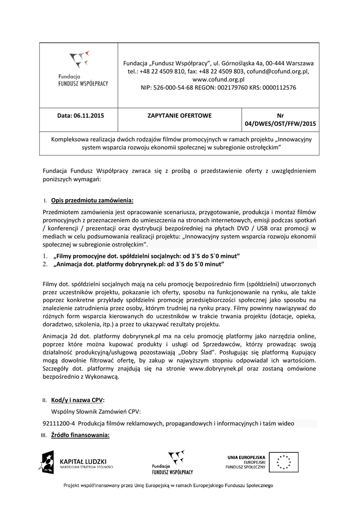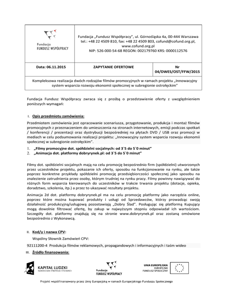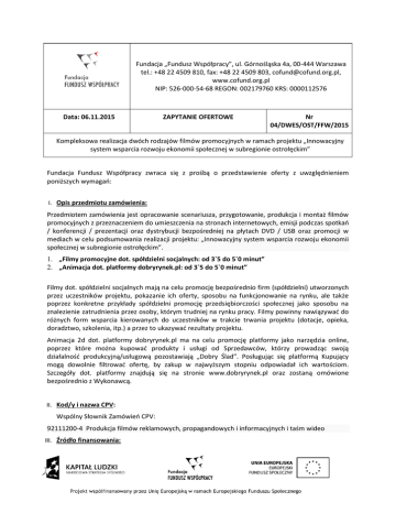 Fundacja „Fundusz Współpracy”, ul. Górnośląska 4a, 00-444 Warszawa tel.: +48 22 4509 810, fax: +48 22 4509 803, [email protected], www.cofund.org.pl NIP: 526-000-54-68 REGON: 002179760 KRS: 0000112576 Data: 06.11.2015 ZAPYTANIE OFERTOWE Nr 04/DWES/OST/FFW/2015 Kompleksowa realizacja dwóch rodzajów filmów promocyjnych w ramach projektu „Innowacyjny system wsparcia rozwoju ekonomii społecznej w subregionie ostrołęckim” Fundacja Fundusz Współpracy zwraca się z prośbą o przedstawienie oferty z uwzględnieniem poniższych wymagań: I. Opis przedmiotu zamówienia: Przedmiotem zamówienia jest opracowanie scenariusza, przygotowanie, produkcja i montaż filmów promocyjnych z przeznaczeniem do umieszczenia na stronach internetowych, emisji podczas spotkań / konferencji / prezentacji oraz dystrybucji bezpośredniej na płytach DVD / USB oraz promocji w mediach w celu podsumowania realizacji projektu: „Innowacyjny system wsparcia rozwoju ekonomii społecznej w subregionie ostrołęckim”. 1. „Filmy promocyjne dot. spółdzielni socjalnych: od 3`5 do 5`0 minut” 2. „Animacja dot. platformy dobryrynek.pl: od 3`5 do 5`0 minut” Filmy dot. spółdzielni socjalnych mają na celu promocję bezpośrednio firm (spółdzielni) utworzonych przez uczestników projektu, pokazanie ich oferty, sposobu na funkcjonowanie na rynku, ale także poprzez konkretne przykłady spółdzielni promocję przedsiębiorczości społecznej jako sposobu na znalezienie zatrudnienia przez osoby, którym trudniej na rynku pracy. Filmy powinny nawiązywać do różnych form wsparcia kierowanych do uczestników w trakcie trwania projektu (dotacje, opieka, doradztwo, szkolenia, itp.) a przez to ukazywać rezultaty projektu. Animacja 2d dot. platformy dobryrynek.pl ma na celu promocję platformy jako narzędzia online, poprzez które można kupować produkty i usługi od Sprzedawców, którzy prowadząc swoją działalność produkcyjną/usługową pozostawiają „Dobry Ślad”. Posługując się platformą Kupujący mogą dowolnie filtrować ofertę, by zakup w najwyższym stopniu odpowiadał ich wartościom. Szczegóły dot. platformy znajdują się na stronie www.dobryrynek.pl oraz zostaną omówione bezpośrednio z Wykonawcą. II. Kod/y i nazwa CPV: Wspólny Słownik Zamówień CPV: 92111200-4 Produkcja filmów reklamowych, propagandowych i informacyjnych i taśm wideo III. Źródło finansowania: Projekt „Innowacyjny system wsparcia rozwoju ekonomii społecznej w subregionie ostrołęckim”, współfinansowany ze środków Unii Europejskiej w ramach Europejskiego Funduszu Społecznego. IV. Miejsce i termin realizacji zamówienia: Każde z poszczególnych Zamówień powinno być zrealizowane w terminie zaproponowanym przez Wykonawcę, nie później niż do 30 listopada 2015 roku. miejsce dostawy: ul. Górnośląska 4a 00-444 Warszawa, V. Wymagania względem wykonawcy: Posiadanie przez Wykonawcę sprzętu oraz oprogramowania niezbędnego do poprawnego wykonania usługi (oświadczenie Wykonawcy); Wykonawca powinien udokumentować wykonanie w okresie ostatnich 3 lat co najmniej 5 filmów promocyjnych o podobnym charakterze. Filmy powinny stanowić załącznik do oferty lub Wykonawca powinien wskazać adres internetowy, pod którym można się ̨ z nimi zapoznać. L.p. Zamawiający Data realizacji Tytuł lub temat jakiego Adres strony www, gdzie film/ dotyczyła produkcja materiał można obejrzeć 1. 2. 3. VI. Kryteria oceny ofert: Lp. 1. 2. 3. 4. 5. Nazwa kryterium Cena - kryterium podstawowe Ocena jakości dotychczasowych produkcji – kryterium podstawowe Walory merytoryczne scenariusza – kryterium podstawowe ŁĄCZNIE Oferta złożona przez podmiot ekonomii społecznej – kryterium dodatkowe Oferta złożona przez przedsiębiorstwo zatrudniające osoby niepełnosprawne – kryterium dodatkowe Łącznie punkty za kryteria dodatkowe Liczba możliwych do uzyskania punktów 50 15 35 100 5 5 10 Sposób przyznawania punktacji za kryterium podstawowe 1. Punkty za kryterium „Cena” zostaną obliczone według wzoru: Cena oferty najtańszej --------------------------------- x liczba możliwych do uzyskania punktów (czyli 100) = liczba punktów Cena oferty badanej 2. Punkty za kryterium „Ocena jakości dotychczasowych produkcji” zostaną obliczone zgodnie z poniższą punktacją. Na ostateczną ocenę tego elementu składać się będzie średnia z cząstkowych ocen osób oceniających oferty, wśród których znajdą się m.in. główny specjalista ds. komunikacji w fundacji, kierownik działu odpowiedzialny za realizację projektu, specjalista ds. promocji projektu oraz koordynator ze strony partnera. a) oryginalność podejścia do prezentowanego tematu – max. 5 pkt b) atrakcyjność form przekazu i użytych narzędzi – max. 5 pkt c) spójność koncepcji – max. 5 pkt Łącznie w ramach tego elementu oceny można uzyskać 15 punktów. 3. Punkty za kryterium „Walory merytoryczne scenariusza” zostaną obliczone zgodnie z poniższą punktacją. Na ostateczną ocenę tego elementu składać się będzie średnia z cząstkowych ocen osób oceniających oferty, wśród których znajdą się m.in. główny specjalista ds. komunikacji w fundacji, kierownik działu odpowiedzialny za realizację projektu, specjalista ds. promocji projektu oraz koordynator ze strony partnera. a) oryginalność, atrakcyjność i spójność koncepcji – max. 10 pkt b) planowane do wykorzystania techniki realizacji i postprodukcji filmu wraz z uzasadnieniem – max. 10 pkt c) czytelność i prostota przekazu – max. 5 pkt d) zgodność z ideą projektu, przedstawienie treści związanych z promocją spółdzielni oraz działań projektowych, zidentyfikowanie obszarów ważnych z punktu widzenia ekonomii społecznej– max. 10 pkt Łącznie w ramach tego elementu oceny można uzyskać 35 punktów. Kryteria dodatkowe Oferta złożona przez podmiot ekonomii społecznej Zgodnie z definicją zapisaną w Szczeg