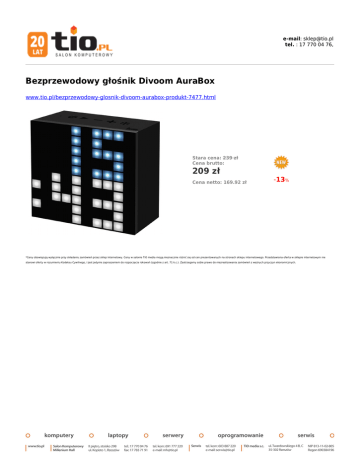 e-mail: [email protected] tel. : 17 770 04 76, Bezprzewodowy głośnik Divoom AuraBox www.tio.pl/bezprzewodowy-glosnik-divoom-aurabox-produkt-7477.html Stara cena: 239 zł Cena brutto: 209 zł Cena netto: 169.92 zł -13% *Ceny obowiązują wyłącznie przy składaniu zamówień przez sklep internetowy. Ceny w salonie TiO media mogą nieznacznie różnić się od cen prezentowanych na stronach sklepu internetowego. Przedstawiona oferta w sklepie internetowym nie stanowi oferty w rozumieniu Kodeksu Cywilnego, i jest jedynie zaproszeniem do rozpoczęcia rokowań (zgodnie z art. 71 k.c.). Zastrzegamy sobie prawo do niezrealizowania zamówień z ważnych przyczyn ekonomicznych.