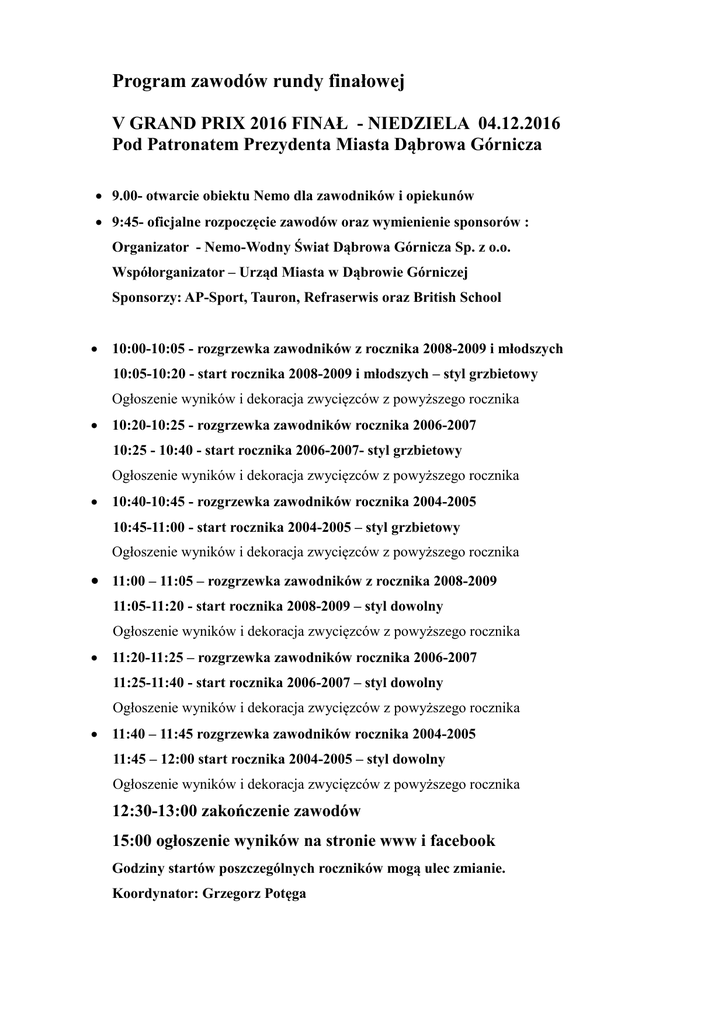 Program zawodów rundy finałowej V GRAND PRIX 2016 FINAŁ - NIEDZIELA 04.12.2016 Pod Patronatem Prezydenta Miasta Dąbrowa Górnicza 9.00- otwarcie obiektu Nemo dla zawodników i opiekunów 9:45- oficjalne rozpoczęcie zawodów oraz wymienienie sponsorów : Organizator - Nemo-Wodny Świat Dąbrowa Górnicza Sp. z o.o. Współorganizator – Urząd Miasta w Dąbrowie Górniczej Sponsorzy: AP-Sport, Tauron, Refraserwis oraz British School 10:00-10:05 - rozgrzewka zawodników z rocznika 2008-2009 i młodszych 10:05-10:20 - start rocznika 2008-2009 i młodszych – styl grzbietowy Ogłoszenie wyników i dekoracja zwycięzców z powyższego rocznika 10:20-10:25 - rozgrzewka zawodników rocznika 2006-2007 10:25 - 10:40 - start rocznika 2006-2007- styl grzbietowy Ogłoszenie wyników i dekoracja zwycięzców z powyższego rocznika 10:40-10:45 - rozgrzewka zawodników rocznika 2004-2005 10:45-11:00 - start rocznika 2004-2005 – styl grzbietowy Ogłoszenie wyników i dekoracja zwycięzców z powyższego rocznika 11:00 – 11:05 – rozgrzewka zawodników z rocznika 2008-2009 11:05-11:20 - start rocznika 2008-2009 – styl dowolny Ogłoszenie wyników i dekoracja zwycięzców z powyższego rocznika 11:20-11:25 – rozgrzewka zawodników rocznika 2006-2007 11:25-11:40 - start rocznika 2006-2007 – styl dowolny Ogłoszenie wyników i dekoracja zwycięzców z powyższego rocznika 11:40 – 11:45 rozgrzewka zawodników rocznika 2004-2005 11:45 – 12:00 start rocznika 2004-2005 – styl dowolny Ogłoszenie wyników i dekoracja zwycięzców z powyższego rocznika 12:30-13:00 zakończenie zawodów 15:00 ogłoszenie wyników na stronie www i facebook Godziny startów poszczególnych roczników mogą ulec zmianie. Koordynator: Grzegorz Potęga