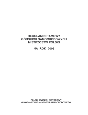 REGULAMIN RAMOWY GÓRSKICH SAMOCHODOWYCH MISTRZOSTW POLSKI NA ROK 2006 POLSKI ZWI ZEK MOTOROWY GŁÓWNA KOMISJA SPORTU SAMOCHODOWEGO Regulamin Górskich Samochodowych Mistrzostw Polski 1. USTALENIA OGÓLNE 1.1. Górskie Samochodowe Mistrzostwa Polski (zwane dalej GSMP) s własno ci Polskiego Zwi zku Motorowego (zwanego dalej PZM). 1.2. Nadzór nad przebiegiem GSMP sprawuje Główna Komisja Sportu Samochodowego PZM (zwana dalej GKSS), która zastrzega sobie prawo interpretacji niniejszego regulaminu i jest jedyn władz upowa nion do rozpatrywania i rozstrzygania wszelkich rozbie no ci i w tpliwo ci, które mog powsta przy stosowaniu i interpretacji niniejszego regulaminu i innych przepisów, w oparciu o które rozgrywane s GSMP, oraz do podejmowania decyzji. 1.3. GSMP rozgrywane s w oparciu o nast puj ce przepisy: • Mi dzynarodowy Kodeks Sportowy FIA wraz z zał cznikami • niniejszy Regulamin Ramowy rozgrywek wraz z zał cznikami, uznany za obowi zuj cy we wszystkich rundach GSMP w roku 2006. Zaleca si jego stosowanie w innych imprezach o charakterze wy cigów górskich rozgrywanych na terenie Polski. 1.4.Rundy GSMP rozgrywane s na zamkni tej trasie wy cigu, wył czonej z ruchu drogowego. Podczas podjazdów treningowych i wy cigowych nie obowi zuj przepisy „Prawa o ruchu drogowym”. 2. KALENDARZ IMPREZ 2.1. Do GSMP b d zaliczane zawody umieszczone w oficjalnym kalendarzu sportowym PZM na rok 2006, zwane dalej rundami. 2.2. Rundy GSMP mog by rozgrywane poza granicami Polski. W cyklu GSMP 2006 rozegrane zostan 12 – 14 02 – 04 07 – 09 14 – 16 04 – 06 maja..................... czerwca ............... lipca ......... ............ lipca ......... ............ sierpnia ................ 18 – 20 15 – 17 06 – 08 20 – 22 sierpnia ............... wrze nia .............. pa dziernika ........ pa dziernika ........ nast puj ce zawody: Sienna I i II runda Zału III i IV runda Sopot V i VI runda Vsetin ( Czechy ) tylko “Puchar 3 Kopców” Banovce nad Bebravou ( Słowacja ) VII i VIII runda GSMP i “Puchar 3 Kopców” Ro ciszów IX i X runda Szczyrk XI i XII runda i “Puchar 3 Kopców” Korczyna XIII i XIV runda Góra w. Anny XV i XVI runda 2 Regulamin Górskich Samochodowych Mistrzostw Polski 3. OGÓLNE WARUNKI DOTYCZ CE TRASY I PRZEBIEGU GSMP 3.1. GSMP to wy cigi samochodowe rozgrywane na trasie, która powinna prowadzi pod gór . Zawodnicy startuj pojedynczo, rywalizuj c ze sob uzyskanymi czasami przejazdu. 3.2. Wy cigi mog si odbywa wył cznie na trasach posiadaj cych aktualn homologacj PZM - tzw. Licencj Krajow . 3.3. Trasa musi odpowiada nast puj cym warunkom: • długo trasy - ł czna długo podjazdów wy cigowych w rundzie min. 5 km; • szeroko trasy - minimum 5 m; zw enia do minimalnej szeroko ci 4 m s dopuszczalne dla odcinków o ograniczonej długo ci pod warunkiem, e widoczno na ka dym z tych odcinków odpowiada drodze hamowania, a suma ich długo ci nie przekracza 10% całkowitej długo ci trasy; • szczegółowy sposób zabezpieczenia trasy, wraz z wykazem stosowanych zabezpiecze okre laj warunki Licencji Krajowej wydanej przez PZM. 3.4. Organizator powinien wyst pi do Komisji Bezpiecze stwa Torów PZM o przeprowadzenie homologacji trasy: • na 60 dni przed zawodami, dla tras posiadaj cych Licencj Krajow z poprzednich lat • na 90 dni przed zawodami, dla tras nowych. Ka da zmiana trasy lub jej modyfikacja w stosunku do warunków okrelonych przez Licencj Krajow wymaga ponownej procedury homologacyjnej. 3.5. Do odbioru trasy przez Zespół S dziów Sportowych (zwany dalej ZSS) w dniu zawodów, niezb dne jest przedstawienie aktualnej Licecncji Krajowej wraz z zał cznikami i Planu Zabezpieczenia Wy cigu. 3.6. Organizator powinien zadba o odpowiedni opraw , godn imprezy o randze Mistrzostw Polski i maksymalne rozpropagowanie zawodów w regionie. 3.7. Organizator powinien wyda i szeroko kolportowa program zawodów – informator dla widzów, w którym b d tak e zalecenia dotycz ce bezpiecznego ogl dania wy cigu. 3.8. Zaleca si wyznaczenie stref dla widzów w najbardziej atrakcyjnych miejscach na trasie wy cigu oraz zapewnienie infrastruktury w takich miejscach (mała gastronomia, sanitariaty, punkty sprzeda y programów, pami tek, nagło nienie). 3 Regulamin Górskich Samochodowych Mistrzostw Polski 4. DOPUSZCZONE SAMOCHODY – PODZIAŁ NA GRUPY I KLASY 4.1. Do startu w rundach GSMP dopuszczone b d nast puj ce samochody spełniaj ce wymogi Regulaminu Technicznego GSMP (zał. Nr 1), z podziałem na grupy i klasy według pojemno ci skokowej silnika: Kategoria I Grupa N – FIA; A - FIA (w tym WRC i Kit-Car; do 1150 cm3 – powy ej 1150 do 1600 cm3 powy ej 1600 do 2000 cm3 powy ej 2000 cm3 H – krajowa; Klasa VW Golf Castrol Cup – zgodnie z Regulaminem Pucharu VW - WSMP; Klasa KIA Picanto – zgodnie z Regulaminem Pucharu KIA - WSMP; Kategoria II Grupa E do 1300 cm3 powy ej 1300 do 1600 cm3 powy ej 1600 do 2000 cm3 F3 Grupa CN + C3 do 3000 cm3 Samochody historyczne – zgodnie z Reg. Techn. GSMP na 2006r. Grupa HS do 750 cm3 powy ej 750 do 1500 cm3 powy ej 1500 do 2000 cm3 powy ej 2000 cm3 Klasa Hobby Replika - HR Klasa Formuła - HF 4.2. Wyposa enie bezpiecze stwa wszystkich pojazdów musi odpowiada przepisom podanym w aktualnym Zał czniku „J” FIA dla rajdów lub wy cigów (nie dotyczy samochodów historycznych). Wszystkie samochody musz posiada siatki ochronne na bocznej szybie od strony kierowcy, zgodne z zał. „J” , lub szyba musi by oklejona foli . 4 Regulamin Górskich Samochodowych Mistrzostw Polski 4.3. Podczas zawodów mo e by u ywane tylko paliwo zgodne z przepisami podanymi w Zał czniku „J” FIA (nie dotyczy samochodów historycznych). 4.4. W grupach N i A samochody posiadaj ce silnik z turbodoładowaniem musz by wyposa one w ogranicznik okre lony w zał czniku „J” FIA. 4.5. Ka dy samochód nie posiadaj cy wystarczaj cych rodków bezpiecze stwa lub nie spełniaj cy obowi zuj cych przepisów nie zostanie dopuszczony, albo zostanie wy