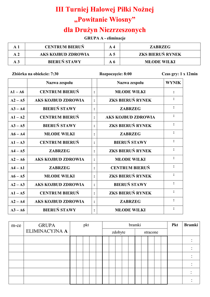 III Turniej Halowej Piłki Nożnej „Powitanie Wiosny” dla Drużyn Niezrzeszonych GRUPA A - eliminacje A1 CENTRUM BIERUŃ A4 ZABRZEG A2 AKS KOJBUD ZDROWIA A5 ZKS BIERUŃ RYNEK A3 BIERUŃ STAWY A6 MŁODE WILKI Zbiórka na obiekcie: 7:30 Rozpoczęcie: 8:00 Nazwa zespołu Czas gry: 1 x 12min Nazwa zespołu WYNIK A1 – A6 CENTRUM BIERUŃ : MŁODE WILKI : A2 – A5 AKS KOJBUD ZDROWIA : ZKS BIERUŃ RYNEK : A3 – A4 BIERUŃ STAWY : ZABRZEG : A1 – A2 CENTRUM BIERUŃ : AKS KOJBUD ZDROWIA : A3 – A5 BIERUŃ STAWY : ZKS BIERUŃ RYNEK : A6 – A4 MŁODE WILKI : ZABRZEG : A1 – A3 CENTRUM BIERUŃ : BIERUŃ STAWY : A4 – A5 ZABRZEG : ZKS BIERUŃ RYNEK : A2 – A6 AKS KOJBUD ZDROWIA : MŁODE WILKI : A4 – A1 ZABRZEG : CENTRUM BIERUŃ : A6 – A5 MŁODE WILKI : ZKS BIERUŃ RYNEK : A2 – A3 AKS KOJBUD ZDROWIA : BIERUŃ STAWY : A1 – A5 CENTRUM BIERUŃ : ZKS BIERUŃ RYNEK : A2 – A4 AKS KOJBUD ZDROWIA : ZABRZEG : A3 – A6 BIERUŃ STAWY : MŁODE WILKI : m-ce GRUPA ELIMINACYJNA A pkt bramki zdobyte Pkt Bramki stracone : : : : : :