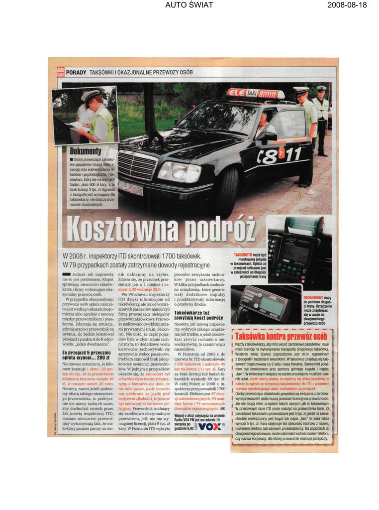 AUTO ¦WIAT 2008-08-18 PORADY TAKSÓWKI I OKAZJONALNE PRZEWOZY OSÓB Osoby przewożące zarobko wo pasażerów muszą mieć cencję oraz ważne badania le karskie i psychologiczne. Tak sówkarz, który nie ma ważnych badań, płaci 500 zt kary, a za brak licencji 3 tys. zl. Egzamin ? topografii jest wymagany dla taksówkarzy, nie dotyczy prze wozów okazjonalnych If W 2008 r. inspektorzy ITD skontrolowali 1700 taksówek. W 79 przypadkach zostały zatrzymane dowody rejestracyjne M 1 Jednak tak naprawdę nie to jest problemem. Kłopot sprawiają nieuczciwi taksów karze i firmy wykonujące oka zjonalny przewóz osób. W przypadku okazjonalnego przewozu osób opłata nalicza na jest według wskazań drogo mierza albo zgodnie z umową między przewoźnikiem i pasa żerem. Zdarzają się sytuacje, gdy nieuczciwy przewoźnik na pytanie, ile będzie kosztował przejazd z punktu A do B odpo wiada: , jeden dwadzieścia". Za przejazd 5 przecznic opłata wynosi... 200 zl Nie zawsze oznacza to, że kilo metr kosztuje 1 złoty i 20 gro szy, ale np., że za przejechanie kilometra kierowca zażąda 20 zł, a czasami nawet 20 euro. Niestety, nawet jeżeli padnie my ofiarą takiego nieuczciwe go przewoźnika, to praktycz nie nie mamy żadnych szans, aby dochodzić swoich praw. Jak mówią inspektorzy ITD, czasami nieuczciwi przewoź nicy wykorzystują fakt, że ma ło który pasażer patrzy na cen nik naklejony na szybie. Zdarza się, że przecinek prze sunięty jest o 1 miejsce i za miast 2,00 widnieje 20,0. We Wrocławiu inspektorzy ITD dzięki informacjom od taksówkarzy, ale też od wystra szonych pasażerów namierzyli firmę prowadzącą nielegalny przewóz taksówkowy. Przewo zy realizowano zwykłymi auta mi prywatnymi (m.in. Seicen to). Nie dość, że część pojaz dów była w złym stanie tech nicznym, to dodatkowo wielu kierowców zachowywało się agresywnie wobec pasażerów. Problem stanowił brak jakiej kolwiek ewidencji przewoźni ków. W jednym z przypadków okazało się, że samochód był w bardzo złym stanie technicz nym, a kierowca nie dość, że nie miał prawa jazdy (zostało mu odebrane za jazdę pod wpływem alkoholu), to jeszcze był notowany w kartotece po licyjnej. Przewoźnik trudniący się zarobkowo okazjonalnym przewozem, jeśli nie ma wy maganej licencji, płaci 8 tys. zł kary. W Poznaniu ITD wykryło proceder zawyżania rachun ków przez taksówkarzy. W kilku przypadkach znalezio no urządzenia, które genero wały dodatkowe impulsy i przekłamywały informację o przebytej drodze. Taksówkarze też zawyżają koszt podróży Niestety, jak mówią inspekto rzy, wykrycie takiego urządze nia jest trudne, a jeżeli taksów karz zawyża rachunki o nie wielką kwotę, to czasmi wręcz niemożliwe. W Poznaniu od 2005 r. do czerwca br. ITD skontrolowało 1550 taksówek i nałożyło 49 kar na kwotę 111 tys. zl. Kary za brak licencji lub badań le karskich wyniosły 69 tys. zł. W całej Polsce w 2008 r. in spektorzy przeprowadzili 1700 kontroli. Efektem jest 47 decy zji administracyjnych, 93 man daty karne i 79 zatrzymanych dowodów rejestracyjnych. MK Więcej o akcji usłyszysz na antenie Radia V0X FM już we wtorek 19 sierpnia po g u A y FM godzinie 9.00 g W%0Mk. TAKSOMETR może być montowany jedynie w taksówkach. Opłata za przejazd naliczana jest w zależności od długości przejechanej trasy DROGOMIERZ służy do pomiaru długoś ci trasy. Urządzenie może znajdować się w aucie do okazjonalnego przewozu osób Taksówka kontra przewóz osób Każdy z taksówkarzy, aby móc wozić zarobkowo pasażerów, musi mieć licencję na wykonywanie transportu drogowego taksówką. Wydanie takiej licencji poprzedzone jest m.in. egzaminem z topografii i badaniami lekarskimi. W taksówce znajdują się tak sometr (legalizowany co 2 lata) i kasa fiskalna. Samochód powi nien być oznakowany przy pomocy górnego koguta i napisu „taxi". W widocznym miejscu na szybie przyklejony musi być cen nik opłat. Jeżeli mamy obawy, że staliśmy się ofiarą oszustwa, to należy to zgłosić do korporacji taksówkowej i do ITD z podaniem numeru rejestracyjnego auta i rachunkiem za przejazd. Osoby prowadzące działalność gospodarczą związaną z zarobko wym przewozem osób muszą posiadać licencję na przewóz osób. ale nie mogą mieć urządzeń takich samych jak w taksówkach. W przeciwnym razie ITD może nałożyć na przewoźnika karę. Za posiadanie taksometru przewidziane jest 5 tys. z), jeżeli na samo chodzie umieszczony jest kogut lub napis „taxi" to kara także wynosi 5 tys. zl. Kara obejmuje też obecność nadruku z nazwą, numerem telefonu lub adresem przedsiębiorcy. Na pojazdach do okazjonalnego przewozu może natomiast widnieć numer telefonu czy nazwa korporacji, dla której przewoźnik realizuje przejazdy.