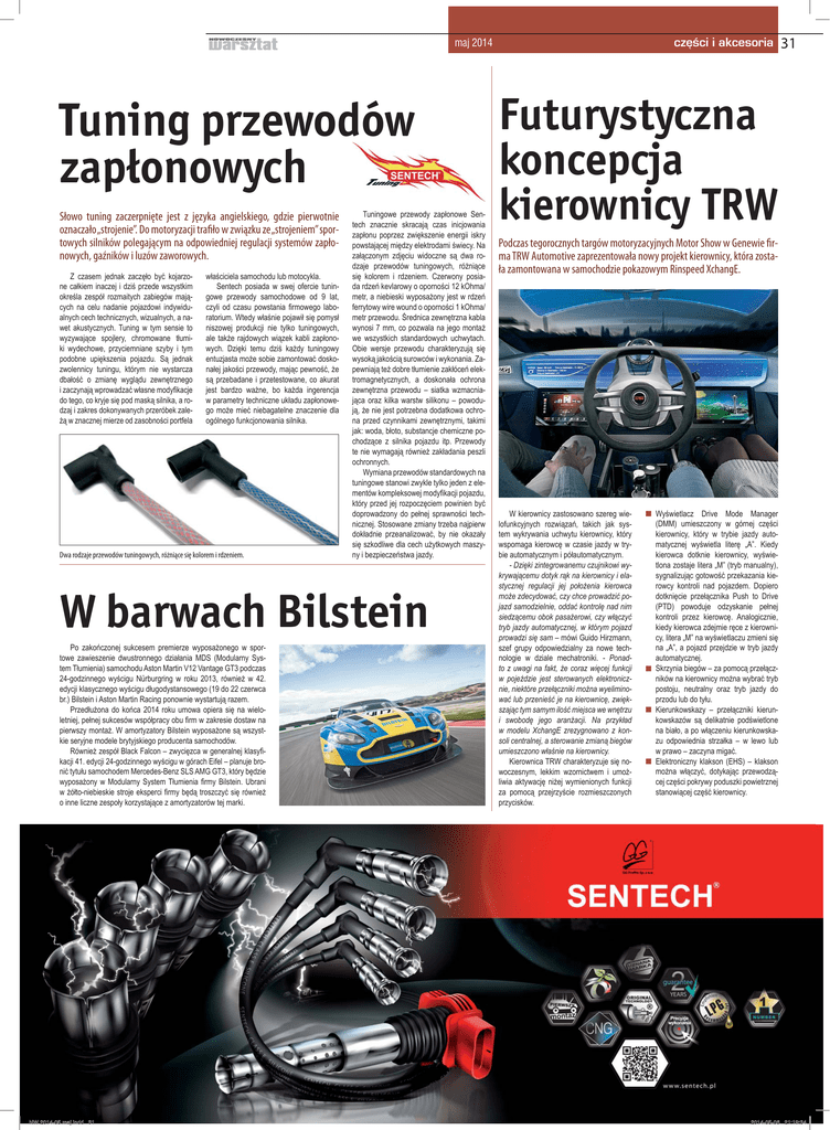 części i akcesoria maj 2014 Tuning przewodów zapłonowych Słowo tuning zaczerpnięte jest z języka angielskiego, gdzie pierwotnie oznaczało „strojenie”. Do motoryzacji trafiło w związku ze „strojeniem” sportowych silników polegającym na odpowiedniej regulacji systemów zapłonowych, gaźników i luzów zaworowych. Z czasem jednak zaczęło być kojarzone całkiem inaczej i dziś przede wszystkim określa zespół rozmaitych zabiegów mających na celu nadanie pojazdowi indywidualnych cech technicznych, wizualnych, a nawet akustycznych. Tuning w tym sensie to wyzywające spojlery, chromowane tłumiki wydechowe, przyciemniane szyby i tym podobne upiększenia pojazdu. Są jednak zwolennicy tuningu, którym nie wystarcza dbałość o zmianę wyglądu zewnętrznego i zaczynają wprowadzać własne modyfikacje do tego, co kryje się pod maską silnika, a rodzaj i zakres dokonywanych przeróbek zależą w znacznej mierze od zasobności portfela właściciela samochodu lub motocykla. Sentech posiada w swej ofercie tuningowe przewody samochodowe od 9 lat, czyli od czasu powstania firmowego laboratorium. Wtedy właśnie pojawił się pomysł niszowej produkcji nie tylko tuningowych, ale także rajdowych wiązek kabli zapłonowych. Dzięki temu dziś każdy tuningowy entuzjasta może sobie zamontować doskonałej jakości przewody, mając pewność, że są przebadane i przetestowane, co akurat jest bardzo ważne, bo każda ingerencja w parametry techniczne układu zapłonowego może mieć niebagatelne znaczenie dla ogólnego funkcjonowania silnika. Dwa rodzaje przewodów tuningowych, różniące się kolorem i rdzeniem. Tuningowe przewody zapłonowe Sentech znacznie skracają czas inicjowania zapłonu poprzez zwiększenie energii iskry powstającej między elektrodami świecy. Na załączonym zdjęciu widoczne są dwa rodzaje przewodów tuningowych, różniące się kolorem i rdzeniem. Czerwony posiada rdzeń kevlarowy o oporności 12 kOhma/ metr, a niebieski wyposażony jest w rdzeń ferrytowy wire wound o oporności 1 kOhma/ metr przewodu. Średnica zewnętrzna kabla wynosi 7 mm, co pozwala na jego montaż we wszystkich standardowych uchwytach. Obie wersje przewodu charakteryzują się wysoką jakością surowców i wykonania. Zapewniają też dobre tłumienie zakłóceń elektromagnetycznych, a doskonała ochrona zewnętrzna przewodu – siatka wzmacniająca oraz kilka warstw silikonu – powodują, że nie jest potrzebna dodatkowa ochrona przed czynnikami zewnętrznymi, takimi jak: woda, błoto, substancje chemiczne pochodzące z silnika pojazdu itp. Przewody te nie wymagają również zakładania peszli ochronnych. Wymiana przewodów standardowych na tuningowe stanowi zwykle tylko jeden z elementów kompleksowej modyfikacji pojazdu, który przed jej rozpoczęciem powinien być doprowadzony do pełnej sprawności technicznej. Stosowane zmiany trzeba najpierw dokładnie przeanalizować, by nie okazały się szkodliwe dla cech użytkowych maszyny i bezpieczeństwa jazdy. W barwach Bilstein Po zakończonej sukcesem premierze wyposażonego w sportowe zawieszenie dwustronnego działania MDS (Modularny System Tłumienia) samochodu Aston Martin V12 Vantage GT3 podczas 24-godzinnego wyścigu Nürburgring w roku 2013, również w 42. edycji klasycznego wyścigu długodystansowego (19 do 22 czerwca br.) Bilstein i Aston Martin Racing ponownie wystartują razem. Przedłużona do końca 2014 roku umowa opiera się na wieloletniej, pełnej sukcesów współpracy obu firm w zakresie dostaw na pierwszy montaż. W amortyzatory Bilstein wyposażone są wszystkie seryjne modele brytyjskiego producenta samochodów. Również zespół Black Falcon – zwycięzca w generalnej klasyfikacji 41. edycji 24-godzinnego wyścigu w górach Eifel – planuje bronić tytułu samochodem Mercedes-Benz SLS AMG GT3, który będzie wyposażony w Modularny System Tłumienia firmy Bilstein. Ubrani w żółto-niebieskie stroje eksperci firmy będą troszczyć się również o inne liczne zespoły korzystające z amortyzatorów tej marki. NW 2014-05 maj.indd 31 31 Futurystyczna koncepcja kierownicy TRW Podczas tegorocznych targów motoryzacyjnych Motor Show w Genewie firma TRW Automotive zaprezentowała nowy projekt kierownicy, która została zamontowana w samochodzie pokazowym Rinspeed XchangE. W kierownicy zastosowano szereg wielofunkcyjnych rozwiązań, takich jak system wykrywania uchwytu kierownicy, który wspomaga kierowcę w czasie jazdy w trybie automatycznym i półautomatycznym. - Dzięki zintegrowanemu czujnikowi wykrywającemu dotyk rąk na kierownicy i elastycznej regulacji jej położenia kierowca może zdecydować, czy chce prowadzić pojazd samodzielnie, oddać kontrolę nad nim siedzącemu obok pasażerowi, czy włączyć tryb jazdy automatycznej, w którym pojazd prowadzi się sam – mówi Guido Hirzmann, szef grupy odpowiedzialny za nowe technologie w dziale mechatroniki. - Ponadto z uwagi na fakt, że coraz więcej funkcji w pojeździe jest sterowanych elektronicznie, niektóre przełączniki można wyeliminować lub przenieść je na kierownicę, zwiększając tym samym ilość miejsca we wnętrzu i swobodę jego aranżacji. Na przykład w modelu XchangE zrezygnowano z konsoli centralnej, a sterowanie zmianą biegów umieszczono właśnie na kierownicy. Kierownica TRW charakteryzuje się nowoczesnym, lekkim wzornictwem i umożliwia aktywację niżej wymienionych funkcji za pomocą przejrzyście rozmieszczonych przycisków. Wyświetlacz Drive Mode Manager (DMM) umieszczony w górnej części kierownicy, który w trybie jazdy automatycznej wyświetla literę „A”. Kiedy kierowca dotknie kierownicy, wyświetlona zostaje litera „M” (tryb manualny), sygnalizując gotowość przekazania kierowcy kontroli nad pojazdem. Dopiero dotknięcie przełącznika Push to Drive (PTD) powoduje odzyskanie pełnej kontroli przez kierowcę. Analogicznie, kiedy kierowca zdejmie ręce z kierownicy, litera „