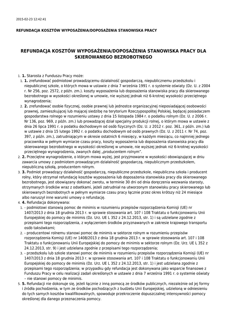 2015-02-23 12:42:41 REFUNDACJA KOSZTÓW WYPOSAŻENIA/DOPOSAŻENIA STANOWISKA PRACY REFUNDACJA KOSZTÓW WYPOSAŻENIA/DOPOSAŻENIA STANOWISKA PRACY DLA SKIEROWANEGO BEZROBOTNEGO 1. Starosta z Funduszu Pracy może: 1. zrefundować podmiotowi prowadzącemu działalność gospodarczą, niepublicznemu przedszkolu i niepublicznej szkole, o których mowa w ustawie z dnia 7 września 1991 r. o systemie oświaty (Dz. U. z 2004 r. Nr 256, poz. 2572, z późn. zm.). koszty wyposażenia lub doposażenia stanowiska pracy dla skierowanego bezrobotnego w wysokości określonej w umowie, nie wyższej jednak niż 6-krotnej wysokości przeciętnego wynagrodzenia; 2. 2. zrefundować osobie fizycznej, osobie prawnej lub jednostce organizacyjnej nieposiadającej osobowości prawnej, zamieszkującej lub mającej siedzibę na terytorium Rzeczypospolitej Polskiej, będącej posiadaczem gospodarstwa rolnego w rozumieniu ustawy z dnia 15 listopada 1984 r. o podatku rolnym (Dz. U. z 2006 r. Nr 136, poz. 969, z późn. zm.) lub prowadzącej dział specjalny produkcji rolnej, o którym mowa w ustawie z dnia 26 lipca 1991 r. o podatku dochodowym od osób fizycznych (Dz. U. z 2012 r. poz. 361, z późn. zm.) lub w ustawie z dnia 15 lutego 1992 r. o podatku dochodowym od osób prawnych (Dz. U. z 2011 r. Nr 74, poz. 397, z późn. zm.), zatrudniającym w okresie ostatnich 6 miesięcy, w każdym miesiącu, co najmniej jednego pracownika w pełnym wymiarze czasu pracy, koszty wyposażenia lub doposażenia stanowiska pracy dla skierowanego bezrobotnego w wysokości określonej w umowie, nie wyższej jednak niż 6-krotnej wysokości przeciętnego wynagrodzenia, zwanych dalej „producentem rolnym”. 2. 2. Przeciętne wynagrodzenie, o którym mowa wyżej, jest przyjmowane w wysokości obowiązującej w dniu zawarcia umowy z podmiotem prowadzącym działalność gospodarczą, niepublicznym przedszkolem, niepubliczną szkołą, producentem rolnym. 3. 3. Podmiot prowadzący działalność gospodarczą, niepubliczne przedszkole, niepubliczna szkoła i producent rolny, który otrzymał refundację kosztów wyposażenia lub doposażenia stanowiska pracy dla skierowanego bezrobotnego, jest obowiązany dokonać zwrotu, w terminie 30 dni od dnia doręczenia wezwania starosty, otrzymanych środków wraz z odsetkami, jeżeli zatrudniał na utworzonym stanowisku pracy skierowanego lub skierowanych bezrobotnych w pełnym wymiarze czasu pracy łącznie przez okres krótszy niż 24 miesiące albo naruszył inne warunki umowy o refundację. 4. 4. Refundacja dokonywana: 1. - podmiotowi stanowią pomoc de minimis w rozumieniu przepisów rozporządzenia Komisji (UE) nr 1407/2013 z dnia 18 grudnia 2013 r. w sprawie stosowania art. 107 i 108 Traktatu o funkcjonowaniu Unii Europejskiej do pomocy de minimis (Dz. Urz. UE L 352 z 24.12.2013, str. 1) i są udzielane zgodnie z przepisami tego rozporządzenia, z wyłączeniem środków przyznawanych w zakresie krajowego transportu osób taksówkami; 2. - producentowi rolnemu stanowi pomoc de minimis w sektorze rolnym w rozumieniu przepisów rozporządzenia Komisji (UE) nr 1408/2013 z dnia 18 grudnia 2013 r. w sprawie stosowania art. 107 i 108 Traktatu o funkcjonowaniu Unii Europejskiej do pomocy de minimis w sektorze rolnym (Dz. Urz. UE L 352 z 24.12.2013, str. 9) i jest udzielana zgodnie z przepisami tego rozporządzenia; 3. - przedszkolu lub szkole stanowi pomoc de minimis w rozumieniu przepisów rozporządzenia Komisji (UE) nr 1407/2013 z dnia 18 grudnia 2013 r. w sprawie stosowania art. 107 i 108 Traktatu o funkcjonowaniu Unii Europejskiej do pomocy de minimis (Dz. Urz. UE L 352 z 24.12.2013, str. 1) i jest udzielana zgodnie z przepisami tego rozporządzenia; w przypadku gdy refundacja jest dokonywana jako wsparcie finansowe z Funduszu Pracy w celu realizacji zadań określonych w ustawie z dnia 7 września 1991 r. o systemie oświaty – nie stanowi pomocy de minimis. 5. 5. Refundacji nie dokonuje się, jeżeli łącznie z inną pomocą ze środków publicznych, niezależnie od jej formy i źródła pochodzenia, w tym ze środków pochodzących z budżetu Unii Europejskiej, udzieloną w odniesieniu do tych samych kosztów kwalifikowalnych, spowoduje przekroczenie dopuszczalnej intensywności pomocy określonej dla danego przeznaczenia pomocy. 1. 1. 6. Wniosek o refundację może być przez starostę uwzględniony w przypadku, gdy podmiot, przedszkole lub szkoła spełniają łącznie warunki określone w przepisach prawa oraz gdy złożony wniosek jest kompletny i prawidłowo sporządzony, a starosta dysponuje środkami na jego sfinansowanie. 7. 7. O uwzględnieniu lub odmowie uwzględnienia wniosku o refundację starosta powiadamia podmiot, przedszkole, szkołę lub producenta rolnego w formie pisemnej w terminie 30 dni od dnia złożenia kompletnego wniosku. W przypadku nieuwzględnienia wniosku starosta podaje przyczynę odmowy. 8. 8. Podstawą refundacji jest umowa zawarta przez starostę z podmiotem, przedszkolem, szkołą lub producentem rolnym. 9. 9. Umowa o refundację zawierana jest pisemnie pod rygorem nieważności oraz zawiera w szczególności zobowiązanie podmiotu, przedszkola, szkoły lub producenta rolnego do: 1. 1. zatrudnienia na wyposażonym lub doposażonym stanowisku pracy w pełnym wymiarze czasu pracy skierowanego bezrobotnego przez okres co najmniej 24 miesięcy; 2. 2. utrzymania przez okres co najmniej 24 miesięcy stanowisk pracy utworzonych w związku z przyznaną refundacją; 3. 3. złożenia rozliczenia zawierającego zestawienie kwot wydatkowanych od dnia zawarcia umowy o refundację na poszczególne wydatki ujęte w szczegółowej specyfikacji wydatków dotyczących wyposażenia lub doposażenia stanowiska pracy, w szczególności na zakup środków trwałych, urządzeń, maszyn, w tym środków niezbędnych do zapewnienia zgodności stanowiska pracy z przepisami bezpieczeństwa i higieny pracy oraz wymaganiami ergonomii; 4. 4. zwrotu otrzymanych środków wraz z od