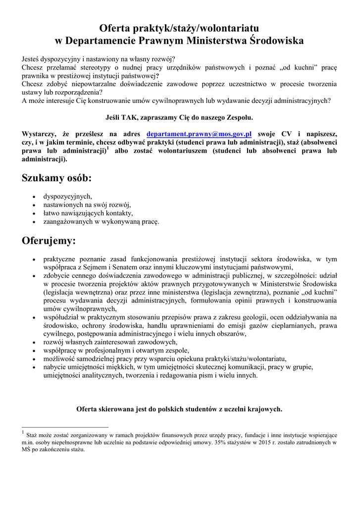Oferta praktyk/staży/wolontariatu w Departamencie Prawnym Ministerstwa Środowiska Jesteś dyspozycyjny i nastawiony na własny rozwój? Chcesz przełamać stereotypy o nudnej pracy urzędników państwowych i poznać „od kuchni” pracę prawnika w prestiżowej instytucji państwowej? Chcesz zdobyć niepowtarzalne doświadczenie zawodowe poprzez uczestnictwo w procesie tworzenia ustawy lub rozporządzenia? A może interesuje Cię konstruowanie umów cywilnoprawnych lub wydawanie decyzji administracyjnych? Jeśli TAK, zapraszamy Cię do naszego Zespołu. Wystarczy, że prześlesz na adres [email protected] swoje CV i napiszesz, czy, i w jakim terminie, chcesz odbywać praktyki (studenci prawa lub administracji), staż (absolwenci prawa lub administracji)1 albo zostać wolontariuszem (studenci lub absolwenci prawa lub administracji). Szukamy osób: dyspozycyjnych, nastawionych na swój rozwój, łatwo nawiązujących kontakty, zaangażowanych w wykonywaną pracę. Oferujemy: praktyczne poznanie zasad funkcjonowania prestiżowej instytucji sektora środowiska, w tym współpraca z Sejmem i Senatem oraz innymi kluczowymi instytucjami państwowymi, zdobycie cennego doświadczenia zawodowego w administracji publicznej, w szczególności: udział w procesie tworzenia projektów aktów prawnych przygotowywanych w Ministerstwie Środowiska (legislacja wewnętrzna) oraz przez inne ministerstwa (legislacja zewnętrzna), poznanie „od kuchni” procesu wydawania decyzji administracyjnych, formułowania opinii prawnych i konstruowania umów cywilnoprawnych, współudział w praktycznym stosowaniu przepisów prawa z zakresu geologii, ocen oddziaływania na środowisko, ochrony środowiska, handlu uprawnieniami do emisji gazów cieplarnianych, prawa cywilnego, postępowania administracyjnego i wielu innych obszarów, rozwój własnych zainteresowań zawodowych, współpracę w profesjonalnym i otwartym zespole, możliwość samodzielnej pracy przy wsparciu opiekuna praktyki/stażu/wolontariatu, nabycie umiejętności miękkich, w tym umiejętności skutecznej komunikacji, pracy w grupie, umiejętności analitycznych, tworzenia i redagowania pism i wielu innych. Oferta skierowana jest do polskich studentów z uczelni krajowych. 1 Staż może zostać zorganizowany w ramach projektów finansowych przez urzędy pracy, fundacje i inne instytucje wspierające m.in. osoby niepełnosprawne lub uczelnie na podstawie odpowiedniej umowy. 35% stażystów w 2015 r. zostało zatrudnionych w MŚ po zakończeniu stażu.