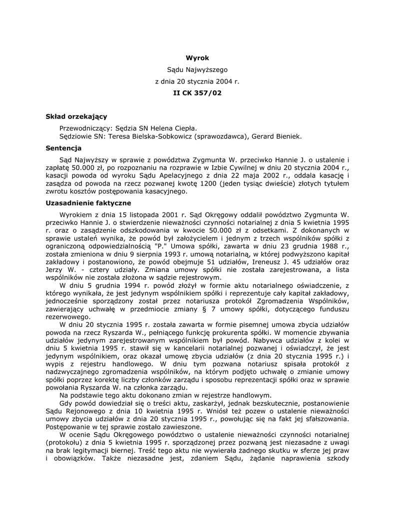 Wyrok Sądu Najwyższego z dnia 20 stycznia 2004 r. II CK 357/02 Skład orzekający Przewodniczący: Sędzia SN Helena Ciepła. Sędziowie SN: Teresa Bielska-Sobkowicz (sprawozdawca), Gerard Bieniek. Sentencja Sąd Najwyższy w sprawie z powództwa Zygmunta W. przeciwko Hannie J. o ustalenie i zapłatę 50.000 zł, po rozpoznaniu na rozprawie w Izbie Cywilnej w dniu 20 stycznia 2004 r., kasacji powoda od wyroku Sądu Apelacyjnego z dnia 22 maja 2002 r., oddala kasację i zasądza od powoda na rzecz pozwanej kwotę 1200 (jeden tysiąc dwieście) złotych tytułem zwrotu kosztów postępowania kasacyjnego. Uzasadnienie faktyczne Wyrokiem z dnia 15 listopada 2001 r. Sąd Okręgowy oddalił powództwo Zygmunta W. przeciwko Hannie J. o stwierdzenie nieważności czynności notarialnej z dnia 5 kwietnia 1995 r. oraz o zasądzenie odszkodowania w kwocie 50.000 zł z odsetkami. Z dokonanych w sprawie ustaleń wynika, że powód był założycielem i jednym z trzech wspólników spółki z ograniczoną odpowiedzialnością "P." Umowa spółki, zawarta w dniu 23 grudnia 1988 r., została zmieniona w dniu 9 sierpnia 1993 r. umową notarialną, w której podwyższono kapitał zakładowy i postanowiono, że powód obejmuje 51 udziałów, Ireneusz J. 45 udziałów oraz Jerzy W. - cztery udziały. Zmiana umowy spółki nie została zarejestrowana, a lista wspólników nie została złożona w sądzie rejestrowym. W dniu 5 grudnia 1994 r. powód złożył w formie aktu notarialnego oświadczenie, z którego wynikała, że jest jedynym wspólnikiem spółki i reprezentuje cały kapitał zakładowy, jednocześnie sporządzony został przez notariusza protokół Zgromadzenia Wspólników, zawierający uchwałę w przedmiocie zmiany § 7 umowy spółki, dotyczącego funduszu rezerwowego. W dniu 20 stycznia 1995 r. została zawarta w formie pisemnej umowa zbycia udziałów powoda na rzecz Ryszarda W., pełniącego funkcję prokurenta spółki. W momencie zbywania udziałów jedynym zarejestrowanym wspólnikiem był powód. Nabywca udziałów z kolei w dniu 5 kwietnia 1995 r. stawił się w kancelarii notarialnej pozwanej i oświadczył, że jest jedynym wspólnikiem, oraz okazał umowę zbycia udziałów (z dnia 20 stycznia 1995 r.) i wypis z rejestru handlowego. W dniu tym pozwana notariusz spisała protokół z nadzwyczajnego zgromadzenia wspólników, na którym podjęto uchwałę o zmianie umowy spółki poprzez korektę liczby członków zarządu i sposobu reprezentacji spółki oraz w sprawie powołania Ryszarda W. na członka zarządu. Na podstawie tego aktu dokonano zmian w rejestrze handlowym. Gdy powód dowiedział się o treści aktu, zaskarżył, jednak bezskutecznie, postanowienie Sądu Rejonowego z dnia 10 kwietnia 1995 r. Wniósł też pozew o ustalenie nieważności umowy zbycia udziałów z dnia 20 stycznia 1995 r., powołując się na fakt jej sfałszowania. Postępowanie w tej sprawie zostało zawieszone. W ocenie Sądu Okręgowego powództwo o ustalenie nieważności czynności notarialnej (protokołu) z dnia 5 kwietnia 1995 r. sporządzonej przez pozwaną jest niezasadne z uwagi na brak legitymacji biernej. Treść tego aktu nie wywierała żadnego skutku w sferze jej praw i obowiązków. Także niezasadne jest, zdaniem Sądu, żądanie naprawienia szkody poniesionej przez powoda wskutek sporządzenia tego aktu. Pozwana za tę szkodę nie ponosi odpowiedzialności, nie uchybiła bowiem obowiązkom, jakie nakładała na nią ustawa z dnia 14 lutego 1991 r. - Prawo o notariacie. Nie uznał Sąd trafności twierdzenia, że pozwana powinna zorientować się, że w chwili zawierania umowy z dnia 20 stycznia 1995 r. powód nie dysponował 100% udziałów w spółce, zatem nie mógł ich skutecznie zbyć. Księgę udziałów, zgodnie z art. 188 k.h., powinien prowadzić zarząd spółki, a notariusz nie ponosi odpowiedzialności za fałszywą treść listy wspólników i nie ma obowiązku prowadzenia dochodzenia, czy wskazani na tej liście wspólnicy rzeczywiście nimi są. Brak zatem podstaw do odpowiedzialności odszkodowawczej na podstawie art. 49 ustawy - Prawo o notariacie. Sąd Apelacyjny wyrokiem z dnia 22 maja 2002 r. oddalił apelację powoda od powyższego wyroku, podzielając ustalenia faktyczne i oceny prawne. Dodatkowo wskazał, że wbrew twierdzeniom powoda, umowa zbycia udziałów z dnia 20 stycznia 1995 r. nie wymagała zawarcia w formie aktu notarialnego, a jedynie, stosownie do art. 180 k.h., wymagana była, pod rygorem nieważności, forma pisemna, która została zachowana. Umowa ta nie budziła wątpliwości co do jej autentyczności i zgodności z rzeczywistym stanem rzeczy. Brak też było podstaw do stwierdzenia przez pozwaną, że w dacie 20 stycznia 1995 r. powód posiadał tylko 51% udziałów w spółce. Wykazana została przez nią wymagana prawem staranność w zakresie szczegółowego zapoznania się z treścią przedstawionych jej dokumentów. Wyrok powyższy zaskarżył kasacją powód, zarzucając naruszenie prawa materialnego, tj. art. 256 k.h. poprzez jego niezastosowanie, oraz art. 49 i 80 ustawy - Prawo o notariacie poprzez przyjęcie, że notariusz dokonując czynności notarialnych nie jest zobowiązany do dochowania należytej staranności. Zarzucał także sprzeczność istotnych ustaleń z treścią zebranego w sprawie materiału dowodowego polegającą na przyjęciu, że pozwana nie ponosi żadnej odpowiedzialności za treść i okoliczności sporządzonego przez siebie aktu notarialnego, wywierającego skutki prawne wobec osób trzecich. W konkluzji skarżący wnosił o zmianę zaskarżonego wyroku oraz poprzedzającego go wyroku Sądu pierwszej instancji i zasądzenie na jego rzecz żądanego odszkodowania, ewentualnie o uchylenie tych wyroków i przekazanie sprawy do ponownego rozpoznania. Uzasadnienie prawne Sąd Najwyższy zważył, co następuje: Przede wszystkim zwrócić trzeba uwagę na wadliwe sformułowanie przez skarżącego, reprezentowa
