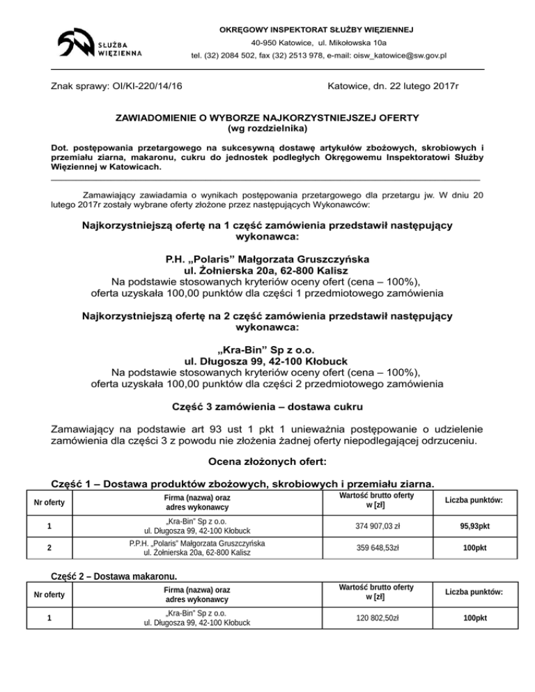 OKRĘGOWY INSPEKTORAT SŁUŻBY WIĘZIENNEJ 40-950 Katowice, ul. Mikołowska 10a tel. (32) 2084 502, fax (32) 2513 978, e-mail: [email protected] Znak sprawy: OI/KI-220/14/16 Katowice, dn. 22 lutego 2017r ZAWIADOMIENIE O WYBORZE NAJKORZYSTNIEJSZEJ OFERTY (wg rozdzielnika) Dot. postępowania przetargowego na sukcesywną dostawę artykułów zbożowych, skrobiowych i przemiału ziarna, makaronu, cukru do jednostek podległych Okręgowemu Inspektoratowi Służby Więziennej w Katowicach. ______________________________________________________________________________________ Zamawiający zawiadamia o wynikach postępowania przetargowego dla przetargu jw. W dniu 20 lutego 2017r zostały wybrane oferty złożone przez następujących Wykonawców: Najkorzystniejszą ofertę na 1 część zamówienia przedstawił następujący wykonawca: P.H. „Polaris” Małgorzata Gruszczyńska ul. Żołnierska 20a, 62-800 Kalisz Na podstawie stosowanych kryteriów oceny ofert (cena – 100%), oferta uzyskała 100,00 punktów dla części 1 przedmiotowego zamówienia Najkorzystniejszą ofertę na 2 część zamówienia przedstawił następujący wykonawca: „Kra-Bin” Sp z o.o. ul. Długosza 99, 42-100 Kłobuck Na podstawie stosowanych kryteriów oceny ofert (cena – 100%), oferta uzyskała 100,00 punktów dla części 2 przedmiotowego zamówienia Część 3 zamówienia – dostawa cukru Zamawiający na podstawie art 93 ust 1 pkt 1 unieważnia postępowanie o udzielenie zamówienia dla części 3 z powodu nie złożenia żadnej oferty niepodlegającej odrzuceniu. Ocena złożonych ofert: Część 1 – Dostawa produktów zbożowych, skrobiowych i przemiału ziarna. Nr oferty Firma (nazwa) oraz adres wykonawcy Wartość brutto oferty w [zł] Liczba punktów: 1 „Kra-Bin” Sp z o.o. ul. Długosza 99, 42-100 Kłobuck 374 907,03 zł 95,93pkt 2 P.P.H. „Polaris” Małgorzata Gruszczyńska ul. Żołnierska 20a, 62-800 Kalisz 359 648,53zł 100pkt Część 2 – Dostawa makaronu. Nr oferty Firma (nazwa) oraz adres wykonawcy Wartość brutto oferty w [zł] Liczba punktów: 1 „Kra-Bin” Sp z o.o. ul. Długosza 99, 42-100 Kłobuck 120 802,50zł 100pkt 2 P.P.H. „Polaris” Małgorzata Gruszczyńska ul. Żołnierska 20a, 62-800 Kalisz 144 690,00zł W przedmiotowym postępowaniu żaden z Wykonawców nie podlega wykluczeniu. Podpisał: Dyrektor Okręgowy Służby Więziennej w Katowicach /-/ płk mgr Andrzej Baliński 83,49pkt