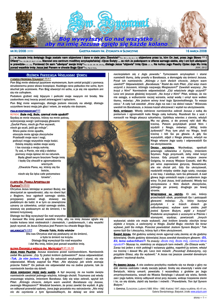 „Bóg wywyższył Go nad wszystko […] aby na imię Jezusa zgięło się każde kolano…” NR XI/2008 (309) GAZETKA PARAFII ŚW W. ZYGMUNTA W SŁOMCZYNIE 16 MARCA 2008 […] w Jezusie imię świętego Boga zostało nam objawione i dane w ciele jako Zbawiciel60Por. Mt 1, 21; Łk I, 31 objawione przez to, kim On Jest, przez Jego Słowo 434 i Ofiarę61Por. J 8, 28; 17, 8;17, 17-19. Stanowi ono centrum modlitwy arcykapłańskiej: »Ojcze »Ojcze Święty … za nich Ja poświęcam w ofierze samego siebie, aby i oni byli uświęceni w prawdzie«J 17, 19. Ponieważ On sam "uświęca" swoje imię62Por. Ez 20, 39; 36, 20-21, dlatego Jezus "objawia" Imię OjcaJ 17, 6. Na końcu Jego Paschy Ojciec daje Mu imię ponad wszelkie imię: Jezus jest Panem w chwale Boga Ojca63Por. Flp 2, 9-11. [KKK, 2812] SZÓSTA NIEDZIELA Z KSIĘGI PROROKA IZAJASZAIz 50,4-7 WIELKIEGO POSTU Pan Bóg mnie obdarzył językiem wymownym, bym umiał przyjść z pomocą strudzonemu przez słowo krzepiące. Każdego rana pobudza me ucho, bym słuchał jak uczniowie. Pan Bóg otworzył mi ucho, a ja się nie oparłem ani się nie cofnąłem. Podałem grzbiet mój bijącym i policzki moje rwącym mi brodę. Nie zasłoniłem mej twarzy przed zniewagami i opluciem. Pan Bóg mnie wspomaga, dlatego jestem nieczuły na obelgi, dlatego uczyniłem twarz moją jak głaz i wiem, że wstydu nie doznam. PSALM RESPONSORYJNYPs22 REFREN: Boże mój, Boże, czemuś mnie opuścił? Szydzą ze mnie wszyscy, którzy na mnie patrzą, wykrzywiają wargi i potrząsają głowami: „Zaufał Panu, niech go Pan wyzwoli, niech go ocali, jeśli go miłuje”. Sfora psów mnie opadła, otoczyła mnie zgraja złoczyńców Przebodli moje ręce i nogi, policzyć mogę wszystkie moje kości. Dzielą między siebie moje szaty i los rzucają o moją suknię. Ty zaś, o Panie, nie stój z daleka: pomocy moja śpiesz mi na ratunek. Będę głosił swym braciom Twoje imię i będę Cię chwalił w zgromadzeniu wiernych: „Chwalcie Pana, wy, którzy się Go boicie, niech się Go lęka całe potomstwo Izraela”. Z LISTU ŚW. PAWŁA APOSTOŁA DO FILIPIANFlp 2,6-11 Chrystus Jezus istniejąc w postaci Bożej, nie skorzystał ze sposobności, aby na równi być z Bogiem, lecz ogołocił samego siebie, przyjąwszy postać sługi, stawszy się podobnym do ludzi. A w tym co zewnętrzne uznany za człowieka, uniżył samego siebie, stawszy się posłusznym aż do śmierci, i to śmierci krzyżowej. Dlatego też Bóg wywyższył Go nad wszystko i darował Mu imię ponad wszelkie imię, aby na imię Jezusa zgięło się każde kolano istot niebieskich i ziemskich, i podziemnych, i aby wszelki język wyznał, że Jezus Chrystus jest Panem ku chwale Boga Ojca. AKLAMACJAFlp 2,8-9 Chwała Tobie, Królu wieków Dla nas Chrystus stał się posłuszny aż do śmierci, a była to śmierć na krzyżu. Dlatego Bóg wywyższył Go nad wszystko i dal Mu imię, które jest ponad wszelkie imię. SŁOWA EWANGELII WEDŁUG ŚW. MATEUSZAMt 27, 11–54 JEZUS PRZED PIŁATEM. Jezusa stawiono przed namiestnikiem. Namiestnik zadał Mu pytanie: „Czy Ty jesteś królem żydowskim?” Jezus odpowiedział: »Tak, Ja nim jestem.« A gdy Go oskarżali arcykapłani i starsi, nic nie odpowiadał. Wtedy zapytał Go Piłat: „Nie słyszysz, jak wiele zeznają przeciw Tobie?” On jednak nie odpowiadał mu na żadne pytanie, tak że namiestnik bardzo się dziwił. JEZUS ODRZUCONY PRZEZ SWÓJ NARÓD. A był zwyczaj, że na każde święto namiestnik uwalniał jednego więźnia, którego chcieli. Trzymano zaś wtedy znacznego więźnia, imieniem Barabasz. Gdy się więc zebrali, spytał ich Piłat: „Którego chcecie, żebym wam uwolnił, Barabasza czy Jezusa, zwanego Mesjaszem?” Wiedział bowiem, że przez zawiść Go wydali. A gdy on odbywał przewód sądowy, żona jego przysłała mu ostrzeżenie: „Nie miej nic do czynienia z tym Sprawiedliwym, bo dzisiaj we śnie wiele nacierpiałam się z Jego powodu.” Tymczasem arcykapłani i starsi namówili tłumy, żeby prosiły o Barabasza, a domagały się śmierci Jezusa. Pytał ich namiestnik: „Którego z tych dwóch chcecie, żebym wam uwolnił?” Odpowiedzieli: „Barabasza.” Rzekł do nich Piłat: „Cóż więc mam uczynić z Jezusem, którego nazywają Mesjaszem?” Zawołali wszyscy: „Na krzyż z Nim!” Namiestnik odpowiedział: „Cóż właściwie złego uczynił?” Lecz oni jeszcze głośniej krzyczeli: „Na krzyż z Nim!” Piłat, widząc, że nic nie osiąga, a wzburzenie raczej wzrasta, wziął wodę i umył ręce wobec tłumu, mówiąc: „Nie jestem winny krwi tego Sprawiedliwego. To wasza rzecz.” A cały lud zawołał: „Krew Jego na nas i na dzieci nasze.” Wówczas uwolnił im Barabasza, a Jezusa kazał ubiczować i wydał na ukrzyżowanie. KRÓL WYŚMIANY. Wtedy żołnierze namiestnika zabrali Jezusa z sobą do pretorium i zgromadzili koło Niego całą kohortę. Rozebrali Go z szat i narzucili na Niego płaszcz szkarłatny. Uplótłszy wieniec z ciernia, włożyli Mu na głowę, a do prawej ręki dali Mu trzcinę. Potem przyklękali przed Nim i szydzili z Niego, mówiąc: „Witaj, królu żydowski!” Przy tym pluli na Niego, brali trzcinę i bili Go po głowie. A gdy Go wyszydzili, zdjęli z Niego płaszcz, włożyli na Niego własne Jego szaty i odprowadzili Go na ukrzyżowanie. DROGA KRZYŻOWA. Wychodząc, spotkali pewnego człowieka z Cyreny, imieniem Szymon. Tego przymusili, żeby niósł krzyż Jezusa. Gdy przyszli na miejsce zwane Golgotą, to znaczy Miejsce Czaszki, dali Mu pić wino zaprawione goryczą. Skosztował, ale nie chciał pić. Gdy Go ukrzyżowali, rozdzielili między siebie Jego szaty, rzucając o nie losy. I siedząc, tam Go pilnowali. A nad głową Jego umieścili napis z podaniem Jego winy: To jest Jezus, król żydowski. Wtedy też ukrzyżowano z Nim dwóch złoczyńców, jednego po prawej, drugiego po lewej stronie. WYSZYDZENIE NA KRZYŻU. Ci zaś, którzy przechodzili obok, przeklinali Go