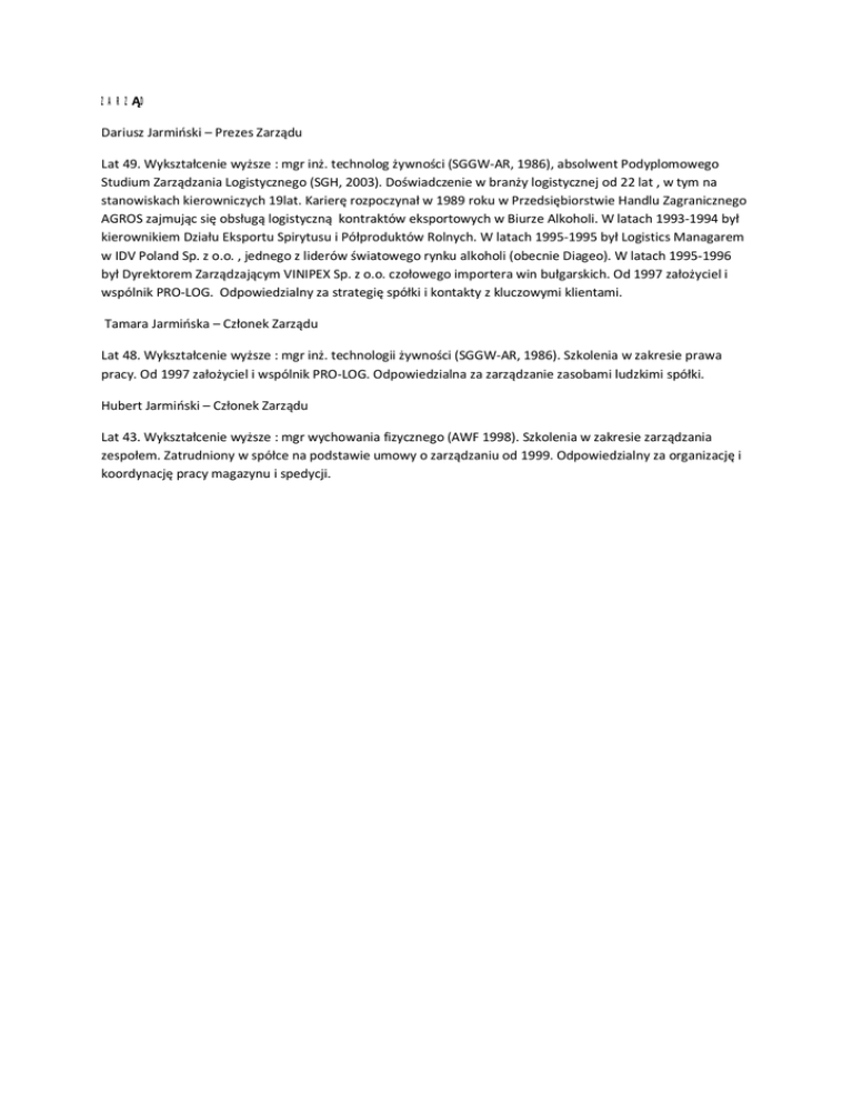 ZARZĄD Dariusz Jarmiński – Prezes Zarządu Lat 49. Wykształcenie wyższe : mgr inż. technolog żywności (SGGW-AR, 1986), absolwent Podyplomowego Studium Zarządzania Logistycznego (SGH, 2003). Doświadczenie w branży logistycznej od 22 lat , w tym na stanowiskach kierowniczych 19lat. Karierę rozpoczynał w 1989 roku w Przedsiębiorstwie Handlu Zagranicznego AGROS zajmując się obsługą logistyczną kontraktów eksportowych w Biurze Alkoholi. W latach 1993-1994 był kierownikiem Działu Eksportu Spirytusu i Półproduktów Rolnych. W latach 1995-1995 był Logistics Managarem w IDV Poland Sp. z o.o. , jednego z liderów światowego rynku alkoholi (obecnie Diageo). W latach 1995-1996 był Dyrektorem Zarządzającym VINIPEX Sp. z o.o. czołowego importera win bułgarskich. Od 1997 założyciel i wspólnik PRO-LOG. Odpowiedzialny za strategię spółki i kontakty z kluczowymi klientami. Tamara Jarmińska – Członek Zarządu Lat 48. Wykształcenie wyższe : mgr inż. technologii żywności (SGGW-AR, 1986). Szkolenia w zakresie prawa pracy. Od 1997 założyciel i wspólnik PRO-LOG. Odpowiedzialna za zarządzanie zasobami ludzkimi spółki. Hubert Jarmiński – Członek Zarządu Lat 43. Wykształcenie wyższe : mgr wychowania fizycznego (AWF 1998). Szkolenia w zakresie zarządzania zespołem. Zatrudniony w spółce na podstawie umowy o zarządzaniu od 1999. Odpowiedzialny za organizację i koordynację pracy magazynu i spedycji.