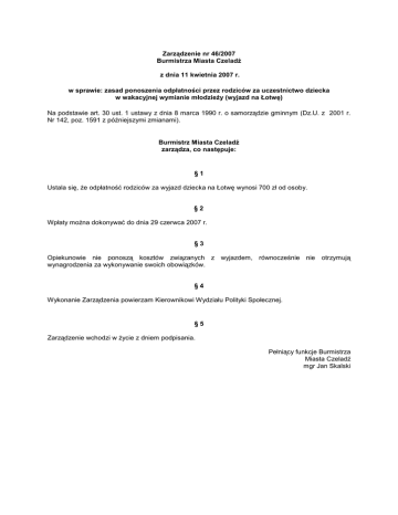 Zarządzenie nr 46/2007 Burmistrza Miasta Czeladź z dnia 11 kwietnia 2007 r. w sprawie: zasad ponoszenia odpłatności przez rodziców za uczestnictwo dziecka w wakacyjnej wymianie młodzieŜy (wyjazd na Łotwę) Na podstawie art. 30 ust. 1 ustawy z dnia 8 marca 1990 r. o samorządzie gminnym (Dz.U. z 2001 r. Nr 142, poz. 1591 z późniejszymi zmianami). Burmistrz Miasta Czeladź zarządza, co następuje: §1 Ustala się, Ŝe odpłatność rodziców za wyjazd dziecka na Łotwę wynosi 700 zł od osoby. §2 Wpłaty moŜna dokonywać do dnia 29 czerwca 2007 r. §3 Opiekunowie nie ponoszą kosztów związanych z wyjazdem, równocześnie nie otrzymują wynagrodzenia za wykonywanie swoich obowiązków. §4 Wykonanie Zarządzenia powierzam Kierownikowi Wydziału Polityki Społecznej. §5 Zarządzenie wchodzi w Ŝycie z dniem podpisania. Pełniący funkcje Burmistrza Miasta Czeladź mgr Jan Skalski
