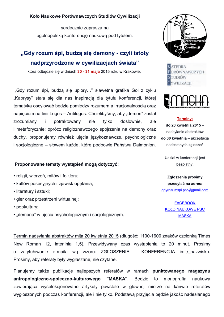 Koło Naukowe Porównawczych Studiów Cywilizacji serdecznie zaprasza na ogólnopolską konferencję naukową pod tytułem: „Gdy rozum śpi, budzą się demony - czyli istoty nadprzyrodzone w cywilizacjach świata” która odbędzie się w dniach 30 - 31 maja 2015 roku w Krakowie. „Gdy rozum śpi, budzą się upiory…” sławetna grafika Goi z cyklu „Kaprysy” stała się dla nas inspiracją dla tytułu konferencji, której tematyka oscylować będzie pomiędzy rozumem a irracjonalnością oraz napięciem na linii Logos – Antilogos. Chcielibyśmy, aby „demon” został zrozumiany i potraktowany nie tylko dosłownie, ale i metaforycznie; oprócz religioznawczego spojrzenia na demony oraz Terminy: do 20 kwietnia 2015 – nadsyłanie abstraktów duchy, proponujemy również ujęcia językoznawcze, psychologiczne do 30 kwietnia – akceptacja i socjologiczne – słowem każde, które podpowie Państwu Daimonion. nadesłanych zgłoszeń Udział w konferencji jest Proponowane tematy wystąpień mogą dotyczyć: bezpłatny. • religii, wierzeń, mitów i folkloru; Zgłoszenia prosimy • kultów posesyjnych i zjawisk opętania; przesyłać na adres: [email protected] • literatury i sztuki; • gier oraz przestrzeni wirtualnej; FACEBOOK • popkultury; KOŁO NAUKOWE PSC • „demona” w ujęciu psychologicznym i socjologicznym. MASKA Termin nadsyłania abstraktów mija 20 kwietnia 2015 (długość: 1100-1600 znaków czcionką Times New Roman 12, interlinia 1,5). Przewidywany czas wystąpienia to 20 minut. Prosimy o zatytułowanie e-maila wg wzoru: ZGŁOSZENIE – KONFERENCJA imię_nazwisko. Prosimy, aby referaty były wygłaszane, nie czytane. Planujemy także publikację najlepszych referatów w ramach punktowanego magazynu antropologiczno-społeczno-kulturowego "MASKA". Będzie to monografia naukowa zawierająca wyselekcjonowane artykuły powstałe w głównej mierze na kanwie referatów wygłoszonych podczas konferencji, ale i nie tylko. Podstawą przyjęcia będzie jakość nadesłanego abstraktu oraz nowatorstwo prezentowanego zagadnienia. W przypadku pojawienia się kilku zbyt podobnych tematów, wybrany zostanie tylko jeden. Można nadesłać kilka propozycji, ale każdy referent będzie mógł przedstawić tylko jedną prezentację. Jednocześnie zaznaczamy, iż obowiązuje osobne call4papers dla publikacji pokonferencyjnej – wszystkich zainteresowanych zarówno wystąpieniem na konferencji, jak i wydaniem artykułu w publikacji zbiorowej, prosimy o wysyłanie zgłoszeń dla każdego wydarzenia z osobna. Jeśli z różnych przyczyn nie będą Państwo mieli możliwości wygłoszenia swojego referatu na konferencji, możliwe jest także zgłoszenie swojego artykułu bez czynnego udziału w konferencji. Ostateczna data przesyłania pełnego tekstu artykułu oraz szczegółowe wymogi formalne zostaną podane w późniejszym terminie. Konferencja ma charakter otwarty – zgłaszanie biernego uczestnictwa nie jest wymagane, serdecznie zapraszamy wszystkich zainteresowanych. Zwracamy się również z uprzejmą prośbą o rozpowszechnianie informacji o konferencji wśród studentów oraz doktorantów. Formularz zgłoszeniowy do pobrania: https://drive.google.com/file/d/0B2PeQCVIy2X7MkxkcGlwcEVFSjQ/view