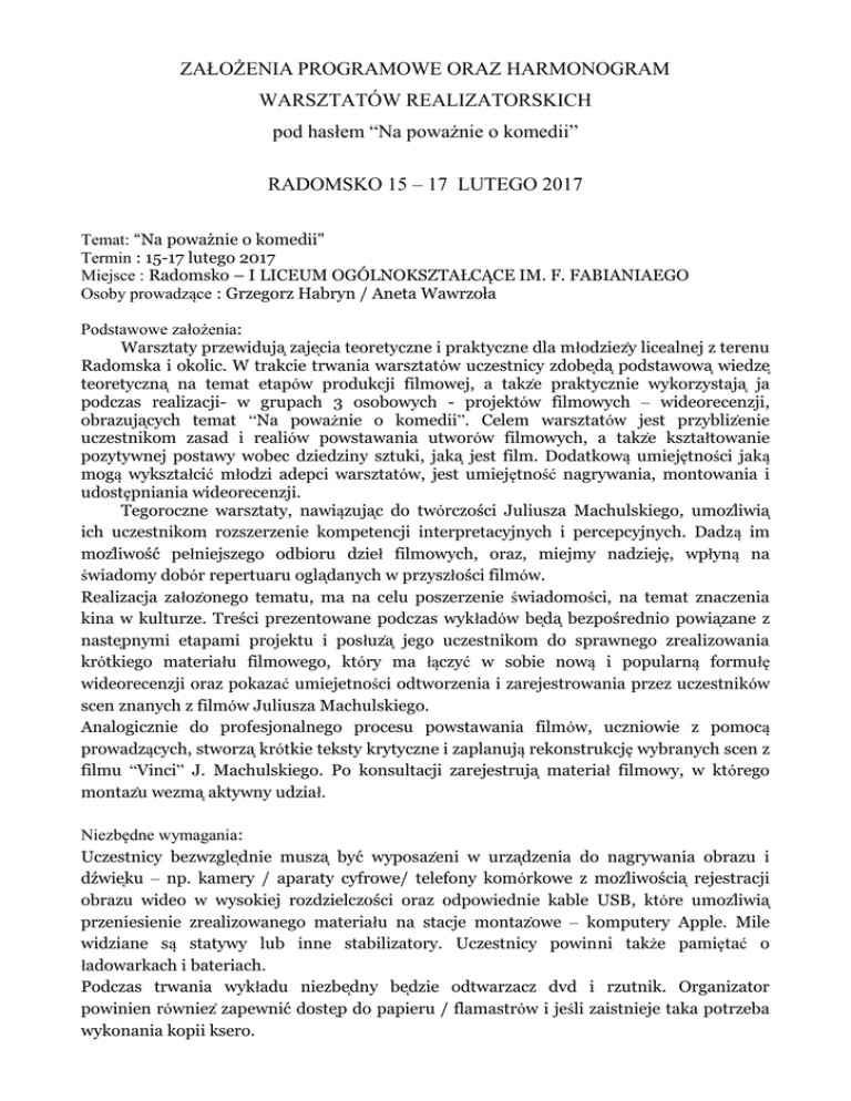 ZAŁ PROGRAMOWE ORAZ HARMONOGRAM WARSZTATÓW REALIZATORSKICH pod hasłem “Na poważnie o komedii” RADOMSKO 15 – 17 LUTEGO 2017 Temat: “Na poważnie o komedii" Termin : 15-17 lutego 2017 Miejsce : Radomsko – I LICEUM OGÓLNOKSZTAŁCĄCE IM. F. FABIANIAEGO : Grzegorz Habryn / Aneta Wawrzoła Podstawowe zał : War ztat przewid a za ecia teoretyczne i praktyczne dla młodziezy licealnej z terenu Radomska i okolic. W trakcie trwania warsztatów ze tni zdo eda pod tawowa wiedze teoret zna na temat etapów prod k i i mowe a takze prakt znie w korz ta a ja podczas realizacji- w grupach 3 osobowych - projektów filmowych – wideorecenzji, o raz acych temat “Na poważnie o komedii”. Celem warsztatów e t prz izenie uczestnikom zasad i realiów powstawania utworów i mow a takze kształtowanie poz t wne po taw wo e dziedzin zt ki aka jest film. Dodatkową umiejętności jaką mogą wykształcić młodzi adepci warsztatów, jest umiejętność nagrywania, montowania i udostępniania wideorecenzji. Tegoroczne warsztaty, nawiąz ac do twór zo i i za Ma kie o moz iwia ich uczestnikom rozszerzenie kompetencji interpretacyjnych i percepcyjnych. Dadzą im moz iwo pełniejszego odbioru dzieł filmowych, oraz, miejmy nadzieję, wpłyną na świadomy dobór repert ar o adanych w przyszło i i mów. Realizacja załozonego tematu, ma na celu poszerzenie świadomości, na temat zna zenia kina w k t rze. Tre i prezentowane pod za w kładów eda ezpo rednio powiazane z na tepnymi etapami projektu i posł za jego uczestnikom do sprawnego zrealizowania krótkiego materiału filmowego, który ma łączyć w sobie nową i popularną formułę wideorecenzji oraz pokazać umiejetności odtworzenia i zarejestrowania przez uczestników scen znanych z filmów Juliusza Machulskiego. Analogicznie do profesjonalnego procesu powstawania filmów, uczniowie z pomocą prowadzą tworza krótkie teksty krytyczne i zaplanują rekonstrukcję wybranych scen z filmu “Vinci” J. Machulskiego. Po kons ta i zare e tr a materiał filmowy, w które o montaz wezma aktywny udział. : U ze tni ezwz ednie m za w po azeni w rzadzenia do na r wania o raz i d wieku – np. kamery / aparaty cyfrowe/ telefony komórkowe z moz iwo ia re e tra i o raz wideo w w okie rozdzie zo i oraz odpowiednie ka e USB, które moz iwia przeniesienie zrealizowanego materiał na ta e montazowe – komputery Apple. Mile widziane są statywy lub inne stabilizatory. Uczestnicy powinni także pamiętać o ładowarkach i bateriach. Podczas trwania wykład niez edn edzie odtwarzacz dvd i rzutnik. Organizator powinien równiez zapewni do tep do papieru / flamastrów i jeśli zaistnieje taka potrzeba wykonania kopii ksero. RAMOWY PLAN PRACY Dzień 1 9:30 – 11:15 z przerwa) min. 1. Prz witanie. Krótki w tęp zapoznanie ię z uczestnikami. 2. „ ak zai tnie w wie ie kina?”- dyskusja oparta na do wiad zenia ucze tników. 3. “Internet – poten ał i nie ezpie zeń two” – prezenta a wideo o ów znan po ki kr t ków filmowych. 4. Prezenta a ra mentów i mów J.Machulskiego I pró a ana iz o ądan ra mentów – praca w grupach. 5. Ćwi zenie war ztatowe ”Gło ne z tanie” – wi zenie d k ne. 11:15-11:30 Przerwa Dzień 2 Dzień 3 8:00-9:30 1. Wprowadzenie do realizacji zaapro owan pom łów. 8:15 - ... 1. Postprodukcja materiałów filmowych – montaz poszczególnych projektów. 2. Przedstawienie przez Gr p tawia a ie na opiekunów pod tawow umówiona w ze nie za ad o owiaz acych odzine i wraz z montaz ta podczas realizacji materiału pode m a de z e o filmowego – BHP. ostatecznym kształ ie twor i mowe o a takze 3. e i to konie zne zapozna a ie w prakt e z instruktarz obsł i rzadzeń te nika montaz i na r wa acych. d wiekowienia. 9:30 – 15:00 1. Praca w grupach. Realizacja materiał i mowe o na terenie Radomska. 2. W terminie t odnia od zakoń zenia war ztatów kazd ze tnik oraz or anizatorz otrz ma a dro a e ektroni zna link do gotowego ( z niez ednymi poprawkami ) filmu, który zrealizowali uczestnicy. Dzień 1 Dzień 2 Dzień 3 11:00 – 13:00 ) 6. Przedstawienie uczestnikom tematu ich pracy -realizacja wideorecenzji filmu J.Machulskiego, pod a łem: “Na poważnie o komedii”. Re enz a m i wzbogacona o odtworzenie jednej ze scen filmu. 1. Spotkania kon ta ne z po z ze ó n mi r pami o w zna zon odzina np. o min t. ewent a na pomo w rea iza i wi zeń) 15:00-16:00 1. Oddawanie materiałów zrealizowanych przez ze tników. 7. „Etap prod k i i mowe ” - 2. Planowanie wraz z uczestnikami kolejnych w kład wz o a on o etapów produkcji – montaz fragmenty tzw. „makin o ” i d wiekowienia. z p anów i mow oraz krótki in tr ktaż dot zą kadrów i r ów kamer . 17:00 - ... 8. Tworzenie listy rzeczy niez ędn do zrealizowania filmu. 1. Z r wanie materiał pozostawianego przez ze tników 9. Ćwi zenia war ztatowe: „Opra owanie m z zne” „Ko ti mo ra ” 14:30-15:15 Przerwa obiadowa 15:15-17:00 e i zai tnie e taka potrzeba do 18:00) 10. Praca w grupach. Rozlosowanie tytułów filmów i scen do analizy. Pi anie w tepnych tekstów/ scenopisów przy wsparciu prowadzących. 11. Konsultacje i indywidualne rozmowy przygotowanie do re e trowania materiałów. Uwaga: Godziny zawarte w planie warsztatów mo a ulec nieznacznym zmianom w za ezno i od i o i ze tników oraz tempa ich pracy.