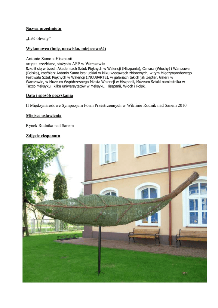 Nazwa przedmiotu „Liść oliwny” Wykonawca (imię, nazwisko, miejscowość) Antonio Samo z Hiszpanii artysta rzeźbiarz, stażysta ASP w Warszawie Szkolił się w trzech Akademiach Sztuk Pięknych w Walencji (Hiszpania), Carrara (Włochy) i Warszawa (Polska), rzeźbiarz Antonio Samo brał udział w kilku wystawach zbiorowych, w tym Międzynarodowego Festiwalu Sztuk Pięknych w Walencji (INCUBARTE), w galeriach takich jak Zepter, Galerii w Warszawie, w Muzeum Współczesnego Miasta Walencji w Hiszpanii, Muzeum Sztuki namiestnika w Taxco Meksyku i kilku uniwersytetów w Meksyku, Hiszpanii, Włoch i Polski. Data i sposób pozyskania II Międzynarodowe Sympozjum Form Przestrzennych w Wiklinie Rudnik nad Sanem 2010 Miejsce ustawienia Rynek Rudnika nad Sanem Zdjęcie eksponatu