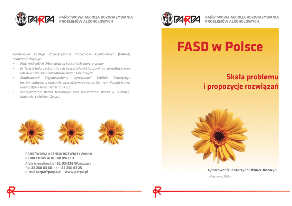 Państwowa Agencja Rozwiązywania Problemów Alkoholowych (PARPA) serdecznie dziękuje: • Prof. Andrzejowi Urbanikowi za konsultacje merytoryczne; • dr Teresie Jadczak-Szumiło i dr Krzysztofowi Liszczowi za konsultacje oraz udział w szkoleniu realizatorów badań terenowych; • Stanisławowi Stępniewskiemu, dyrektorowi Szpitala Dziecięcego im. św. Ludwika w Krakowie, przy którym powstało Centrum Kompleksowej Diagnostyki i Terapii Dzieci z FASD; • koordynatorom badań terenowych oraz realizatorom badań w Kielcach, Krakowie, Leżajsku i Żywcu. FASD w Polsce Skala problemu i propozycje rozwiązań PAŃSTWOWA AGENCJA ROZWIĄZYWANIA PROBLEMÓW ALKOHOLOWYCH Aleje Jerozolimskie 155, 02-326 Warszawa fax 22 250 63 60 | tel 22 250 63 25 e–mail [email protected] | www.parpa.pl Opracowanie: Katarzyna Okulicz-Kozaryn Warszawa, 2015 r. SPIS TREŚCI Piśmiennictwo: 1. WPROWADZENIE Co to jest FASD? Rozpowszechnienie FASD w Europie ROZPOWSZECHNIENIE FASD W POLSCE PROJEKT ALICJA Metoda badania Procedura badań Wyniki Charakterystyka uczestników badania Rozpowszechnienie FASD Podsumowanie Wnioski SYSTEM POMOCY OSOBOM Z FASD I ICH RODZINOM POSTULATY, ELEMENTY KLUCZOWE Wczesna diagnoza FASD Odpowiednia terapia Praca zespołowa Koordynator pracy z rodziną – osoba kluczowa Wiodąca rola lekarzy Przezwyciężenie stereotypowego myślenia o kobietach pijących alkohol w czasie ciąży Piśmiennictwo 2 3 3 4 5 6 8 12 12 13 14 15 16 16 17 18 19 20 21 23 Astley Sj, Bailey D.,Talbot C., Clarren Sk. Fetal Alcohol Syndrome (FAS) primary prevention through FAS diagnosis: II. A comprehensive profile of 80 birth mothers of children with FAS. Alcohol and Alcoholism (2000) 35 (5): 509-519 2. Baio J. (2014). Prevalence of Autism Spectrum Disorder Among Children Aged 8 Years — Autism and Developmental Disabilities Monitoring Network, 11 Sites, United States. Morbidity and Mortality Weekly Report, 63(SS02), 1-21 3. Chudley A.E., Conry J., Cook J.L., Loock C., Rosales T., LeBlanc N. Fetal alcohol spectrum disorder: Canadian guidelines for diagnosis. CMAJ, 2005, 172, S1S21 4. Główny Inspektor Sanitarny - GIS (2009), Zachowania zdrowotne kobiet w ciąży, Raport z badań, Warszawa 5. Landgraf M.N., Nothacker M., Heinen F. Diagnosis of fetal alcohol syndrome (FAS): German guideline version 2013. European Journal of Paediatric Neurology 17 (2013), 437-446 6. May P.A., Fiorentino D., Coriale G., Kalberg W.O., Hoyme H.E., Aragon A.S., Buckley D., Stellavato C., Gossage J.P., Robinson L.K., Jones K.L., Manning M., Caccanti M. Prevalence of Children with Severe Fetal Alcohol Spectrum Disorders in Communities Near Rome, Italy: New Estimated Rates Are Higher than Previous Estimates. Int. J. Environ. Res. Public Health 2011, 8, 2331-2351 7. Okulicz-Kozaryn K., Borkowska M. FASD prevalence among school children in Poland. Journal of Applied Research in Intellectual Disabilities (w druku) 8. Petković G., Barišić I. FAS prevalence in a sample of urban schoolchildren in Croatia. Reproductive Toxicology 29 (2010) 237–241 9. Petković G., Barišić I. Prevalence of Fetal Alcohol Syndrome and Maternal Characteristics in a Sample of Schoolchildren from a Rural Province of Croatia. Int. J. Environ. Res. Public Health 2013, 10, 1547-1561 10. Shin M., Besser LM., Kucik JE. i in.(2009). Prevalence of Down Syndrome Among Children and Adolescents in 10 Regions of the United States. Pediatrics, 124 (6), 1565-1571 23 Tymczasem: • większość kobiet, które piły alkohol w czasie ciąży, piło zanim się dowiedziała, że jest w ciąży, • dzieci z FASD rodzą się w rodzinach o różnym statusie społeczno -ekonomicznym i o różnym poziomie wykształcenia, • matki, które w czasie ciąży piły alkohol często borykają się z problemami zdrowia psychicznego; mają za sobą doświadczenia fizycznego i/lub psychicznego maltretowania i/lub były seksualnie wykorzystywane, • często również u nich rozpoznawany jest FASD (Astley, Bailey,Talbot, Clarren, 2000). WPROWADZENIE Co to jest FASD? Jest wiele zewnętrznych czynników biologicznych, chemicznych lub fizycznych które mogą spowodować poważne uszkodzenie organizmu jeszcze w czasie rozwoju płodowego. Jednym z nich jest alkohol pity przez matkę w czasie ciąży. Efektem jego działania może być śmierć płodu lub nieuleczalne zaburzenia fizyczne i psychiczne ogólnie określane jako Spektrum Płodowych Zaburzeń Alkoholowych FASD (Fetal Alcohol Spectrum Disorder). Redukowanie stereotypów staje się częścią pracy specjalistów. „Jeżeli kobieta, które ma wiedzę na temat szkodliwości alkoholu dla jej zdrowia i zdrowia jej nienarodzonego dziecka, decyduje się na kontynuowanie picia w czasie ciąży to, najprawdopodobniej utraciła Ona poczucie, że ma jakiegokolwiek możliwości wyboru”. Diane Malbin Pod tym niediagnostycznym terminem-parasolem mieści się: • Płodowy Zespół Alkoholowy - Fetal Alcohol Syndrome (FAS, w ICD-10 kod Q86,0); • niepełny FAS (partial FAS); • Neurorozwojowe Zaburzenia Zależne od Alkoholu (ARDN). FAS jest najbardziej widocznym i najczęściej rozpoznawanym zaburzeniem z grupy FASD. Charakteryzuje je współwystępowanie trzech elementów, które nie występują razem w przypadku żadnej innej choroby: 1. zahamowanie wzrostu w okresie płodowym lub późniejszym, 2. charakterystyczne zmiany dysmorficzne twarzy, 3. nieprawidłowy rozwój centralnego układu nerwowego. Do rozpoznania innych postaci FASD niezbędne jest potwierdzenie tego, że w czasie ciąży matka piła alkohol. Natomiast wspólnym i niezmiennym elementem wszystkich rozpoznań FASD jest nieprawidłowy rozwój centralnego układu nerwowego (OUN). Uszkodzeniom OUN mogą towarzyszyć uszkodzenia innych organów wewnętrznych, m.in. serca, układu kostnego, układu moczowego, słuchu, wzroku. 22 3 Rozpowszechnienie FASD w Europie Szacuje się, że w Europie FASD jest najbardziej rozpowszechnionym, nie genetycznym schorzeniem neuro-rozwojowym dotycz