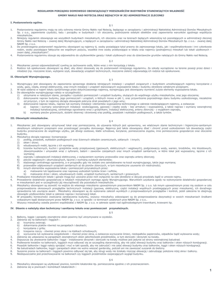 REGULAMIN PORZĄDKU DOMOWEGO OBOWIĄZUJĄCY MIESZKAŃCÓW BUDYNKÓW STANOWIĄCYCH WŁASNOŚĆ GMINY NAKŁO NAD NOTECIĄ ORAZ BĘDĄCYCH W JEJ ADMINISTRACJI ZLECONEJ I. Postanowienia ogólne. §1 1. 2. 3. 4. Postanowienia regulaminu mają na celu ochronę mienia Gminy Nakło nad Notecią, będącego w zarządzaniu i administracji Nakielskiej Administracji Domów Mieszkalnych Sp. z o.o., zapewnienie czystości, ładu i porządku w budynkach i ich otoczeniu, podnoszenie estetyki obiektów oraz zapewnienia warunków zgodnego współżycia mieszkańców. Niniejszy regulamin obowiązuje we wszystkich budynkach mieszkalnych, ich otoczeniu oraz na terenach będących własnością lub pozostających w administracji zleconej Gminy Nakło nad Notecią – zwanej dalej Wynajmującym, a będących w zarządzaniu i administracji Nakielskiej Administracji Domów Mieszkalnych Sp. z o.o.- zwanej dalej NADM Sp. z o.o. Do przestrzegania postanowień regulaminu obowiązani są najemcy tj. osoby posiadające tytuł prawny do zajmowanego lokalu, jak i współmałżonkowie i inni członkowie rodzin, osoby pozostające faktycznie we wspólnym pożyciu, wszelkie inne osoby przebywające w lokalu oraz najemcy (podnajemcy) mieszkań lub lokali użytkowych – zwani dalej „mieszkańcami”. Postanowienia regulaminu stosuje się odpowiednio do użytkowników garaży i lokali użytkowych oraz do dzierżawców gruntów należących do Gminy Nakło nad Notecią. §2 1. 2. Mieszkaniec ponosi odpowiedzialność cywilną za zachowanie osób, które wraz z nim korzystają z lokalu. Rodzice lub opiekunowie obowiązani są dbać, aby dzieci stosowały się do postanowień niniejszego regulaminu. Za szkody wyrządzone na terenie posesji przez dzieci i młodzież (np. niszczenie ścian, wybijanie szyb, dewastację urządzeń technicznych, niszczenie zieleni) odpowiadają ich rodzice lub opiekunowie. II. Obowiązki Wynajmującego. §3 1. 2. 3. Wynajmujący jest obowiązany do zapewnienia sprawnego działania istniejących instalacji i urządzeń związanych z budynkiem umożliwiających najemcy korzystanie z wody, gazu, ciepła, energii elektrycznej, oraz innych instalacji i urządzeń stanowiących wyposażenie lokalu i budynku określone odrębnymi przepisami. W razie oddania w najem lokalu opróżnionego przez dotychczasowego najemcę, wynajmujący jest obowiązany wymienić zużyte elementy wyposażenia lokalu. Do obowiązków wynajmującego należy w szczególności: 1) utrzymanie w należytym stanie, porządku i czystości pomieszczeń i urządzeń budynku, służących do wspólnego użytku mieszkańców, oraz jego otoczenia; 2) dokonywanie napraw budynku, jego pomieszczeń i urządzeń, o których mowa w pkt 1, oraz przywrócenie poprzedniego stanu budynku uszkodzonego, niezależnie od przyczyn, z tym że najemcę obciąża obowiązek pokrycia strat powstałych z jego winy; 3) dokonywanie napraw lokalu, napraw lub wymiany instalacji i elementów wyposażenia technicznego w zakresie nieobciążającym najemcy, a zwłaszcza: a) napraw i wymiany wewnętrznych instalacji: wodociągowej, gazowej i ciepłej wody - bez armatury i wyposażenia, a także napraw i wymiany wewnętrznej instalacji kanalizacyjnej, centralnego ogrzewania wraz z grzejnikami, instalacji elektrycznej, anteny zbiorczej - z wyjątkiem osprzętu, b) wymiany pieców grzewczych, stolarki okiennej i drzwiowej oraz podłóg, posadzek i wykładzin podłogowych, a także tynków. III. Obowiązki mieszkańców. §4 1. 2. 3. 4. 5. 6. 7. Mieszkaniec jest obowiązany utrzymywać lokal oraz pomieszczenia, do używania których jest uprawniony, we właściwym stanie technicznym i higieniczno-sanitarnym określonym odrębnymi przepisami oraz przestrzegać porządku domowego. Najemca jest także obowiązany dbać i chronić przed uszkodzeniem lub dewastacją części budynku przeznaczone do wspólnego użytku, jak dźwigi osobowe, klatki schodowe, korytarze, pomieszczenia zsypów, inne pomieszczenia gospodarcze oraz otoczenie budynku. Mieszkańca obciąża naprawa i konserwacja: 1) podłóg, posadzek, wykładzin podłogowych oraz ściennych okładzin ceramicznych, szklanych i innych; 2) okien i drzwi; 3) wbudowanych mebli, łącznie z ich wymianą; 4) trzonów kuchennych, kuchni i grzejników wody przepływowej (gazowych, elektrycznych i węglowych), podgrzewaczy wody, wanien, brodzików, mis klozetowych, zlewozmywaków i umywalek wraz z syfonami, baterii i zaworów czerpalnych oraz innych urządzeń sanitarnych, w które lokal jest wyposażony, łącznie z ich wymianą; 5) osprzętu i zabezpieczeń instalacji elektrycznej, z wyłączeniem wymiany przewodów oraz osprzętu anteny zbiorczej; 6) pieców węglowych i akumulacyjnych, łącznie z wymianą zużytych elementów; 7) etażowego centralnego ogrzewania, a w przypadku gdy nie zostało ono zainstalowane na koszt wynajmującego, także jego wymiana; 8) przewodów odpływowych urządzeń sanitarnych aż do pionów zbiorczych, w tym niezwłoczne usuwanie ich niedrożności; 9) innych elementów wyposażenia lokalu i pomieszczeń przynależnych przez: a) malowanie lub tapetowanie oraz naprawę uszkodzeń tynków ścian i sufitów, b) malowanie drzwi i okien, wbudowanych mebli, urządzeń kuchennych, sanitarnych i grzewczych. Przekazane mieszkańcom lokale i garaże mogą być używane przez nich wyłącznie na cele określone w decyzji przydziału bądź w umowie najmu. Prowadzenie działalności gospodarczej w lokalach mieszkalnych wymaga zgody Wynajmującego. Warunkiem uzyskania zgody na wykonywanie działalności gospodarczej w mieszkaniach jest w szczególności jej nieuciążliwość dla pozostałych mieszkańców. Mieszkańcy obowiązani są zezwolić na wejście do własnego mieszkania upoważnionym pracownikom NADM Sp. z o.o. lub innym upoważnionym przez nią osobom w celu przeprowadzenia okresowych przeglądów technicznych instalacji (gazowa, elektryczna, części instalacji wspólnych przebiegających prz