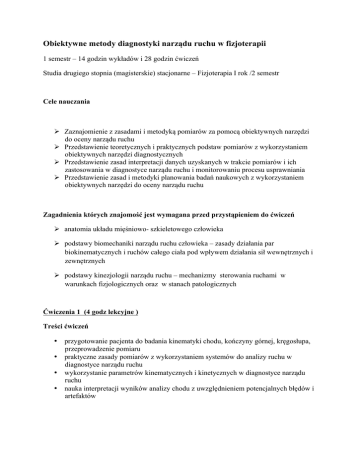 Obiektywne metody diagnostyki narządu ruchu w fizjoterapii 1 semestr – 14 godzin wykładów i 28 godzin ćwiczeń Studia drugiego stopnia (magisterskie) stacjonarne – Fizjoterapia I rok /2 semestr Cele nauczania Ø Zaznajomienie z zasadami i metodyką pomiarów za pomocą obiektywnych narzędzi do oceny narządu ruchu Ø Przedstawienie teoretycznych i praktycznych podstaw pomiarów z wykorzystaniem obiektywnych narzędzi diagnostycznych Ø Przedstawienie zasad interpretacji danych uzyskanych w trakcie pomiarów i ich zastosowania w diagnostyce narządu ruchu i monitorowaniu procesu usprawniania Ø Przedstawienie zasad i metodyki planowania badań naukowych z wykorzystaniem obiektywnych narzędzi do oceny narządu ruchu Zagadnienia których znajomość jest wymagana przed przystąpieniem do ćwiczeń Ø anatomia układu mięśniowo- szkieletowego człowieka Ø podstawy biomechaniki narządu ruchu człowieka – zasady działania par biokinematycznych i ruchów całego ciała pod wpływem działania sił wewnętrznych i zewnętrznych Ø podstawy kinezjologii narządu ruchu – mechanizmy sterowania ruchami w warunkach fizjologicznych oraz w stanach patologicznych Ćwiczenia 1 (4 godz lekcyjne ) Treści ćwiczeń • przygotowanie pacjenta do badania kinematyki chodu, kończyny górnej, kręgosłupa, przeprowadzenie pomiaru • praktyczne zasady pomiarów z wykorzystaniem systemów do analizy ruchu w diagnostyce narządu ruchu • wykorzystanie parametrów kinematycznych i kinetycznych w diagnostyce narządu ruchu • nauka interpretacji wyników analizy chodu z uwzględnieniem potencjalnych błędów i artefaktów Ćwiczenia 2 (4 godz lekcyjne ) Treści ćwiczeń • przygotowanie pacjenta do badania siły mięśniowej, omówienie wskazań i przeciwwskazań do pomiarów siły mięśniowej, • zasady pomiaru siły mięśniowej w warunkach izometrycznych, izokinetycznych, izotonicznych, pomiar pracy koncentrycznej i ekscentrycznej mięśnia, • parametry jakie można uzyskać podczas pomiaru, ich zastosowanie w diagnostyce narządu ruchu i monitorowaniu procesu usprawniania • nauka interpretacji wyników uzyskanych za pomocą dynamometrów Ćwiczenia 3 (4 godz lekcyjne ) Treści ćwiczeń • przygotowanie pacjenta do badania rozkładu obciążenia i równowagi, omówienie wskazań i przeciwwskazań do tych pomiarów • zasady pomiaru, parametry jakie można uzyskać podczas pomiaru, ich zastosowanie w diagnostyce narządu ruchu i monitorowaniu procesu usprawniania • nauka interpretacji wyników uzyskanych za pomocą platform Ćwiczenia 4 (4 godz lekcyjne ) Treści ćwiczeń • przygotowanie pacjenta do badania aktywności bioelektrycznej mięśni z wykorzystaniem powierzchniowej elektromiografii (sEMG), omówienie wskazań i przeciwwskazań do pomiarów sEMG, • zasady pomiaru aktywności bioelektrycznej mięśni w warunkach statycznych i dynamicznych • parametry jakie można uzyskać podczas pomiaru, ich zastosowanie w diagnostyce narządu ruchu i monitorowaniu procesu usprawniania • nauka interpretacji wyników uzyskanych za pomocą sEMG Ćwiczenia 5 (4 godz lekcyjne ) Treści ćwiczeń • przygotowanie pacjenta do treningu z wykorzystaniem sEMG biofeedback, omówienie wskazań i przeciwwskazań • zasady i techniki pracy z sEMG biofeedback Ćwiczenia 6 (4 godz lekcyjne ) Treści ćwiczeń • • • • wykorzystanie obiektywnych metod diagnostyki narządu ruchu w badaniach naukowych planowanie eksperymentów naukowych z wykorzystaniem obiektywnych narzędzi oceny narządu ruchu podstawowe zasady obróbki danych uzyskanych w pomiarach szacowanie błędów pomiarowych Ćwiczenia 7 (4 godz lekcyjne ) Zaliczenie z oceną – podstawą zaliczenia będzie pozytywny wynik kolokwium i samodzielne wykonanie przez studenta pomiaru jedną z omawianych w semestrze metod obiektywnej diagnostyki. Wykład 1 (2 godz) Analiza ruchu (cz.1) Ø Wprowadzenie do obiektywnych metod oceny narządu ruchu z wykorzystaniem różnych typów systemów do analizy ruchu w diagnostyce narządu ruchu • Video • Optoelektroniczna (pasywne, aktywne markery) • Ultradźwiękowa • Elektromagnetyczna • Inercyjna Ø Parametry opisujące ruch jakie można uzyskać za pomocą systemów do analizy ruchu w ocenie chodu (ocena kinematyki i kinetyki w stawach: biodrowym, kolanowym i w obrębie stopy) i ich zastosowanie w diagnostyce narządu ruchu Wykład 2 (2 godz) Analiza ruchu (cz.2) Ø Parametry opisujące ruch jakie można uzyskać za pomocą systemów do analizy ruchu w ocenie kinematyki kończyny górnej, kręgosłupa i stawów skroniowo-żuchwowych oraz ich zastosowanie w diagnostyce narządu ruchu Ø zasady interpretacji wyników uzyskanych z badania z uwzględnieniem potencjalnych błędów i artefaktów Ø zastosowanie systemów do analizy ruchu w procesie monitorowania procesu usprawniania Wykład 3 (2 godz) Dynamometria Ø Wprowadzenie do zagadnień dynamometrii z wykorzystaniem urządzeń do pomiaru sił generowanych przez narząd ruchu i ich wykorzystania w diagnostyce narządu ruchu • Dynamometry • Akcelerometry Ø Wiadomości dotyczące zasad pomiaru siły mięśni w różnych warunkach (izometryczne, izotoniczne, izokinetyczne), pomiar pracy koncentrycznej i ekscentrycznej mięśnia, pomiar w otwartym i zamkniętym łańcuchu kinetycznym. Zastosowanie tych parametrów w diagnostyce narządu ruchu. Ø parametry jakie można uzyskać podczas pomiarów dynamometrycznych, zastosowanie poszczególnych parametrów w opisie pracy mięśnia i diagnostyce dysfunkcji mięśniowych i monitorowaniu procesu usprawniania Wykład 4 (2 godz) Stabilometria Ø Wprowadzenie do zagadnień stabilometrii z wykorzystaniem urządzeń do pomiaru równowagi i rozkładu obciążenia i ich wykorzystania w diagnostyce narządu ruchu • Platformy stabilometryczne i balansowe • Urządzenia do badania rozkładu obciążenia Ø zasady pomiaru rozkładu obciążenia i równowagi, parametry jakie można uzyskać