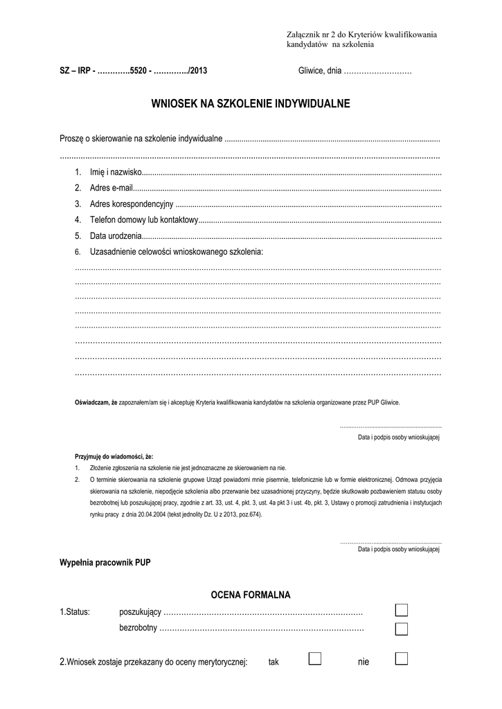 Załącznik nr 2 do Kryteriów kwalifikowania kandydatów na szkolenia SZ – IRP - ………….5520 - …………../2013 Gliwice, dnia ……………………… WNIOSEK NA SZKOLENIE INDYWIDUALNE Proszę o skierowanie na szkolenie indywidualne ...................................................................................................... ..................................................................................................................................................................... 1. Imię i nazwisko.............................................................................................................................................. 2. Adres e-mail.................................................................................................................................................. 3. Adres korespondencyjny .............................................................................................................................. 4. Telefon domowy lub kontaktowy................................................................................................................... 5. Data urodzenia.............................................................................................................................................. 6. Uzasadnienie celowości wnioskowanego szkolenia: …………………………………………………………………………………………………………………………………………… …………………………………………………………………………………………………………………………………………… …………………………………………………………………………………………………………………………………………… …………………………………………………………………………………………………………………………………………… …………………………………………………………………………………………………………………………………………… …………………………………………………………………………………………………………………………….… .……………………………………………………………………………………………………………………………… .……………………………………………………………………………………………………………………………… Oświadczam, że zapoznałem/am się i akceptuję Kryteria kwalifikowania kandydatów na szkolenia organizowane przez PUP Gliwice. ….....………............................................... Data i podpis osoby wnioskującej Przyjmuję do wiadomości, że: 1. Złożenie zgłoszenia na szkolenie nie jest jednoznaczne ze skierowaniem na nie. 2. O terminie skierowania na szkolenie grupowe Urząd powiadomi mnie pisemnie, telefonicznie lub w formie elektronicznej. Odmowa przyjęcia skierowania na szkolenie, niepodjęcie szkolenia albo przerwanie bez uzasadnionej przyczyny, będzie skutkowało pozbawieniem statusu osoby bezrobotnej lub poszukującej pracy, zgodnie z art. 33, ust. 4, pkt. 3, ust. 4a pkt 3 i ust. 4b, pkt. 3, Ustawy o promocji zatrudnienia i instytucjach rynku pracy z dnia 20.04.2004 (tekst jednolity Dz. U z 2013, poz.674). …………….…..............….......................... Data i podpis osoby wnioskującej Wypełnia pracownik PUP OCENA FORMALNA 1.Status: poszukujący ……………………………………………………………………. bezrobotny ……………………………………………………………………… 2.Wniosek zostaje przekazany do oceny merytorycznej: tak nie OCENA MERYTORYCZNA I ETAP 1.Ilość dostępnych ofert pracy na dzień złożenia wniosku/zgłoszenia na szkolenie …………………………………………………………………………………………………………..…………………….… …………………………………………………………………………………..…………………………………………….… ………………………………………………………………………………………………………………………………….. 2.Okres zarejestrowania w PUP Gliwice w ostatnich 24 miesiącach poprzedzających dzień złożenia zgłoszenia ………………………………………………………………………………………………………………………………….. - Do 2 ofert pracy – opinia pozytywna - Powyżej 2 ofert pracy – wniosek odrzucony ………………………………………………………………….. (data i podpis Pośrednika Pracy) II ETAP KRYTERIA OCENY KARTY KANDYDATA NA SZKOLENIE Zasadność skierowania na szkolenie W okresie 24 miesięcy poprzedzających dzień złożenia wniosku korzystał/a z finansowanych przez PUP Gliwice form wsparcia lub ma pozytywnie zaopiniowany wniosek na otrzymanie dotacji z FP lub EFS Spełnia minimum 1 warunek: - brak kwalifikacji zawodowych - konieczność zmian lub uzupełnienia kwalifikacji zawodowych - utrata zdolności do wykonywania pracy w dotychczas wykonywanym zawodzie - 1 pkt - nie 1 pkt bezrobotny długotrwale bezrobotna kobieta, która nie podjęła zatrudnienia po urodzeniu dziecka bezrobotny powyżej 50 r.ż. bezrobotny niepełnosprawny Możliwość zatrudnienia po wnioskowanym szkoleniu Odmowa aktywizacji zawodowej bez uzasadnionej przyczyny, niestawiennictwo, przerwania Ilość dostępnych ofert pracy w okresie 3 m – cy poprzedzających dzień złożenia wniosku SUMA PUNKTÓW Tak 1 pkt Nie 0 pkt - tak bezrobotny do 30 r.ż. Osoba w szczególnej sytuacji na rynku pracy PUNKTACJA - uprawdopodobnienie zatrudnienia od pracodawcy lub oświadczenie osoby bezrobotnej o zamiarze rozpoczęcia działalności 
