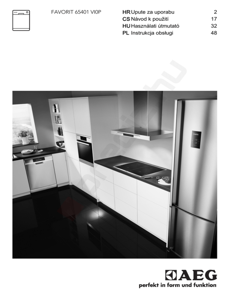 HR Upute za uporabu CS Návod k použití HU Használati útmutató PL Instrukcja obsługi pr ec iz .h u FAVORIT 65401 VI0P 2 17 32 48 2 www.aeg.com SADRŽAJ SIGURNOSNE UPUTE . . . . . . . . . . . . . . . . . . . . . . . . . . . . . . . . . . . . . . . . . . . . . . . . . . . 3 OPIS PROIZVODA . . . . . . . . . . . . . . . . . . . . . . . . . . . . . . . . . . . . . . . . . . . . . . . . . . . . . . 5 UPRAVLJAČKA PLOČA . . . . . . . . . . . . . . . . . . . . . . . . . . . . . . . . . . . . . . . . . . . . . . . . . . 5 PROGRAMI . . . . . . . . . . . . . . . . . . . . . . . . . . . . . . . . . . . . . . . . . . . . . . . . . . . . . . . . . . . . 6 OPCIJE . . . . . . . . . . . . . . . . . . . . . . . . . . . . . . . . . . . . . . . . . . . . . . . . . . . . . . . . . . . . . . . 7 PRIJE PRVE UPORABE . . . . . . . . . . . . . . . . . . . . . . . . . . . . . . . . . . . . . . . . . . . . . . . . . . 8 SVAKODNEVNA UPORABA . . . . . . . . . . . . . . . . . . . . . . . . . . . . . . . . . . . . . . . . . . . . . . 10 SAVJETI . . . . . . . . . . . . . . . . . . . . . . . . . . . . . . . . . . . . . . . . . . . . . . . . . . . . . . . . . . . . . . 12 ČIŠĆENJE I ODRŽAVANJE . . . . . . . . . . . . . . . . . . . . . . . . . . . . . . . . . . . . . . . . . . . . . . 13 RJEŠAVANJE PROBLEMA . . . . . . . . . . . . . . . . . . . . . . . . . . . . . . . . . . . . . . . . . . . . . . . 14 TEHNIČKI PODACI . . . . . . . . . . . . . . . . . . . . . . . . . . . . . . . . . . . . . . . . . . . . . . . . . . . . . 16 ec iz .h u 1. 2. 3. 4. 5. 6. 7. 8. 9. 10. 11. ZA SAVRŠENE REZULTATE Zahvaljujemo vam što ste odabrali ovaj AEG proizvod. Proizveli smo ga kako bi vam pružio godine nepogrešivog rada, s inovativnim tehnologijama koje život čine jednostavnijim svojstva koja ne možete pronaći kod običnih uređaja. Molimo vas da odvojite nekoliko minuta na čitanje kako biste dobili ono najbolje od njega. Posjetite našu internetsku stranicu za: pr Dobivanje savjeta o korištenju, prospekata, rješavanju problema, servisnim informacija: www.aeg.com Registriranje vašeg proizvoda za bolji servis: www.aeg.com/productregistration Kupovinu dodatne opreme, potrošnog materijala i originalnih rezervnih dijelova za vaš uređaj: www.aeg.com/shop BRIGA O KUPCIMA I SERVIS Preporučujemo uporabu originalnih rezervnih dijelova. Kada se obraćate servisu, provjerite da su Vam dostupni sljedeći podaci. Informacije možete pronaći na nazivnoj pločici. Model, PNC, serijski broj. Upozorenje / Oprez - sigurnosne informacije. Opće informacije i savjeti Informacije o zaštiti okoliša Zadržava se pravo na izmjene. HRVATSKI SIGURNOSNE UPUTE Prije postavljanja i uporabe uređaja, pažljivo pročitajte isporučene upute. Pro‐ izvođač nije odgovoran ako nepravilno postavljanje i uporaba uređaja uzrokuje ozljede i oštećenja. Upute uvijek čuvajte s uređajem, za buduće potrebe. • Provjerite podudaraju li se električni podaci na nazivnoj pločici s električnim napajanjem. Ako to nije slučaj, kon‐ taktirajte električara. • Uvijek koristite pravilno ugrađenu utič‐ nicu sa zaštitom od strujnog udara. • Ne koristite adaptere s više utičnica i produžne kabele. • Pazite da ne oštetite utikač i kabel na‐ pajanja. Ako je potrebno zamijeniti električni kabel, to mora izvršiti naš servis. • Utikač kabela napajanja utaknite u utičnicu tek po završetku postavljanja. Provjerite postoji li pristup utikaču nakon postavljanja. • Ne povlačite kabel napajanja kako bi‐ ste utikač izvukli iz utičnice. Uvijek uhvatite i povucite utikač. • Kabel napajanja ili utikač ne dodirujte vlažnim rukama. • Ovaj je uređaj usklađen s direktivama EU. ec iz .h u 1.1 Sigurnost djece i slabijih osoba UPOZORENJE Opasnost od gušenja, ozljede ili trajne nesposobnosti. • Osobama, uključujući i djecu, sa smanjenim fizičkim, osjetilnim ili men‐ talnim funkcijama ili osobama bez iskustva i znanja nikada nemojte do‐ zvoliti da koriste uređaj. Njih prilikom rukovanja uređajem mora nadzirati ili u rukovanje uređajem uputiti osoba od‐ govorna za njihovu sigurnost. • Ne dozvolite djeci da se igraju s ure‐ đajem. • Svu ambalažu čuvajte izvan dohvata djece. • Sve deterdžente čuvajte izvan dohva‐ ta djece. • Djecu i kućne ljubimce držite podalje od vrata uređaja dok su otvorena. pr 1. 3 1.2 Postavljanje • Odstranite svu ambalažu. • Ne postavljajte i ne koristite oštećeni uređaj. • Uređaj nemojte postavljati na mjesta na kojima je temperatura manja od 0°C. • Pridržavajte se uputa za postavljanje isporučenih s uređajem. • Provjerite je li uređaj postavljen ispod i blizu sigurnih konstrukcija. Spajanje na dovod vode • Pripazite da ne oštetite crijeva za vo‐ du. • Prije priključivanja uređaja na nove cijevi ili cijevi koje se dugo nisu kori‐ stile neka voda teče sve dok ne posta‐ ne potpuno čista. • Prilikom prve upotrebe uređaja provjerite da nema curenja. • Crijevo za dovod vode ima sigurnosni ventil i oblogu s unutarnjim glavnim vodom. Električni priključak UPOZORENJE Opasnost od požara i strujnog udara. • Uređaj mora biti uzemljen. UPOZORENJE Opasan napon. www.aeg.com • Ako je crijevo za dovod vode ošteće‐ no, odmah iskopčajte utikač iz utičnice električne mreže. Za zamjenu crijeva za dovod vode kontaktirajte servis. 1.3 Upotreba • Ne sjedajte i ne stojte na otvorenim vratima. • Deterdženti za perilicu posuđa su opasni. Pridržavajte se sigurnosnih uputa na ambalaži deterdženta. • Ne pijte i ne igrajte se s vodom u ure‐ đaju. • Ne vadite posuđe iz uređaja prije za‐ vršetka programa. Na posuđu može ostati deterdženta. • Uređaj može ispuštati vruću paru ako otvorite vrata dok je program u tijeku. • Zapaljive predmete ili predmete namočene zapaljivim sredstvima ne stavljajte u uređaj, pored ili na njega. • Za čišćenje uređaja ne koristite raspr‐ šivanje vode i pare. ec iz .h u • Ovaj 