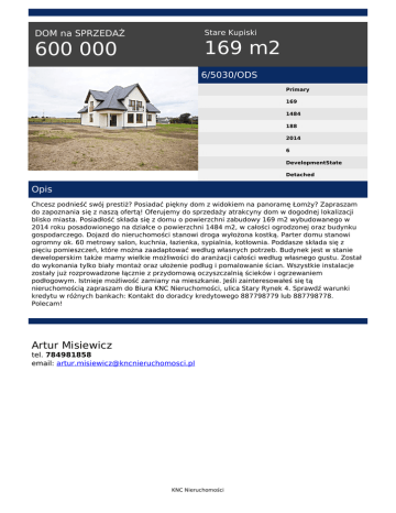 Stare Kupiski DOM na SPRZEDAŻ 169 m2 600 000 6/5030/ODS Primary 169 1484 188 2014 6 DevelopmentState Detached Opis Chcesz podnieść swój prestiż? Posiadać piękny dom z widokiem na panoramę Łomży? Zapraszam do zapoznania się z naszą ofertą! Oferujemy do sprzedaży atrakcyny dom w dogodnej lokalizacji blisko miasta. Posiadłość składa się z domu o powierzchni zabudowy 169 m2 wybudowanego w 2014 roku posadowionego na działce o powierzchni 1484 m2, w całości ogrodzonej oraz budynku gospodarczego. Dojazd do nieruchomości stanowi droga wyłożona kostką. Parter domu stanowi ogromny ok. 60 metrowy salon, kuchnia, łazienka, sypialnia, kotłownia. Poddasze składa się z pięciu pomieszczeń, które można zaadaptować według własnych potrzeb. Budynek jest w stanie deweloperskim także mamy wielkie możliwości do aranżacji całości według własnego gustu. Został do wykonania tylko biały montaż oraz ułożenie podług i pomalowanie ścian. Wszystkie instalacje zostały już rozprowadzone łącznie z przydomową oczyszczalnią ścieków i ogrzewaniem podłogowym. Istnieje możliwość zamiany na mieszkanie. Jeśli zainteresowałeś się tą nieruchomością zapraszam do Biura KNC Nieruchomości, ulica Stary Rynek 4. Sprawdź warunki kredytu w różnych bankach: Kontakt do doradcy kredytowego 887798779 lub 887798778. Polecam! Artur Misiewicz tel. 784981858 email: [email protected] KNC Nieruchomości Powered by TCPDF (www.tcpdf.org)