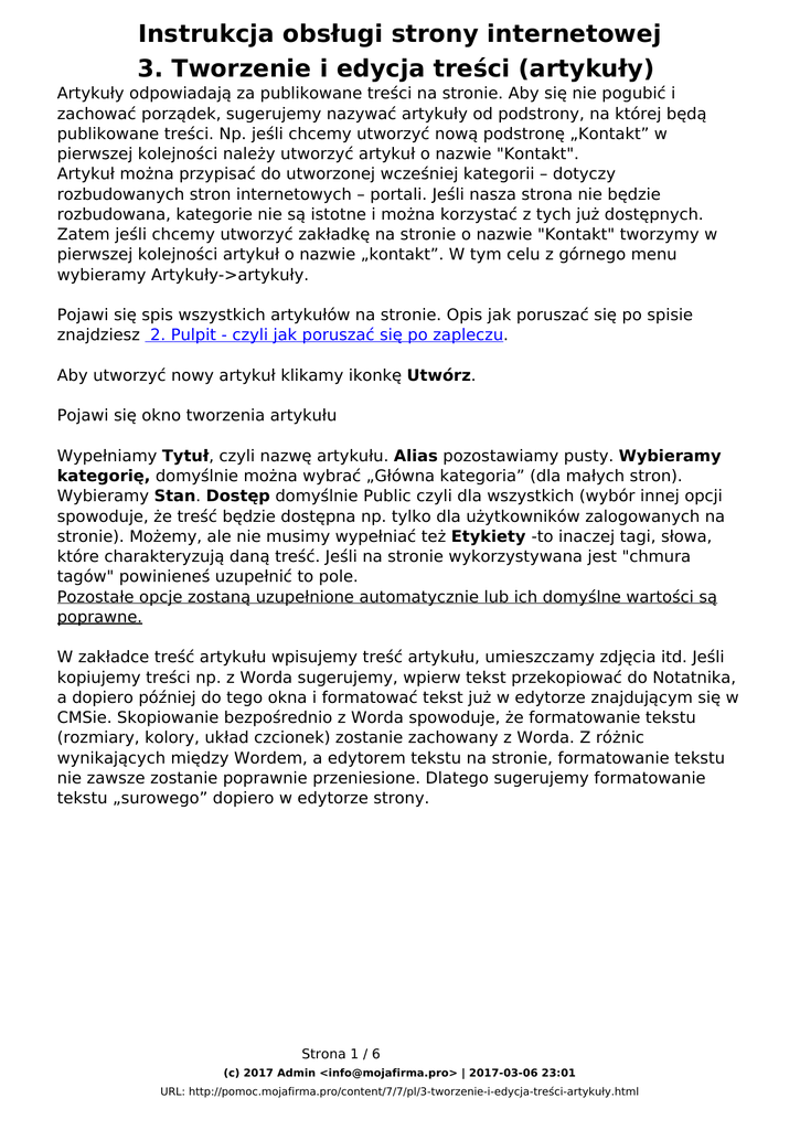 Instrukcja obsługi strony internetowej 3. Tworzenie i edycja treści (artykuły) Artykuły odpowiadają za publikowane treści na stronie. Aby się nie pogubić i zachować porządek, sugerujemy nazywać artykuły od podstrony, na której będą publikowane treści. Np. jeśli chcemy utworzyć nową podstronę „Kontakt” w pierwszej kolejności należy utworzyć artykuł o nazwie "Kontakt". Artykuł można przypisać do utworzonej wcześniej kategorii – dotyczy rozbudowanych stron internetowych – portali. Jeśli nasza strona nie będzie rozbudowana, kategorie nie są istotne i można korzystać z tych już dostępnych. Zatem jeśli chcemy utworzyć zakładkę na stronie o nazwie "Kontakt" tworzymy w pierwszej kolejności artykuł o nazwie „kontakt”. W tym celu z górnego menu wybieramy Artykuły->artykuły. Pojawi się spis wszystkich artykułów na stronie. Opis jak poruszać się po spisie znajdziesz 2. Pulpit - czyli jak poruszać się po zapleczu. Aby utworzyć nowy artykuł klikamy ikonkę Utwórz. Pojawi się okno tworzenia artykułu Wypełniamy Tytuł, czyli nazwę artykułu. Alias pozostawiamy pusty. Wybieramy kategorię, domyślnie można wybrać „Główna kategoria” (dla małych stron). Wybieramy Stan. Dostęp domyślnie Public czyli dla wszystkich (wybór innej opcji spowoduje, że treść będzie dostępna np. tylko dla użytkowników zalogowanych na stronie). Możemy, ale nie musimy wypełniać też Etykiety -to inaczej tagi, słowa, które charakteryzują daną treść. Jeśli na stronie wykorzystywana jest "chmura tagów" powinieneś uzupełnić to pole. Pozostałe opcje zostaną uzupełnione automatycznie lub ich domyślne wartości są poprawne. W zakładce treść artykułu wpisujemy treść artykułu, umieszczamy zdjęcia itd. Jeśli kopiujemy treści np. z Worda sugerujemy, wpierw tekst przekopiować do Notatnika, a dopiero później do tego okna i formatować tekst już w edytorze znajdującym się w CMSie. Skopiowanie bezpośrednio z Worda spowoduje, że formatowanie tekstu (rozmiary, kolory, układ czcionek) zostanie zachowany z Worda. Z różnic wynikających między Wordem, a edytorem tekstu na stronie, formatowanie tekstu nie zawsze zostanie poprawnie przeniesione. Dlatego sugerujemy formatowanie tekstu „surowego” dopiero w edytorze strony. Strona 1 / 6 (c) 2017 Admin <[email protected]> | 2017-03-06 23:01 URL: http://pomoc.mojafirma.pro/content/7/7/pl/3-tworzenie-i-edycja-treści-artykuły.html Instrukcja obsługi strony internetowej Dostępne są standardowe opcje formatowania tekstu podobnie jak w edytorach tekstu takich jak np. Word, dlatego nie będziemy szerej omawiać formatowania tekstu. Jeśli używamy nagłówków czy śródtytułów w treści, sugerujemy wykorzystać gotowe wzorce – klikamy na przycisk Akapit i wybieramy gotowe nagłówki od Heading 1, do Heading 7. Standardowy tekst powinien być oznaczony jako Akapit. Jeśli istnieje konieczność edycji źródła artykułu, możemy kliknąć przycisk HTML, pojawi się okno z kodem artykułu. Wstawianie zdjęcia Jeśli chcemy wstawić zdjęcie do artykułu (zapisane na dysku twardym komputera), kursor ustawiamy w miejscu, gdzie chcemy wstawić zdjęcie i klikamy przycisk „Grafika”. Strona 2 / 6 (c) 2017 Admin <[email protected]> | 2017-03-06 23:01 URL: http://pomoc.mojafirma.pro/content/7/7/pl/3-tworzenie-i-edycja-treści-artykuły.html Instrukcja obsługi strony internetowej W oknie, które się pojawiło w sekcji Wczytaj plik (zjedź na dół) klikamy "Wybierz pliki" iwybieramy obrazek (lub kilka) z naszego komutera i dusimy „Rozpocznij wczytywanie”. W ten sposób grafika została umieszczona na serwerze. W tym samym oknie wybieramy zdjęcie, które właśnie wgraliśmy na serwer i uzupełniamy pola Opis grafiki i Tytuł grafiki (ważne ze względu na pozycjonowanie strony), możemy też wprowadzić wyrównanie i czy grafika ma być podpisana. Po uzupełnieniu okna, dusimy przycisk WSTAW. Strona 3 / 6 (c) 2017 Admin <[email protected]> | 2017-03-06 23:01 URL: http://pomoc.mojafirma.pro/content/7/7/pl/3-tworzenie-i-edycja-treści-artykuły.html Instrukcja obsługi strony internetowej Po wgraniu grafiki, można ją edytować – zmienić jej rozmiar, wyrównanie, marginesy boczne i górne. Klikamy na grafikę i dusimy ikonkę zdjęcia, w menu formatowania artykułu. Strona 4 / 6 (c) 2017 Admin <[email protected]> | 2017-03-06 23:01 URL: http://pomoc.mojafirma.pro/content/7/7/pl/3-tworzenie-i-edycja-treści-artykuły.html Instrukcja obsługi strony internetowej Uwaga: w wymiarze, pisując jedną wartość (wysokość lub szerokość) druga zostanie proporcjonalnie dostosowana. Po dokonaniu zmian dusimy przysk OK. Zaawansowane opcje edycji artykułu W przypadku edycji artykułu, mamy możliwość edycji bardziej zaawansowanych opcji, pogrupowane są one w zakładki. Strona 5 / 6 (c) 2017 Admin <[email protected]> | 2017-03-06 23:01 URL: http://pomoc.mojafirma.pro/content/7/7/pl/3-tworzenie-i-edycja-treści-artykuły.html Instrukcja obsługi strony internetowej Kliknięcie zakładki rozwija ją. Domyśle wartości są poprawne i nie ma konieczności ich edycji. Sugerujemy jedynie wypełnić zakładkę Opcje publikacji->Opisstreszczenie, Słowa kluczowe – ważne ze względu na pozycjonowanie. W zaawansowanych opcjach można ustawić kiedy artykuł (stanie się to automatycznie) ma zostać opublikowany, czy tytuł artykułu ma być widoczny i wiele, wiele innych opcji. Są to opcje zaawansowane i nie ma konieczności ich zmiany, domyślne ustawienia są poprawne. Najeżdżając na daną opcję pojawi się opis, który pomoże Ci zrozumieć jak działa dane ustawienie. Po zakończeniu edycji artykułu, klikamy przycisk Zapisz lub Zapisz i Zamknij. Artykuł pojawił się na spisie artykułów. Jeśli chcemy edytować artykuł, ze spisu wybieramy artykuł, który chcemy zmienić, dokonujemy zmian i klikamy Zapisz. Unikalny ID rozwiązania: #1006 Autor: : Admin Data ostatniej 