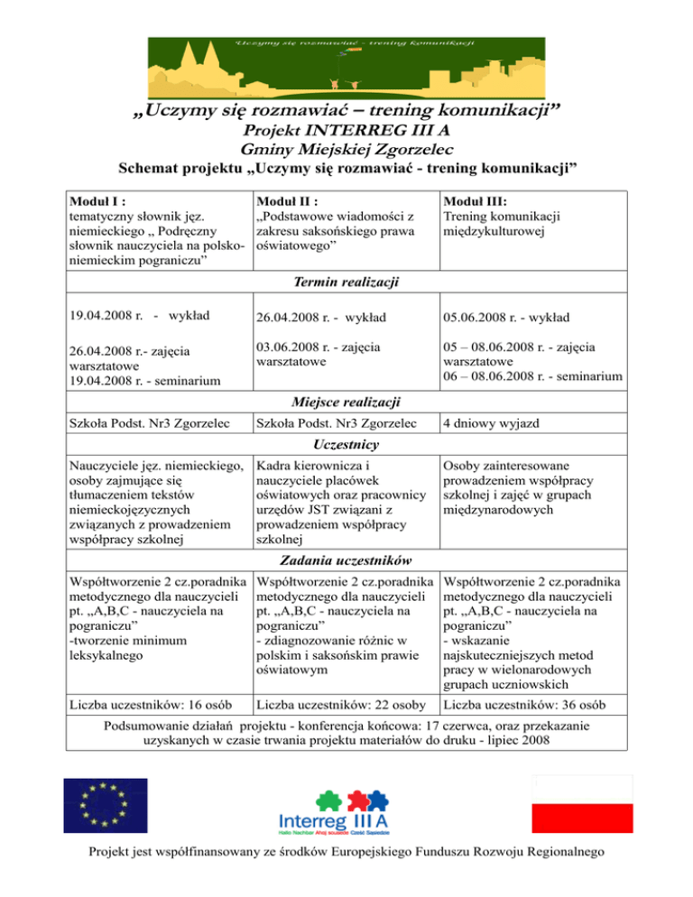 „Uczymy się rozmawiać – trening komunikacji” Projekt INTERREG III A Gminy Miejskiej Zgorzelec Schemat projektu „Uczymy się rozmawiać - trening komunikacji” Moduł I : tematyczny słownik jęz. niemieckiego „ Podręczny słownik nauczyciela na polskoniemieckim pograniczu” Moduł II : „Podstawowe wiadomości z zakresu saksońskiego prawa oświatowego” Moduł III: Trening komunikacji międzykulturowej Termin realizacji 19.04.2008 r. - wykład 26.04.2008 r. - wykład 05.06.2008 r. - wykład 26.04.2008 r.- zajęcia warsztatowe 19.04.2008 r. - seminarium 03.06.2008 r. - zajęcia warsztatowe 05 – 08.06.2008 r. - zajęcia warsztatowe 06 – 08.06.2008 r. - seminarium Miejsce realizacji Szkoła Podst. Nr3 Zgorzelec Szkoła Podst. Nr3 Zgorzelec 4 dniowy wyjazd Uczestnicy Nauczyciele jęz. niemieckiego, osoby zajmujące się tłumaczeniem tekstów niemieckojęzycznych związanych z prowadzeniem współpracy szkolnej Kadra kierownicza i nauczyciele placówek oświatowych oraz pracownicy urzędów JST związani z prowadzeniem współpracy szkolnej Osoby zainteresowane prowadzeniem współpracy szkolnej i zajęć w grupach międzynarodowych Zadania uczestników Współtworzenie 2 cz.poradnika metodycznego dla nauczycieli pt. „A,B,C - nauczyciela na pograniczu” -tworzenie minimum leksykalnego Współtworzenie 2 cz.poradnika metodycznego dla nauczycieli pt. „A,B,C - nauczyciela na pograniczu” - zdiagnozowanie różnic w polskim i saksońskim prawie oświatowym Współtworzenie 2 cz.poradnika metodycznego dla nauczycieli pt. „A,B,C - nauczyciela na pograniczu” - wskazanie najskuteczniejszych metod pracy w wielonarodowych grupach uczniowskich Liczba uczestników: 16 osób Liczba uczestników: 22 osoby Liczba uczestników: 36 osób Podsumowanie działań projektu - konferencja końcowa: 17 czerwca, oraz przekazanie uzyskanych w czasie trwania projektu materiałów do druku - lipiec 2008 Projekt jest współfinansowany ze środków Europejskiego Funduszu Rozwoju Regionalnego