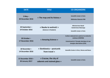 DATE TITLE 3 May – 30 December 2016 « The map and its history » 20 September – 19 October 2016 « Nauka to wolność » (Science is freedom) CO-ORGANIZERS Scientific Center in Paris Biblioteka Gdanska PAN Ministerstwo Nauki i Szkolnictwa Wyższego Scientific Center in Paris Institut national de la santé et la recherche médicale (INSERM) 20 October – 17 November 2016 « Amazing Science » 18 November – 14 December 2016 « Sienkiewicz – postcards from travel » Scientific Center in Paris, Vienna and Rome 15 December 2016 – 30 January 2017 « Cracow, the city of cabarets and stained glass » Scientific Center in Paris Commissariat à l’énergie atomique et aux énergies alternatives (CEA)
