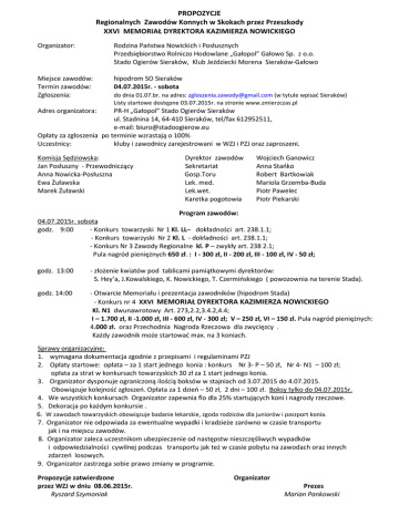PROPOZYCJE Regionalnych Zawodów Konnych w Skokach przez Przeszkody XXVI MEMORIAŁ DYREKTORA KAZIMIERZA NOWICKIEGO Organizator: Rodzina Państwa Nowickich i Posłusznych Przedsiębiorstwo Rolniczo Hodowlane „Gałopol” Gałowo Sp. z o.o. Stado Ogierów Sieraków, Klub Jeździecki Morena Sieraków-Gałowo Miejsce zawodów: Termin zawodów: Zgłoszenia: hipodrom SO Sieraków 04.07.2015r. - sobota do dnia 01.07.br. na adres: [email protected] (w tytule wpisać Sieraków) Listy startowe dostępne 03.07.2015r. na stronie www.zmierzczas.pl Adres organizatora: PR-H „Gałopol” Stado Ogierów Sieraków ul. Stadnina 14, 64-410 Sieraków, tel/fax 612952511, e-mail: [email protected] Opłaty za zgłoszenia po terminie wzrastają o 100% Uczestnicy: kluby i zawodnicy zarejestrowani w WZJ i PZJ oraz zaproszeni. Komisja Sędziowska: Jan Posłuszny - Przewodniczący Anna Nowicka-Posłuszna Ewa Żuławska Marek Żuławski Dyrektor zawodów Sekretariat Gosp.Toru Lek. med. Lek.wet. Karetka pogotowia Wojciech Ganowicz Anna Stańko Robert Bartkowiak Mariola Grzemba-Buda Piotr Pawelec Piotr Piekarski Program zawodów: 04.07.2015r. sobota godz. 9:00 - Konkurs towarzyski Nr 1 Kl. LL– dokładności art. 238.1.1; - Konkurs towarzyski Nr 2 Kl. L - dokładności art. 238.1.1; - Konkurs Nr 3 Zawody Regionalne kl. P – zwykły art. 238 2.1; Pula nagród pieniężnych 650 zł. : I - 300 zł, II - 200 zł, III - 100 zł, IV - 50 zł; godz. 13:00 - złożenie kwiatów pod tablicami pamiątkowymi dyrektorów: S. Hey’a, J.Kowalskiego, K. Nowickiego, T. Czermińskiego ( powozownia na terenie Stada). godz. 14:00 - Otwarcie Memoriału i prezentacja zawodników (hipodrom Stada) - Konkurs nr 4 XXVI MEMORIAŁ DYREKTORA KAZIMIERZA NOWICKIEGO Kl. N1 dwunawrotowy Art. 273,2.2,3.4.2,4.4; I – 1.700 zł, II -1.000 zł, III - 600 zł, IV - 300 zł; V – 250 zł, VI – 150 zl. Pula nagród pieniężnych: 4.000 zł. oraz Przechodnia Nagroda Rzeczowa dla zwycięzcy . Każdy zawodnik może startować max. na 3 koniach. Sprawy organizacyjne: 1. wymagana dokumentacja zgodnie z przepisami i regulaminami PZJ 2. Opłaty startowe: opłata – za 1 start jednego konia : konkurs Nr 3- P – 50 zł, Nr 4- N1 – 100 zł; opłata za strat w konkursach towarzyskich 30 zł za 1 start jednego konia. 3. Organizator dysponuje ograniczoną ilością boksów w stajniach od 3.07.2015 do 4.07.2015. Obowiązuje kolejność zgłoszeń. Opłata za 1 dzień – 50 zł, 2 dni – 100 zł. Boksy tylko do 04.07.2015r. 4. We wszystkich konkursach Organizator zapewnia flo dla 25% startujących koni i nagrody rzeczowe. 5. Dekoracja po każdym konkursie . 6. W zawodach towarzyskich obowiązuje badanie lekarskie, zgoda rodziców dla juniorów i paszport konia. 7. Organizator nie odpowiada za ewentualne wypadki i kradzieże zarówno w czasie transportu jak i na miejscu zawodów. 8. Organizator zaleca uczestnikom ubezpieczenie od następstw nieszczęśliwych wypadków i odpowiedzialności cywilnej podczas transportu jak też w czasie pobytu na zawodach oraz innych zdarzeń losowych. 9. Organizator zastrzega sobie prawo zmiany w programie. Propozycje zatwierdzone przez WZJ w dniu 08.06.2015r. Ryszard Szymoniak Organizator Prezes Marian Pankowski